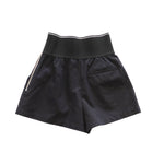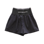Alexander Wang high-waisted mini shorts in black cotton with a wide elastic waistband in black with white logo on the front. Features side slip pockets, a faux slip pocket on the back, and a side zipper closure in silver hardware.