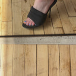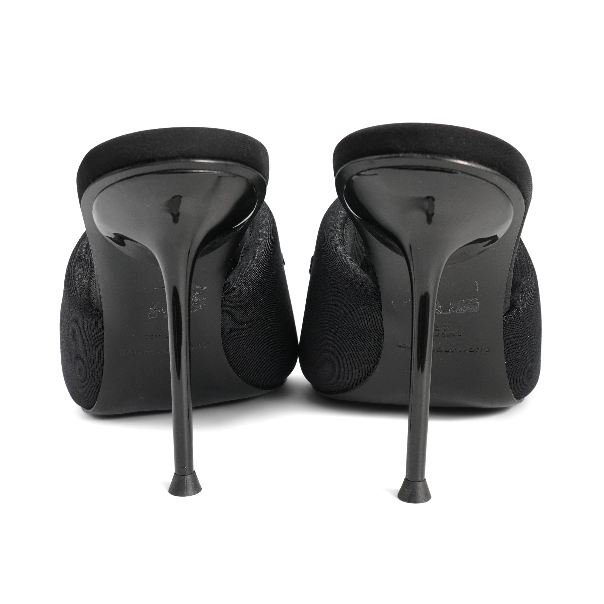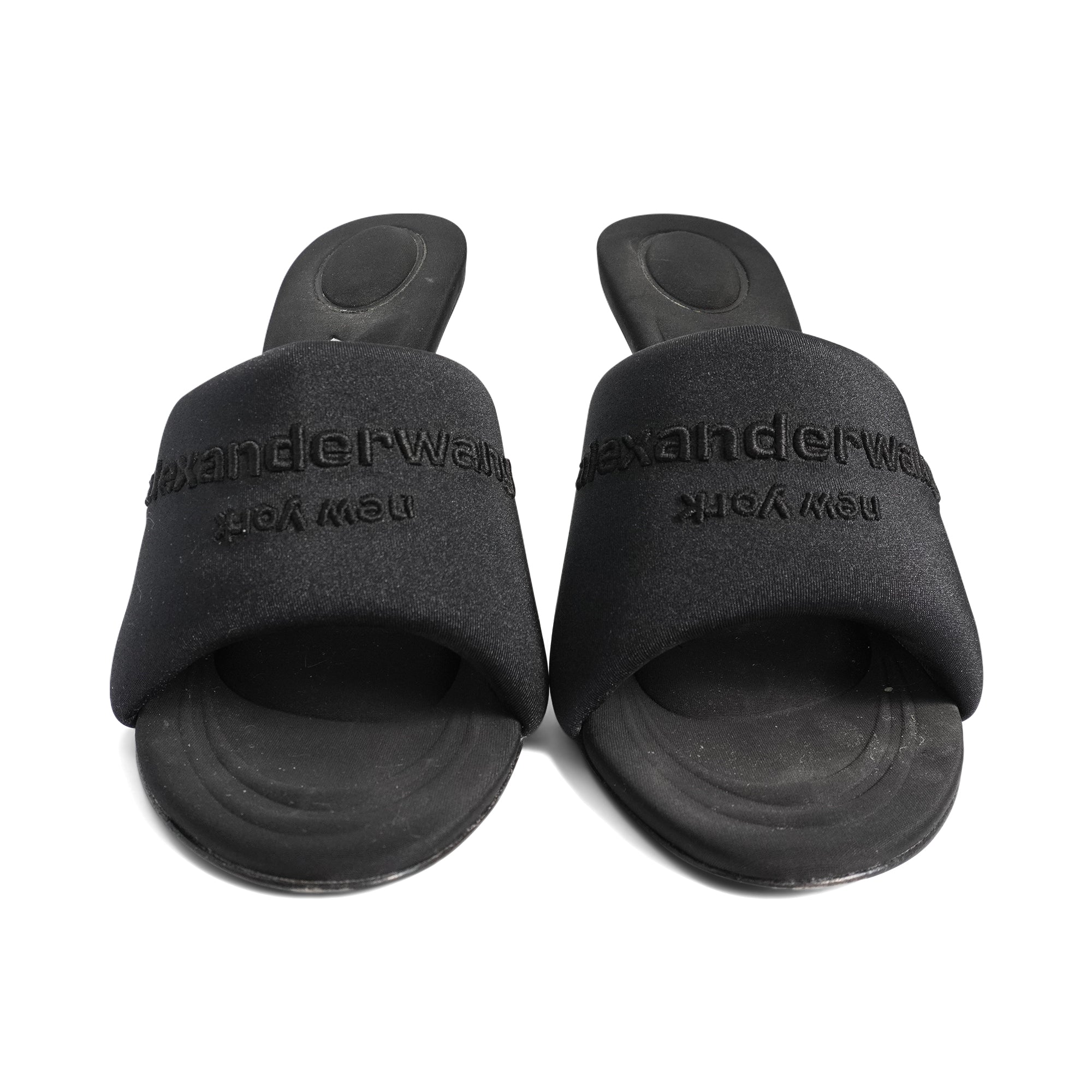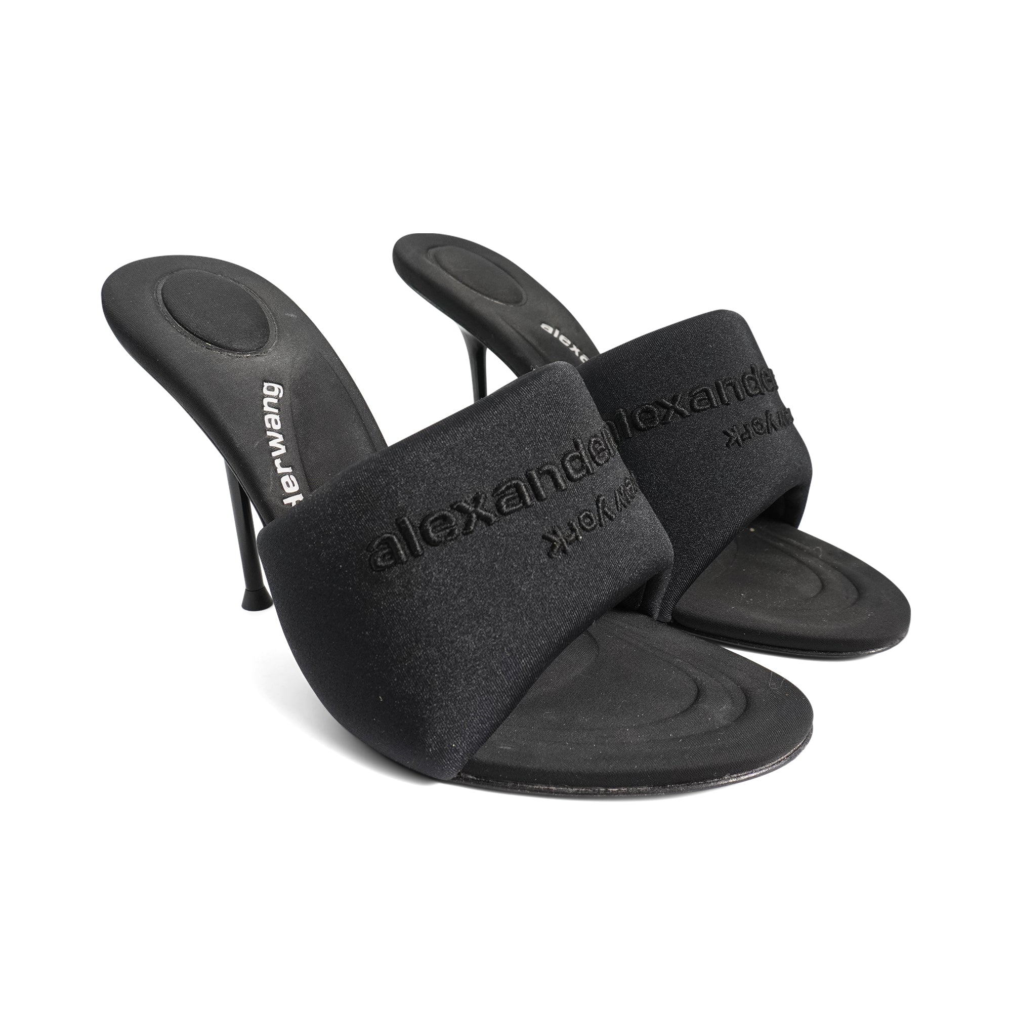Alexander Wang 'Sienna' heeled mules in puffy black satin-neoprene material with tonal logo embroidery. Feature molded padded insoles and stiletto heels.