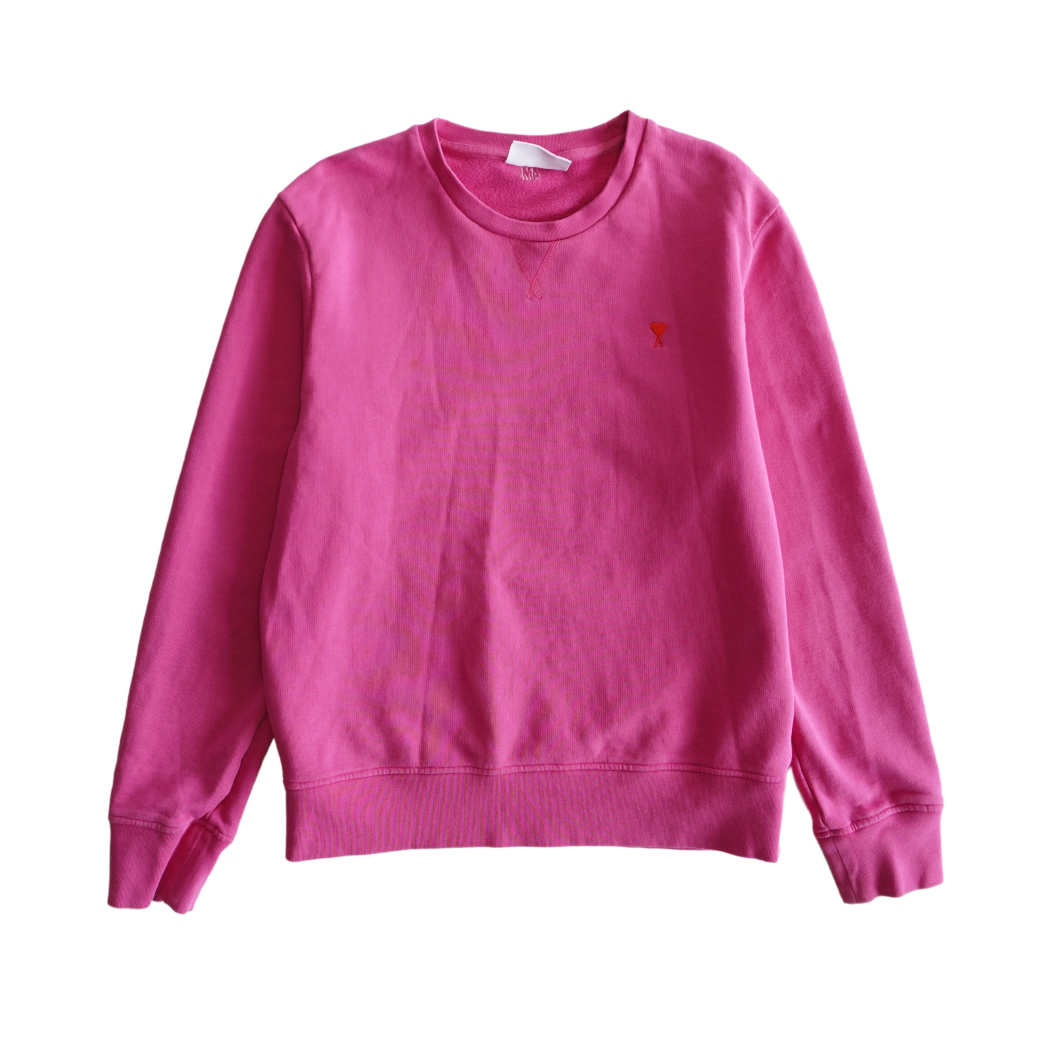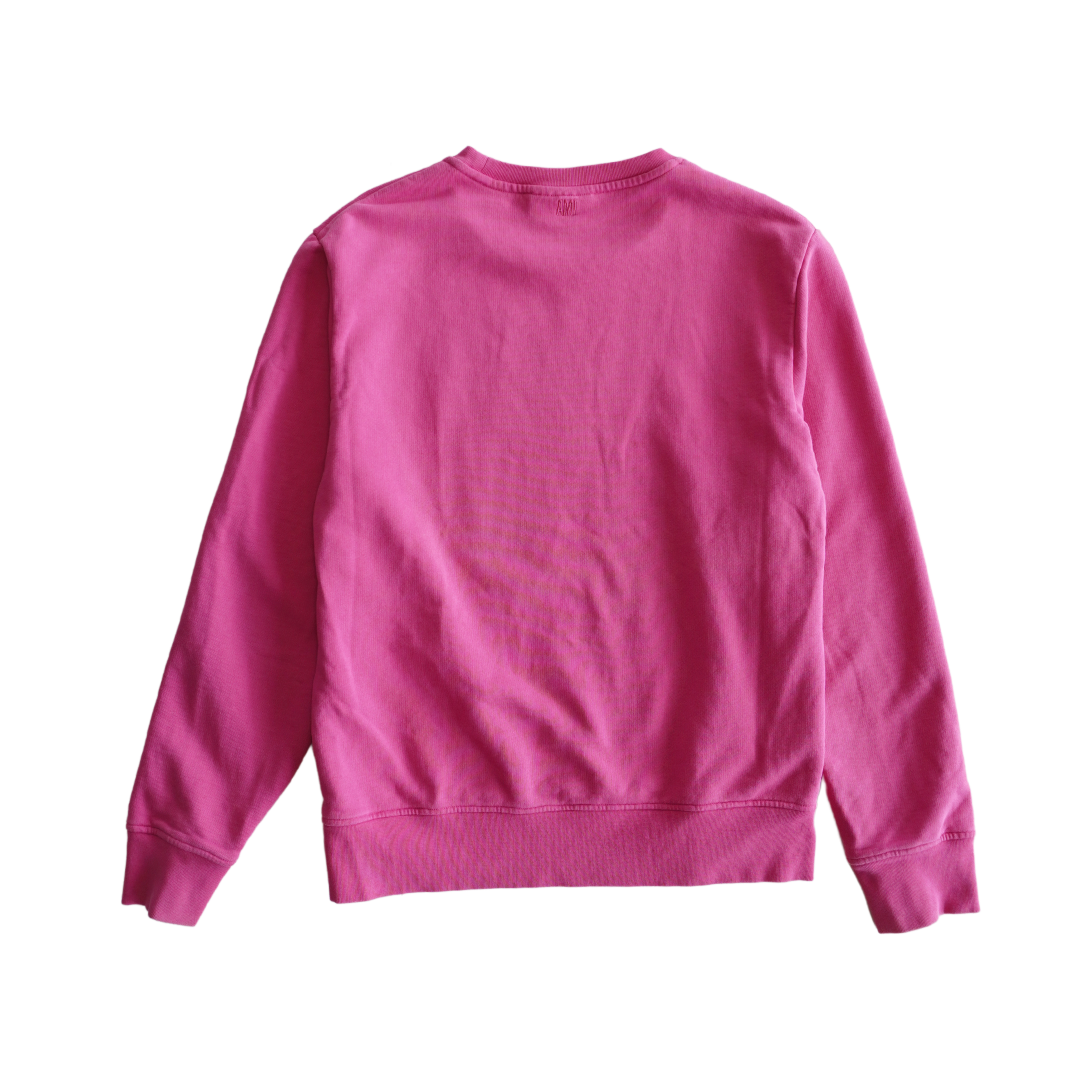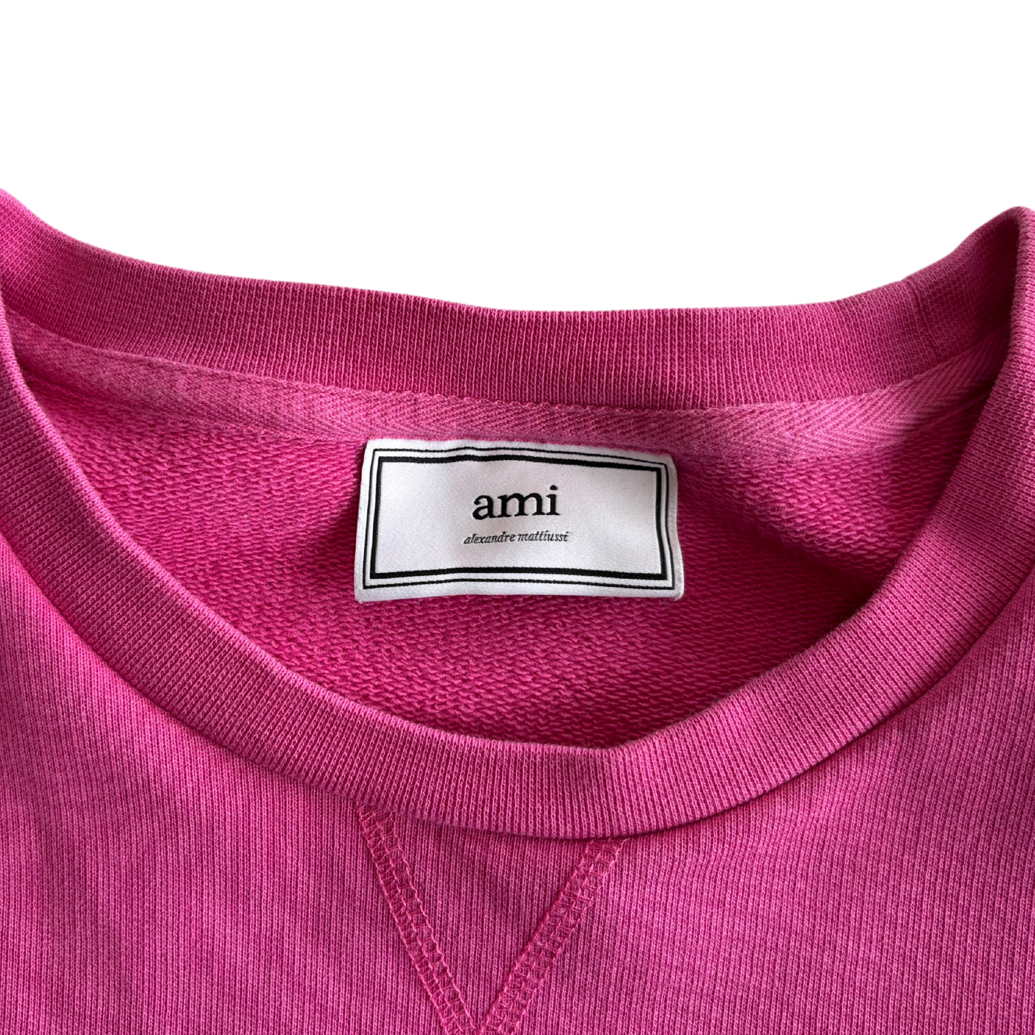Ami crewneck sweatshirt in bright pink cotton with a small red logo embroidered on the chest.