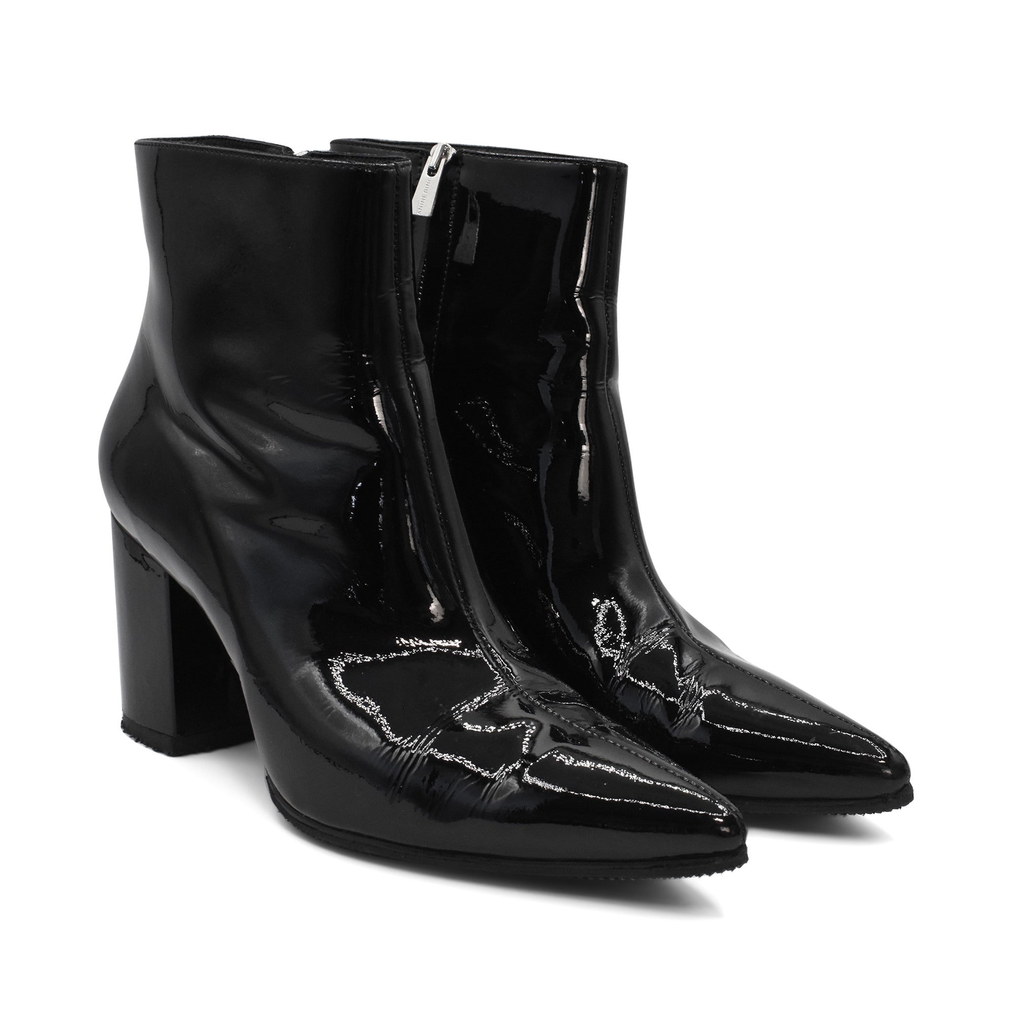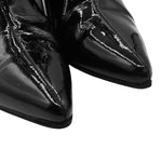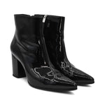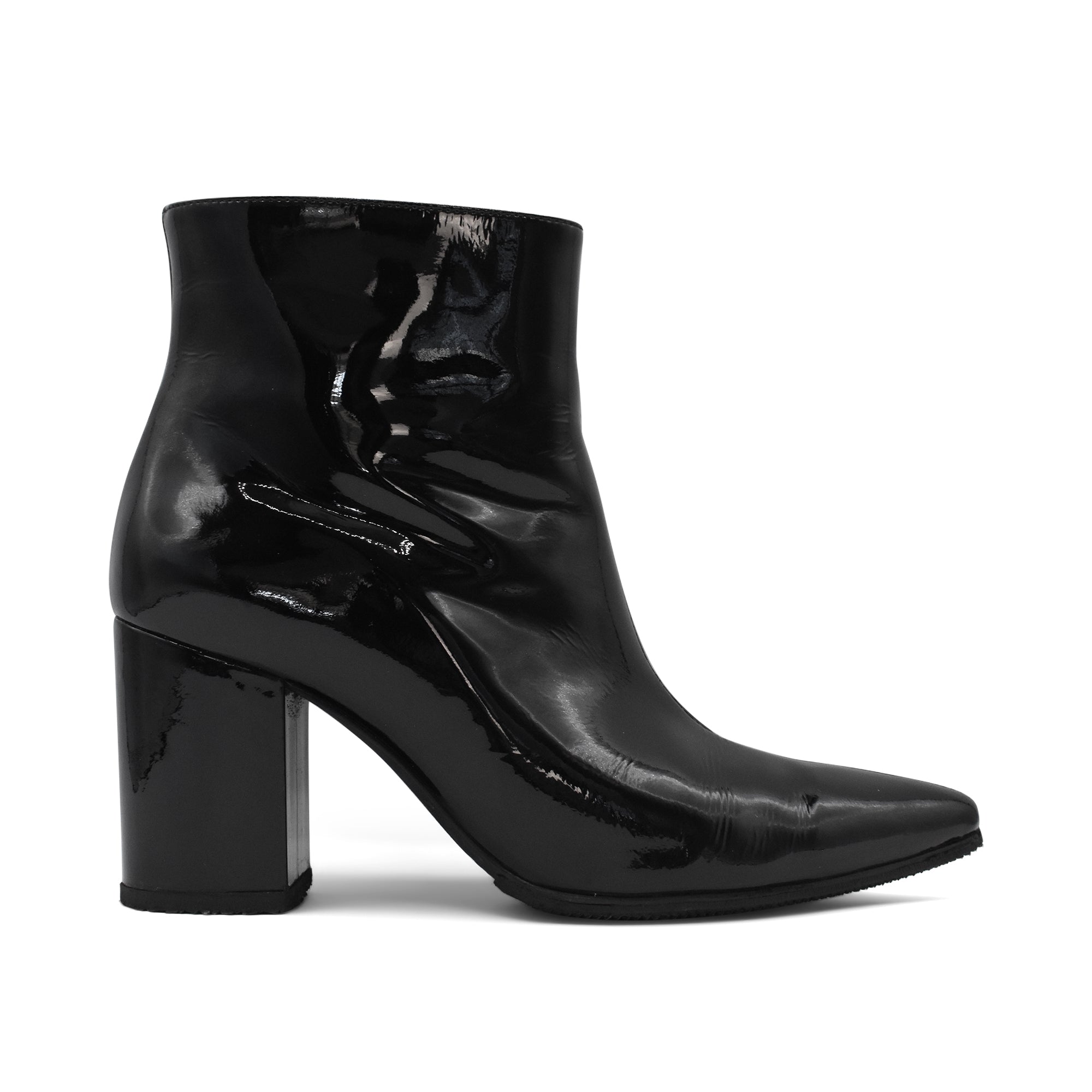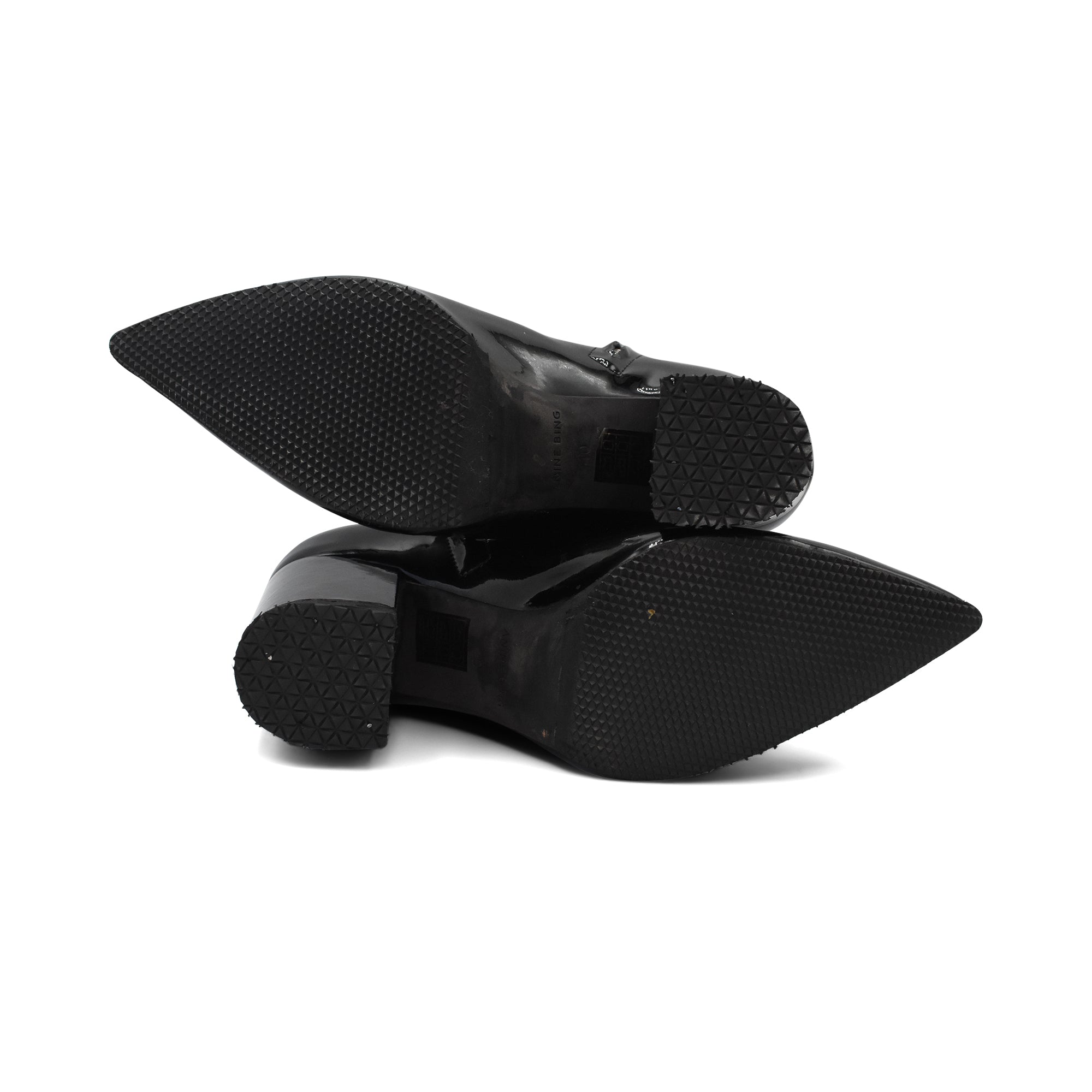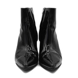 Anine Bing 'Presley' ankle boots in black patent leather with a side-zip opening in silver hardware, a chunky heel, and a pointed toe.
