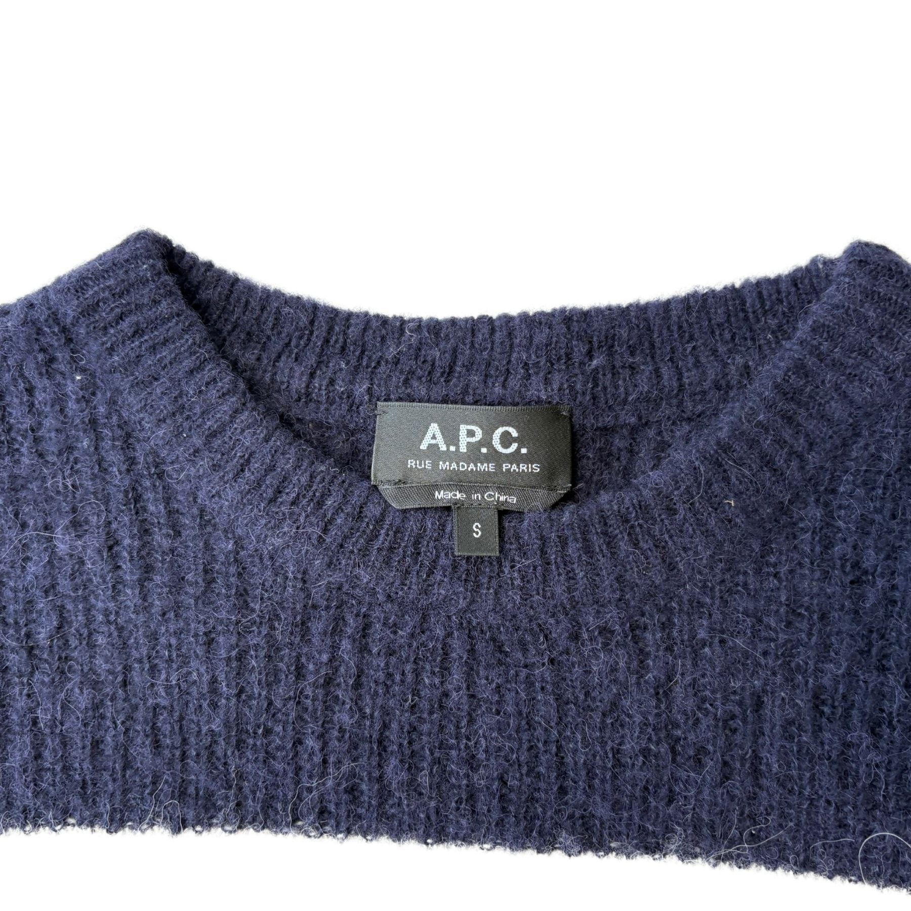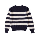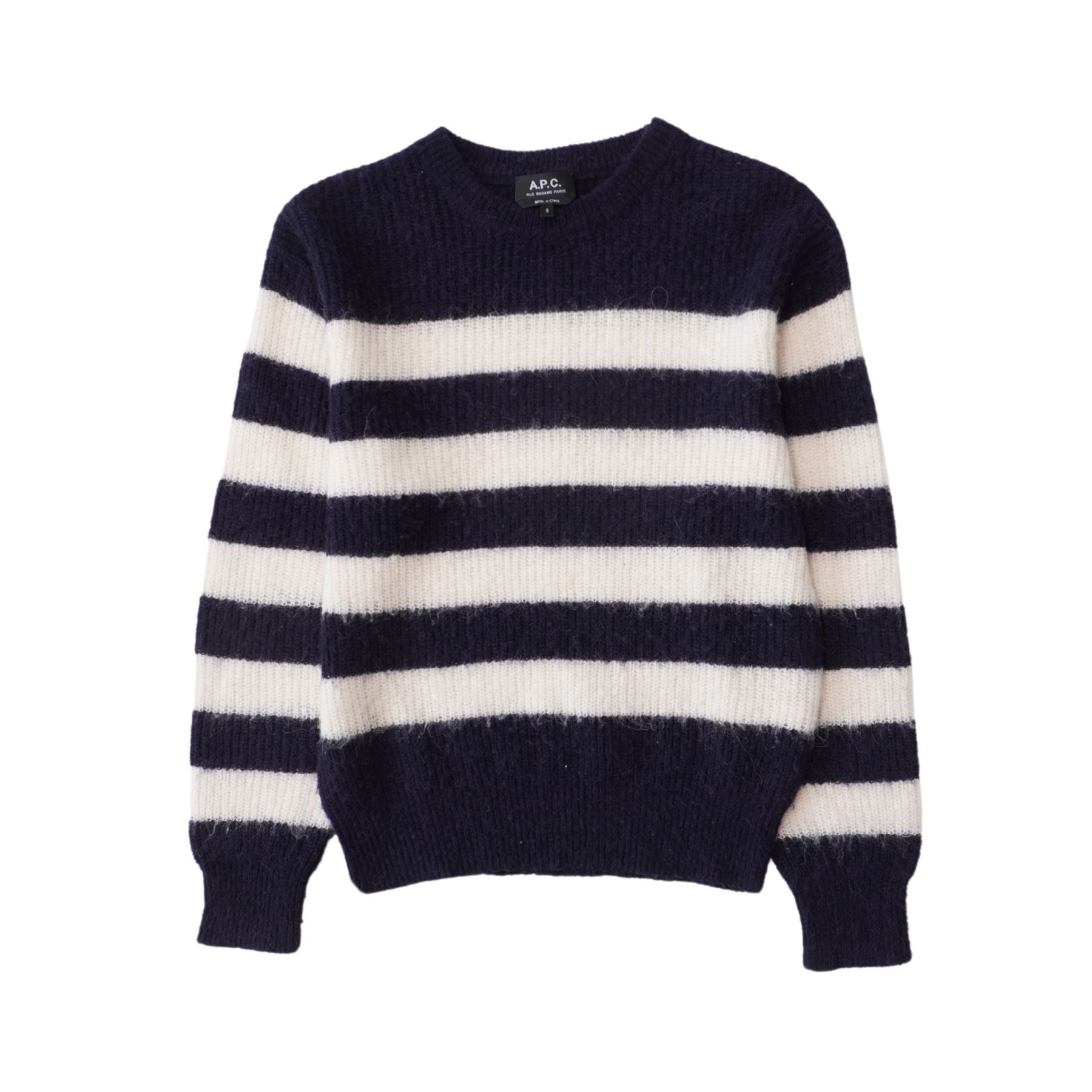 APC 'Lia' long-sleeve knit sweater in navy blue and white striped alpaca wool.