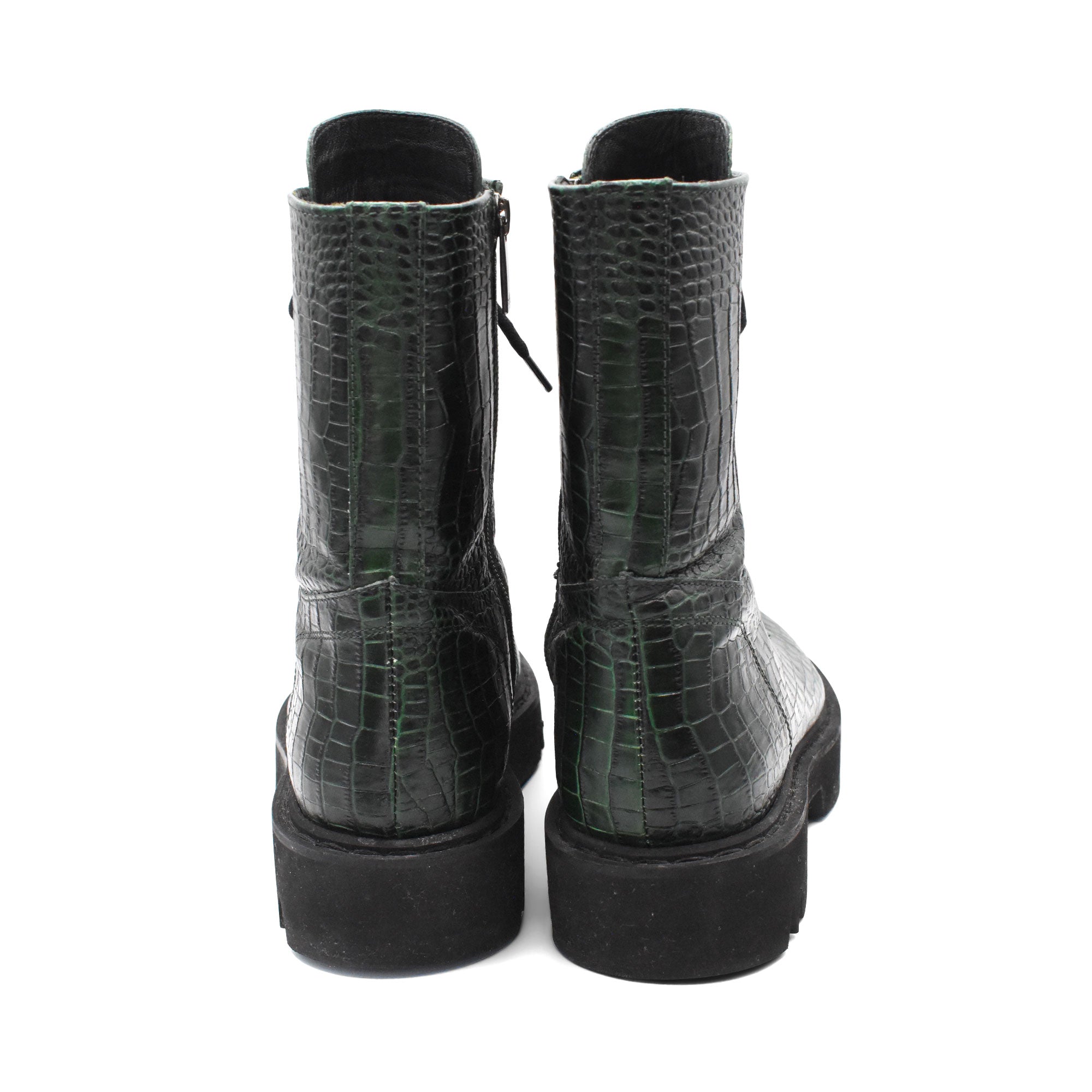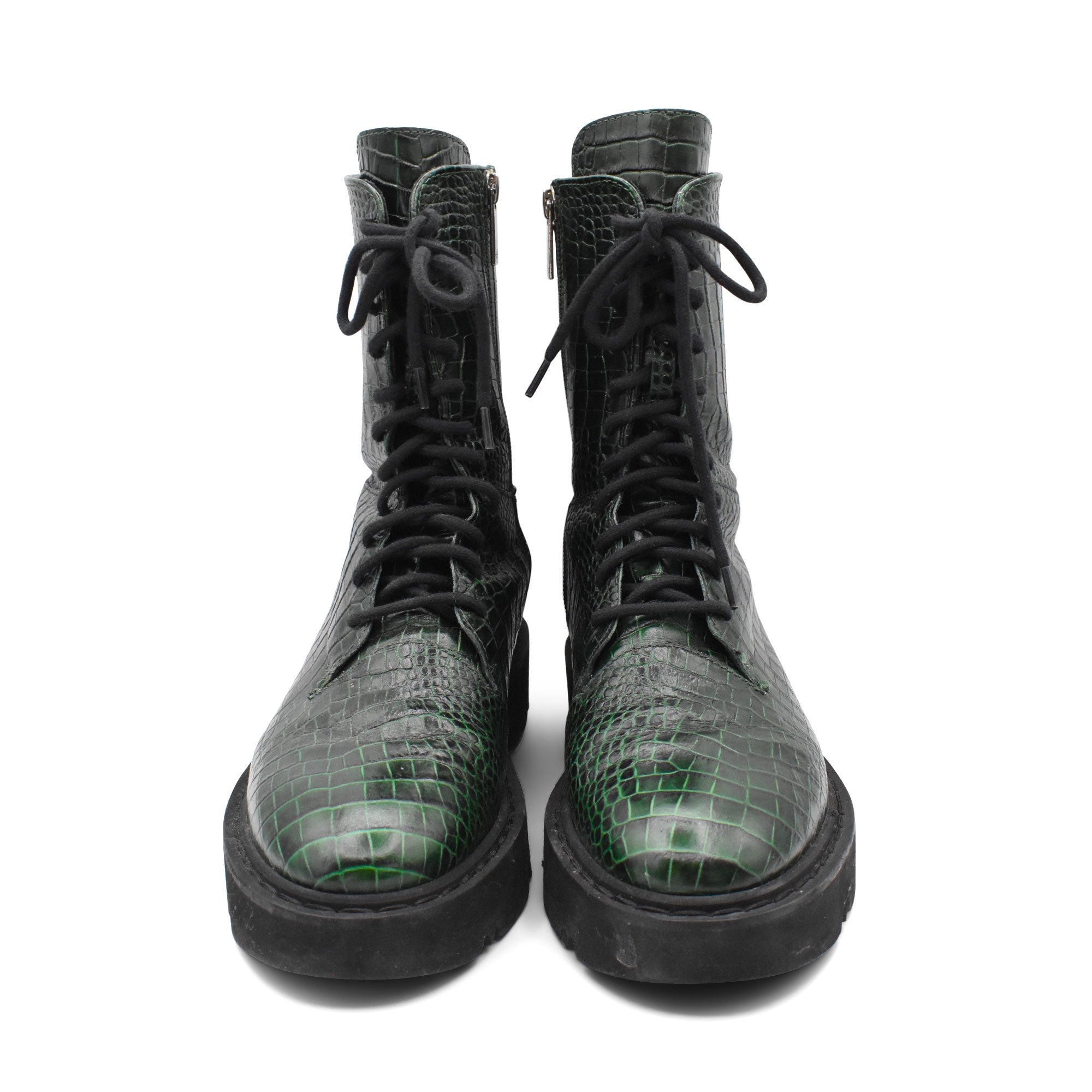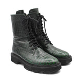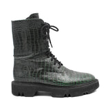 Aquatalia 'Hana' combat boots in dark green croc-embossed leather with a lace up closure, black rubber chunky sole, and a size zip closure in gunmetal hardware.