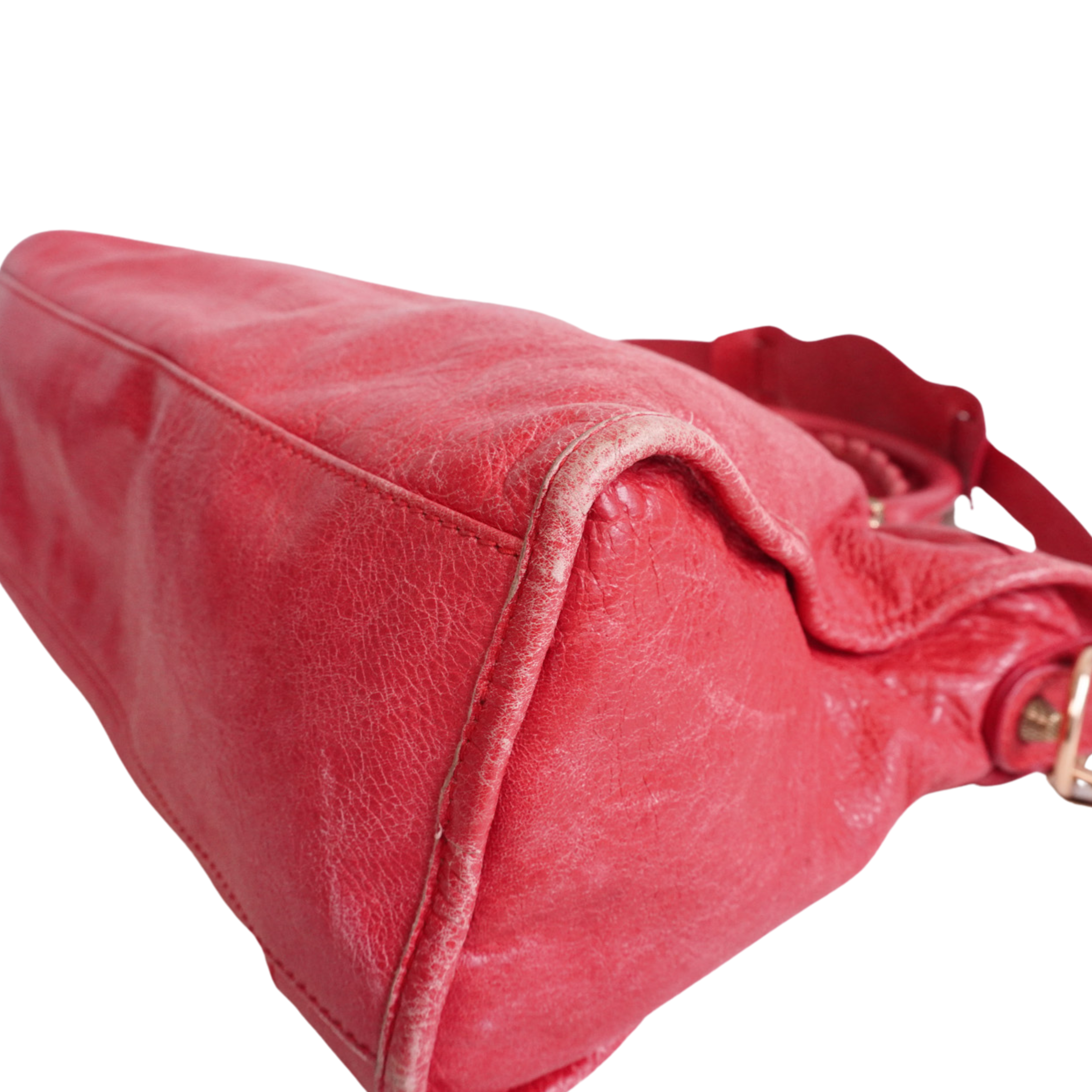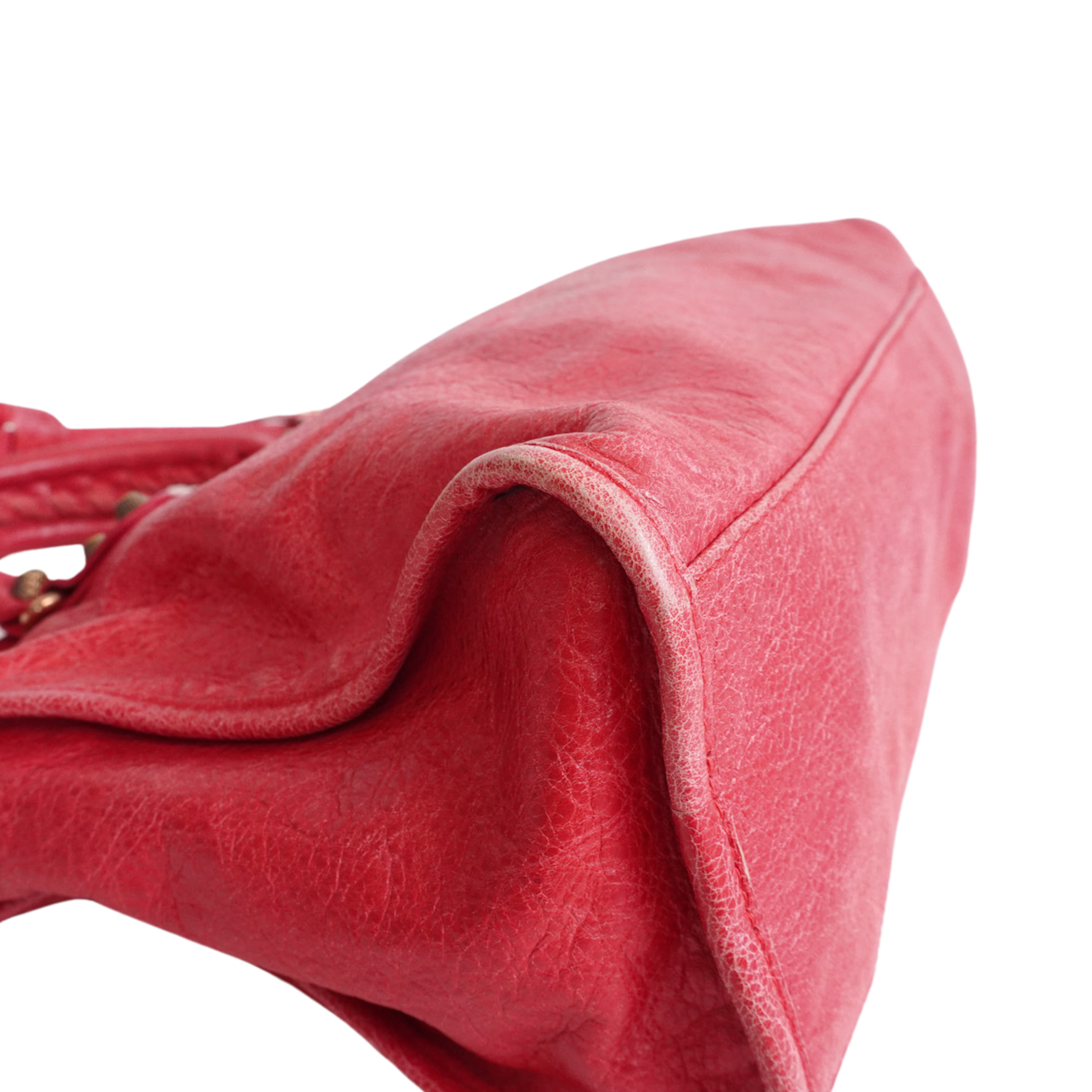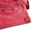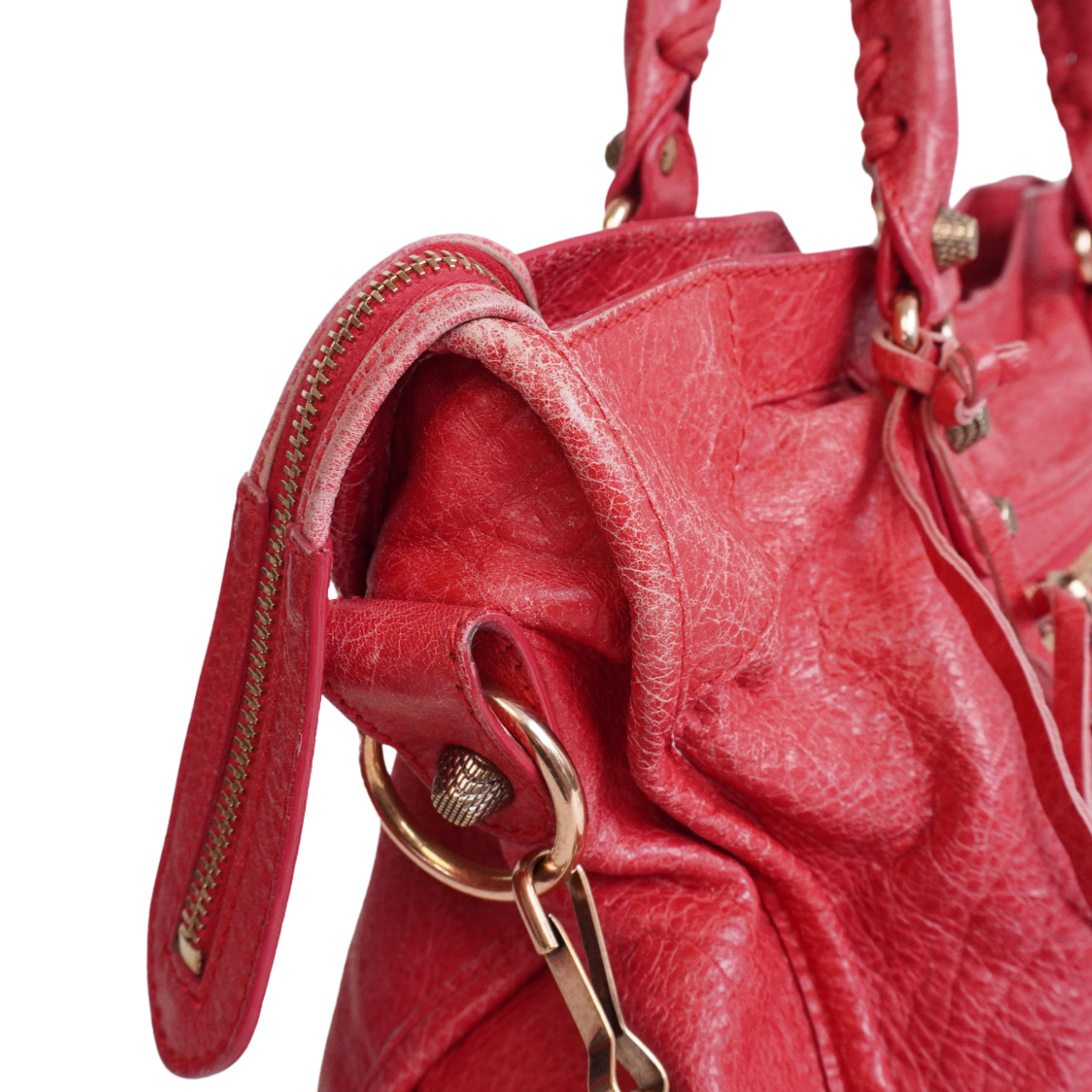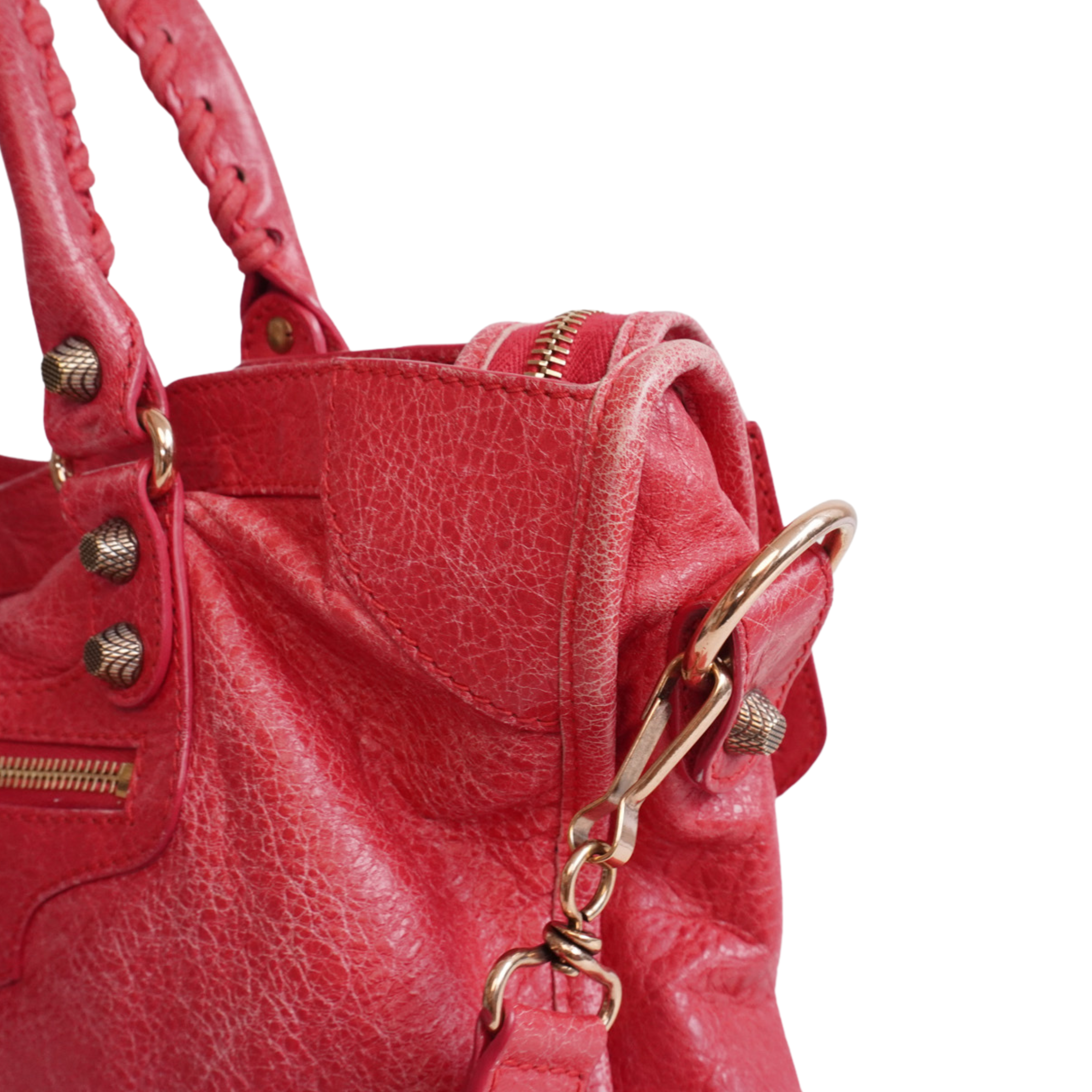 Balenciaga 'City' bag in red-pink leather with dark rose gold stud and buckle hardware, dual rolled top handles with whipstitch detailing, and a removable shoulder strap. Features a two-way zipper opening and a smaller zip pocket on the front. The interior is lined with black fabric and has flat zip and slip pockets.