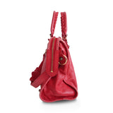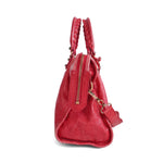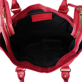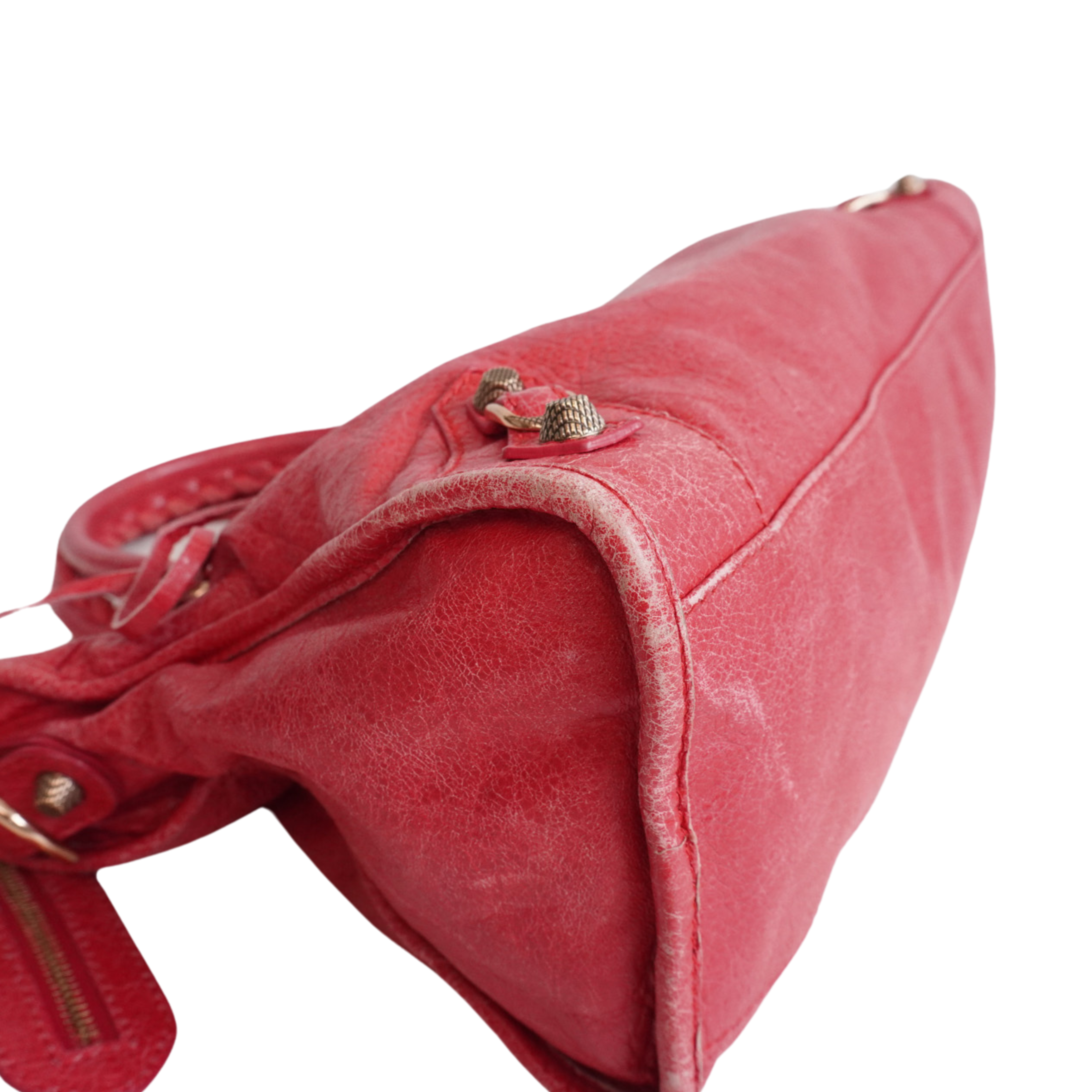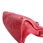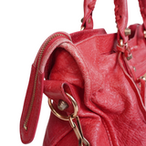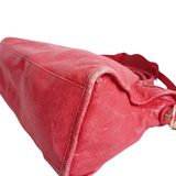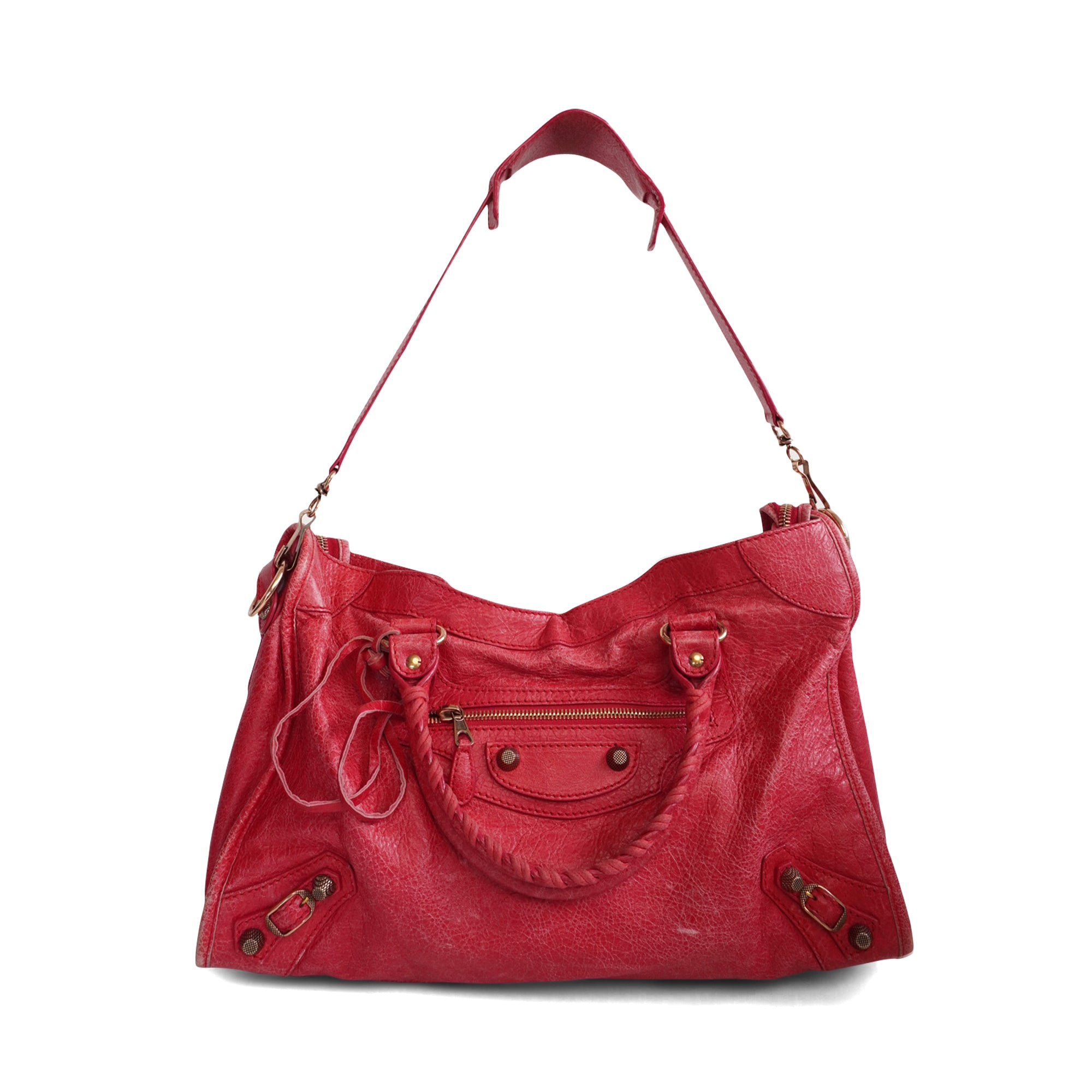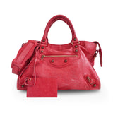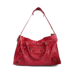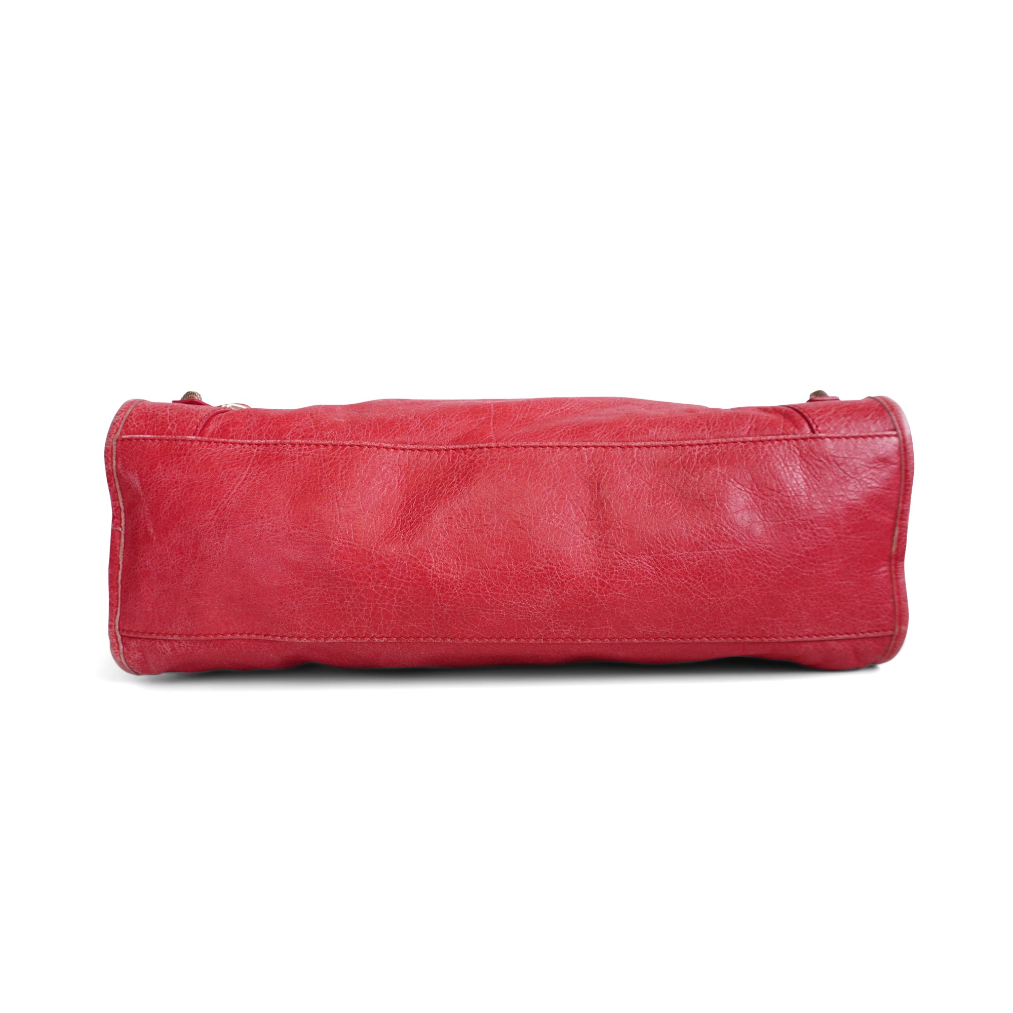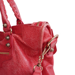 Balenciaga 'City' bag in red-pink leather with dark rose gold stud and buckle hardware, dual rolled top handles with whipstitch detailing, and a removable shoulder strap. Features a two-way zipper opening and a smaller zip pocket on the front. The interior is lined with black fabric and has flat zip and slip pockets.