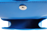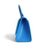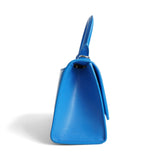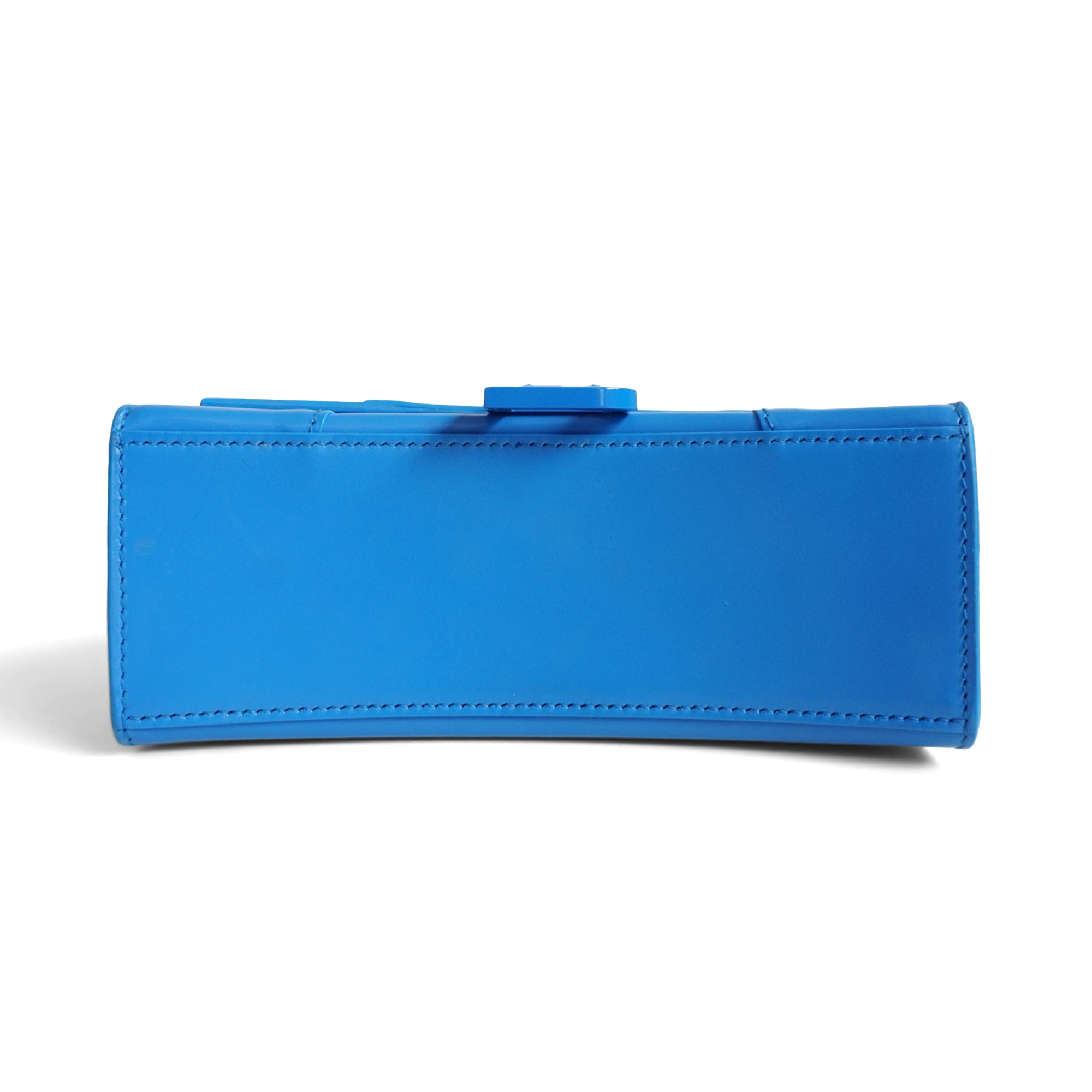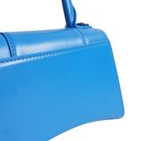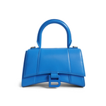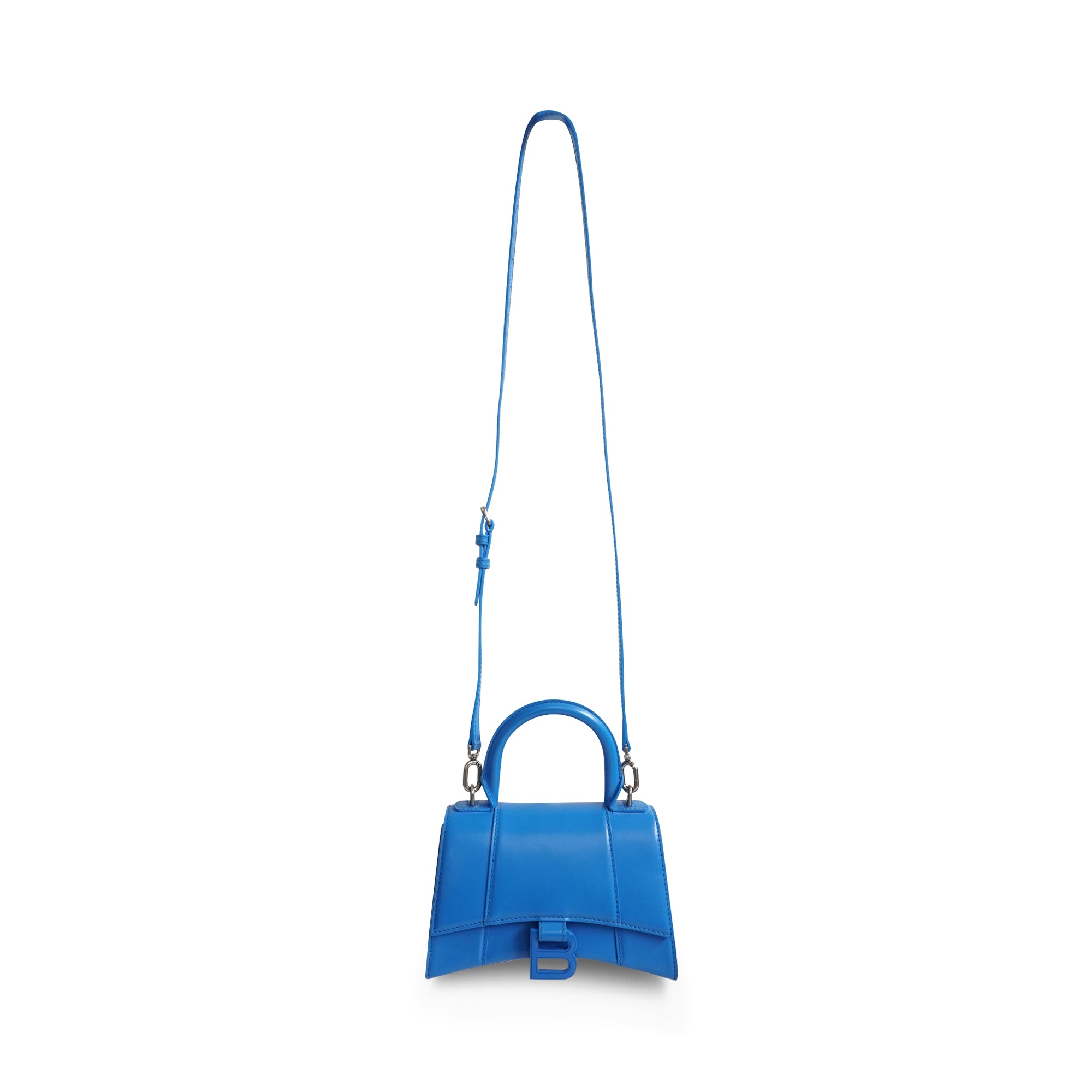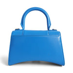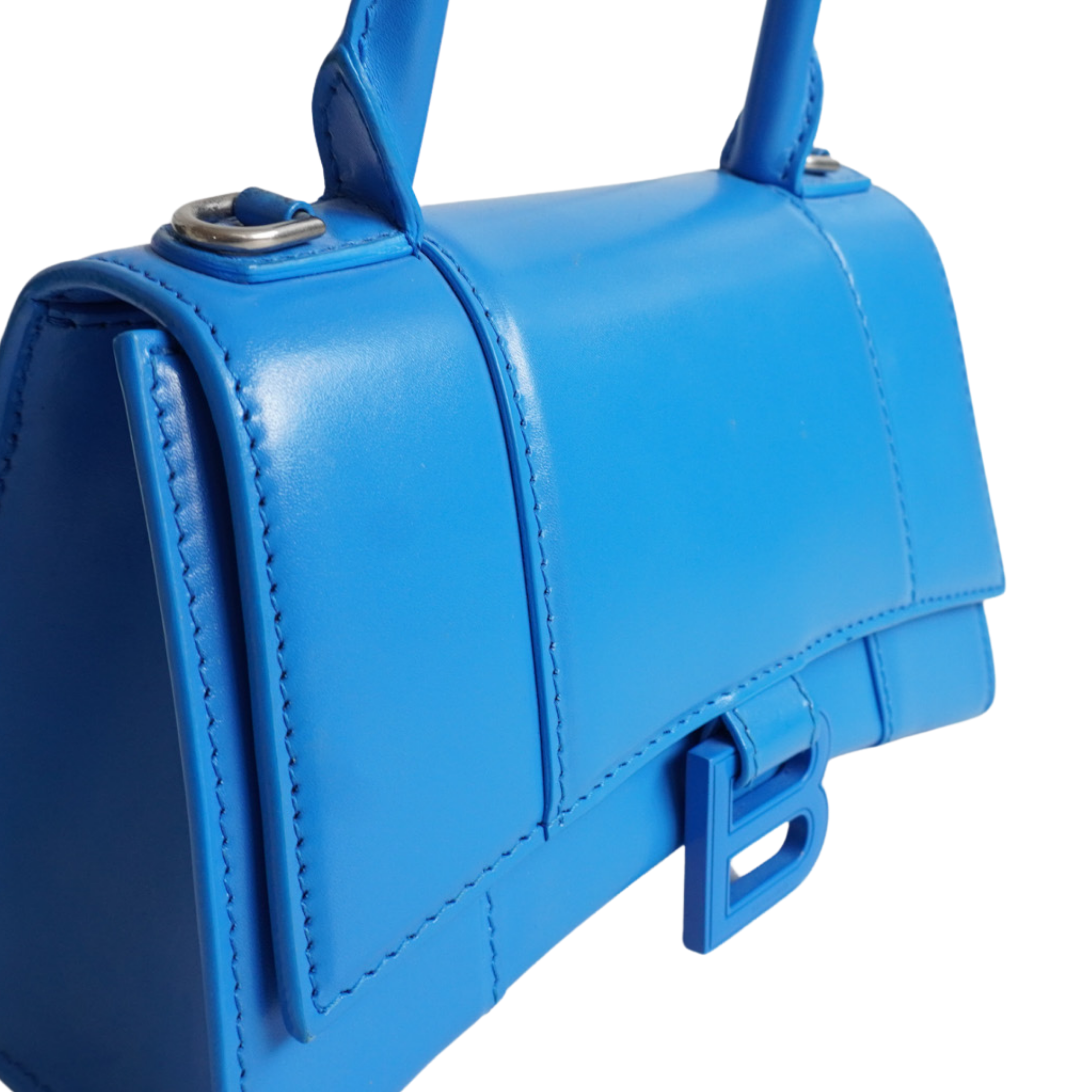 Balenciaga 'Hourglass Mini' handbag in bright blue leather with a tonal 'B' hardware charm on the front, a back slip pocket, a rolled top handle, and a removable crossbody strap with silver buckle hardware. The bag has a top flap opening with a magnetic snap closure, opening to reveal a leather lined interior compartment.