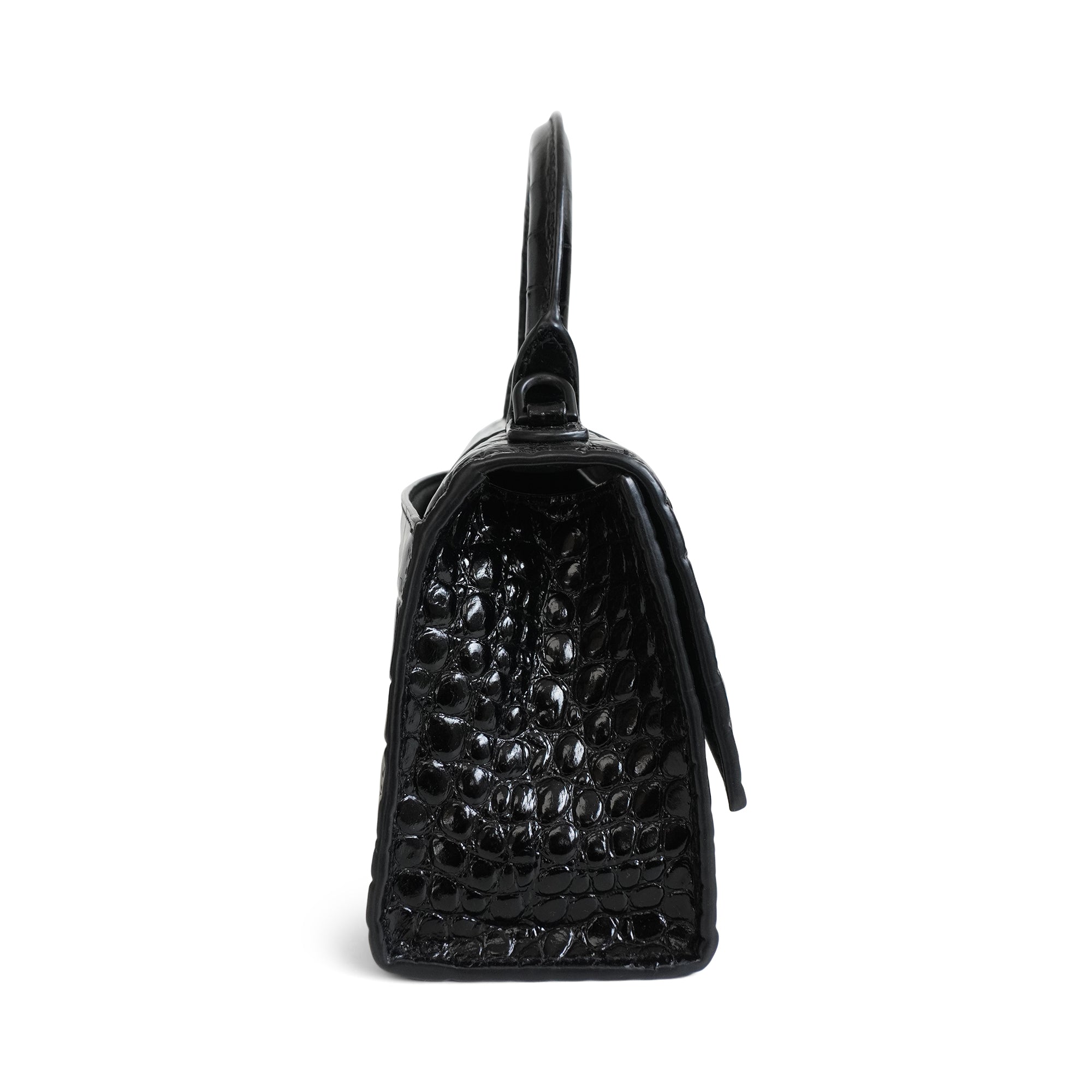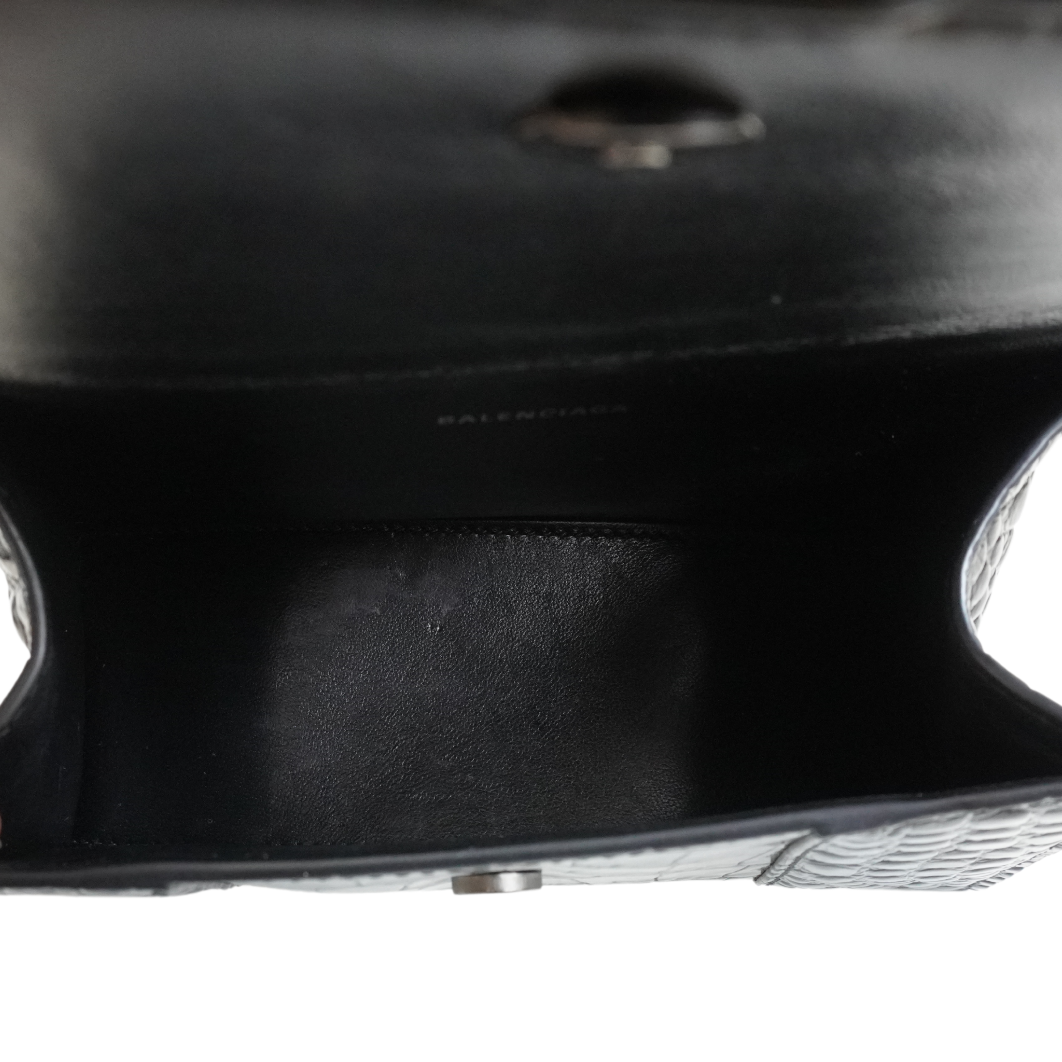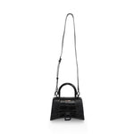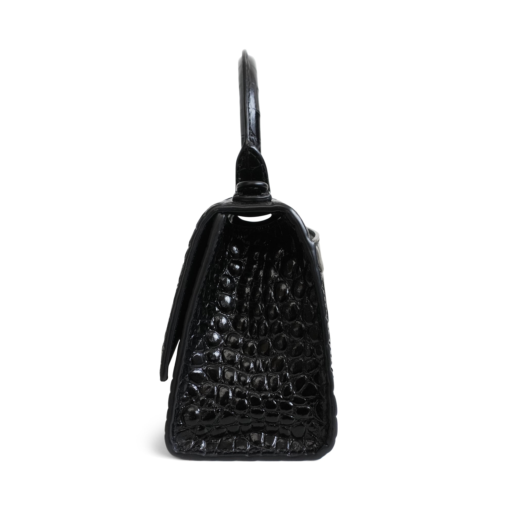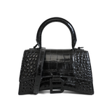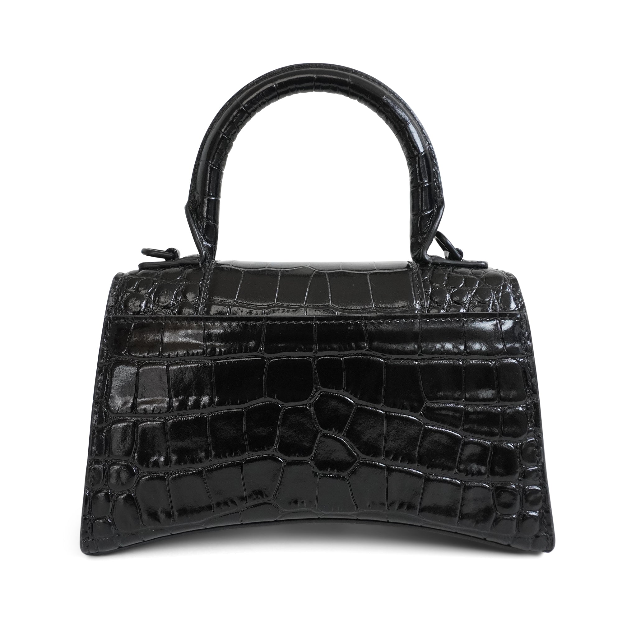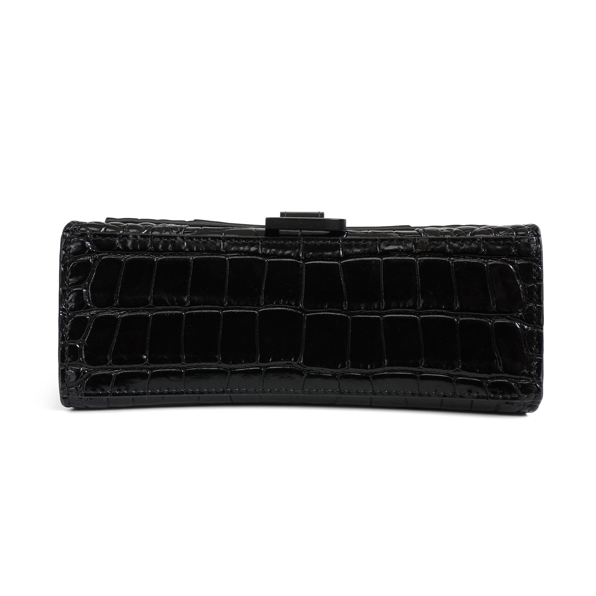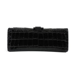 Balenciaga 'Hourglass Mini' handbag in black croc-embossed leather with a tonal 'B' hardware charm on the front, a back slip pocket, a rolled top handle, and a removable crossbody strap with black buckle hardware. The bag has a top flap opening with a magnetic snap closure, opening to reveal a leather lined interior compartment.