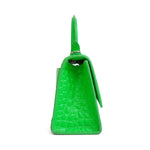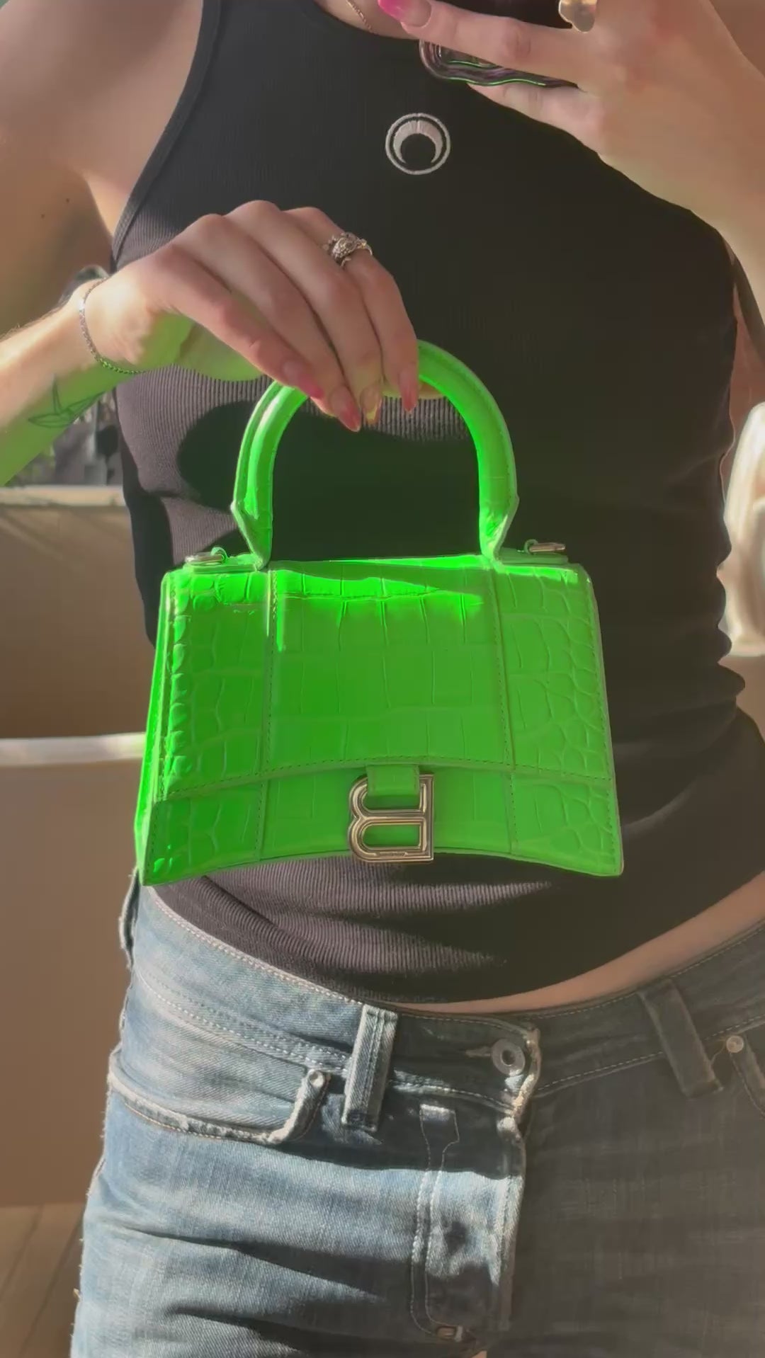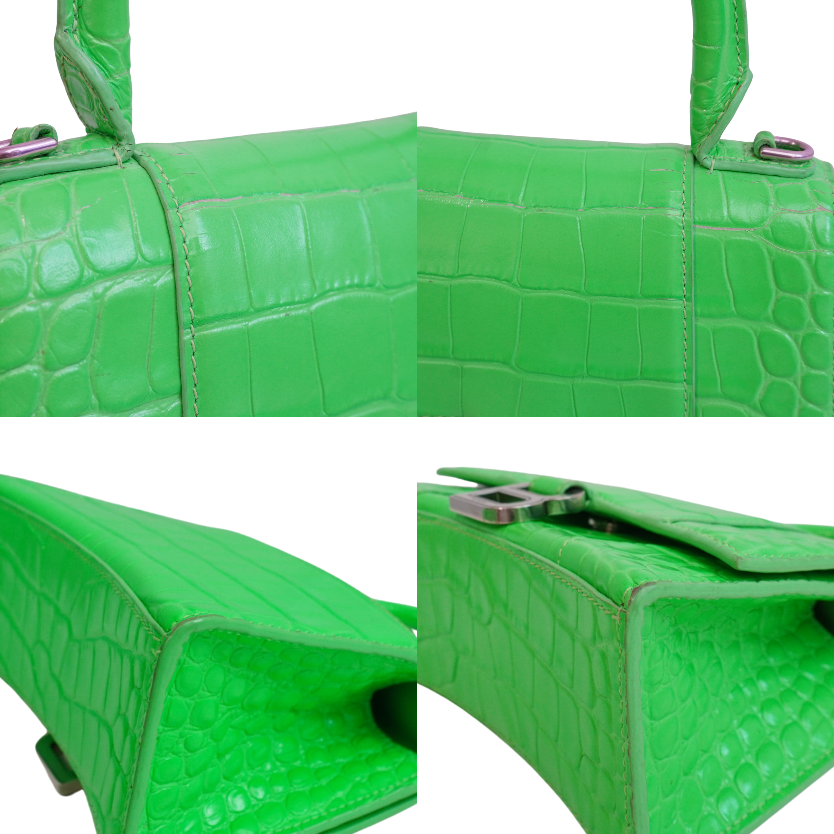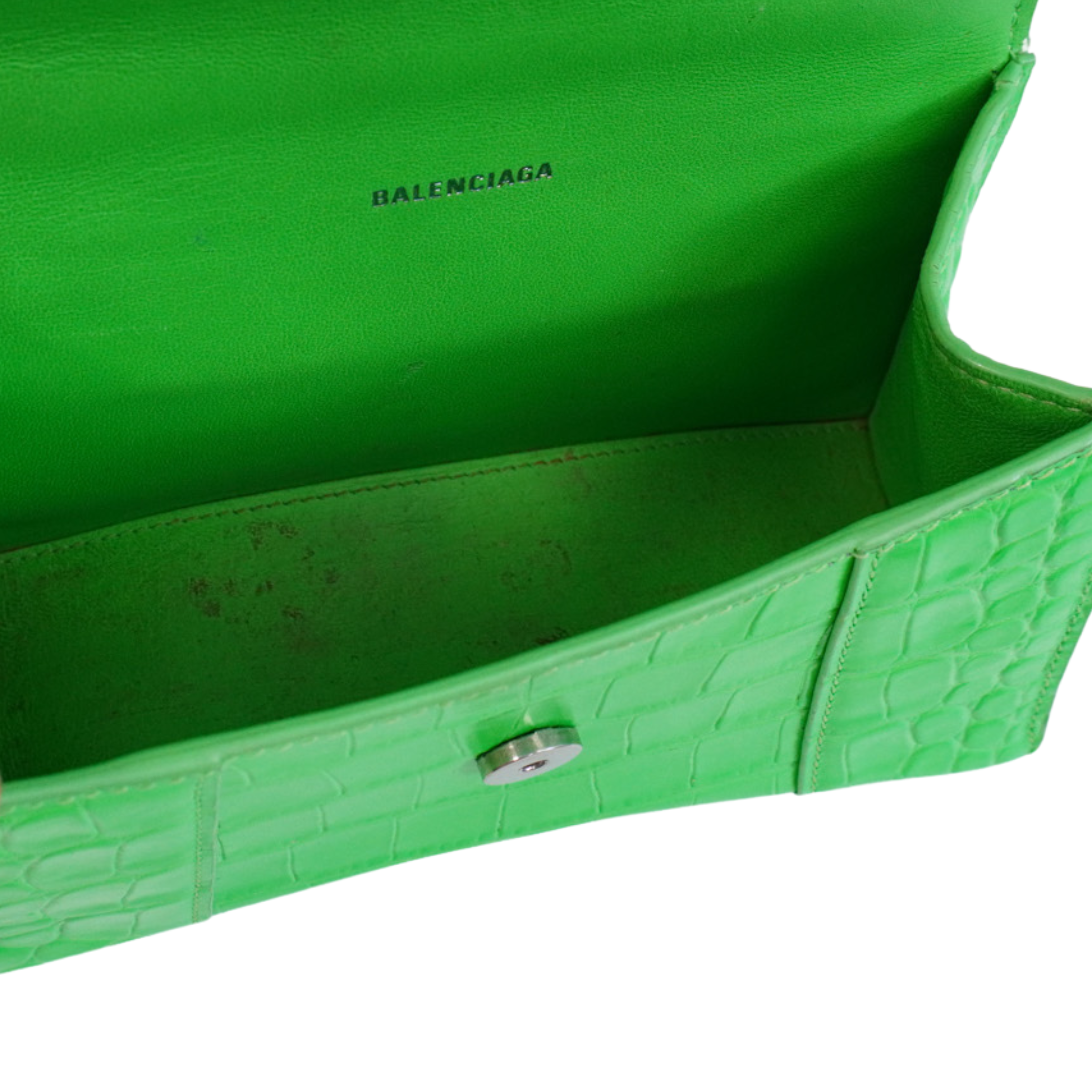 Balenciaga 'Hourglass Mini' handbag in neon green croc embossed leather with top handle, adjustable crossbody strap and slip pocket on the back. Featuring large 'B' logo clasp in silver hardware with magnetic snap closure.