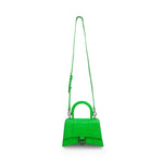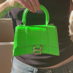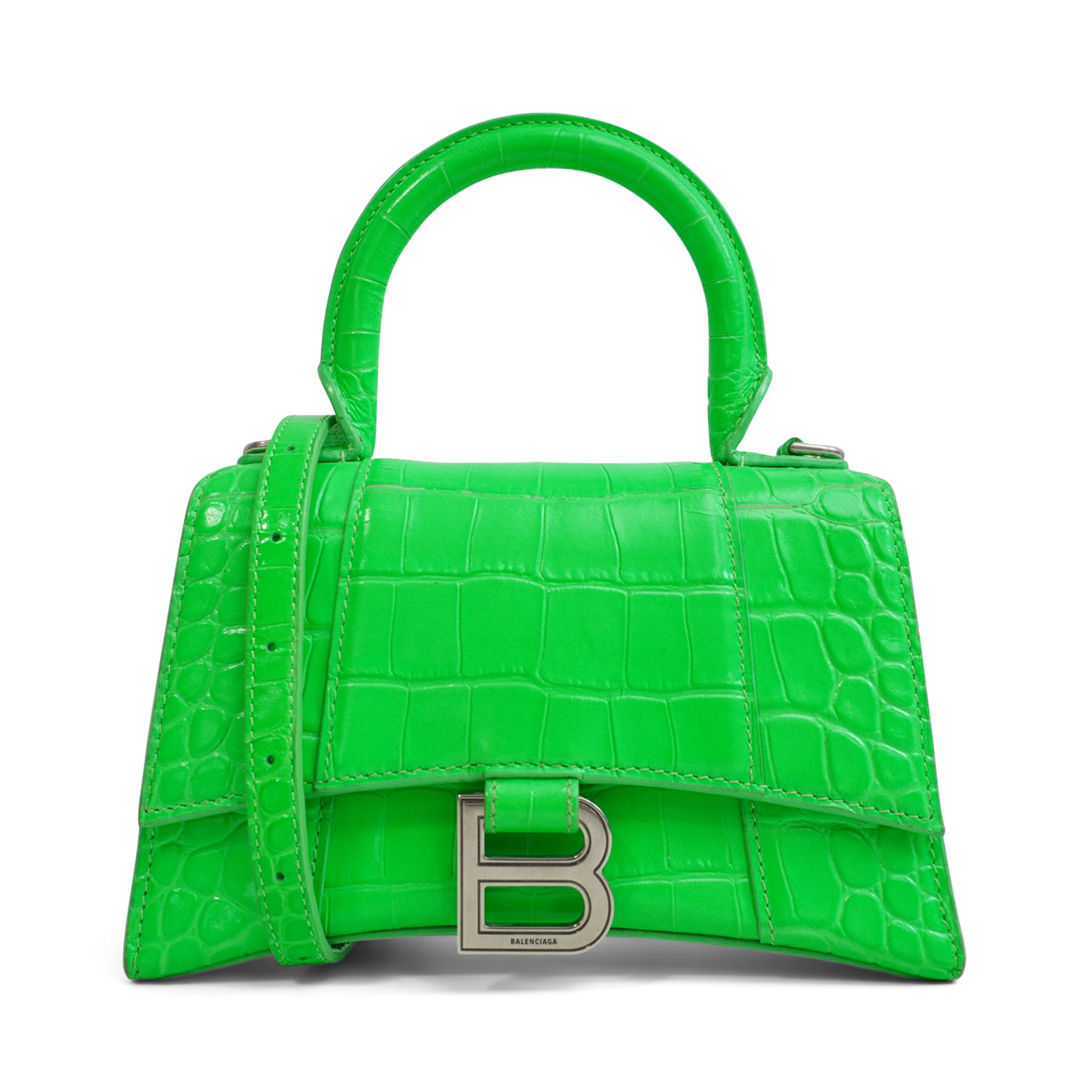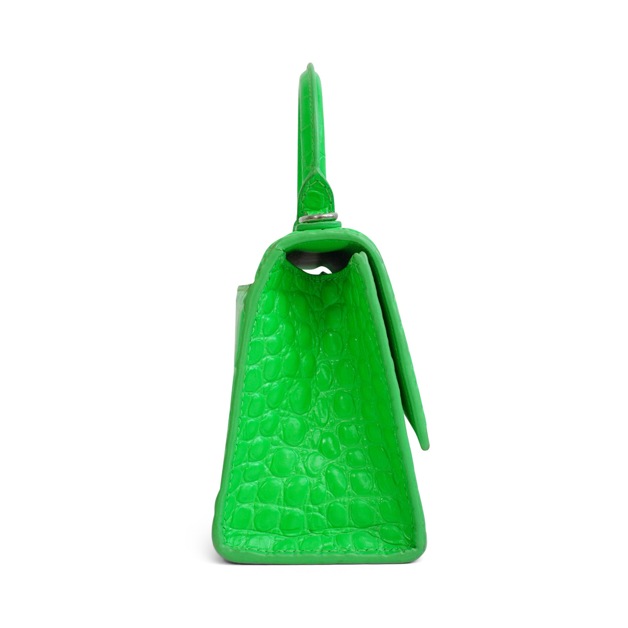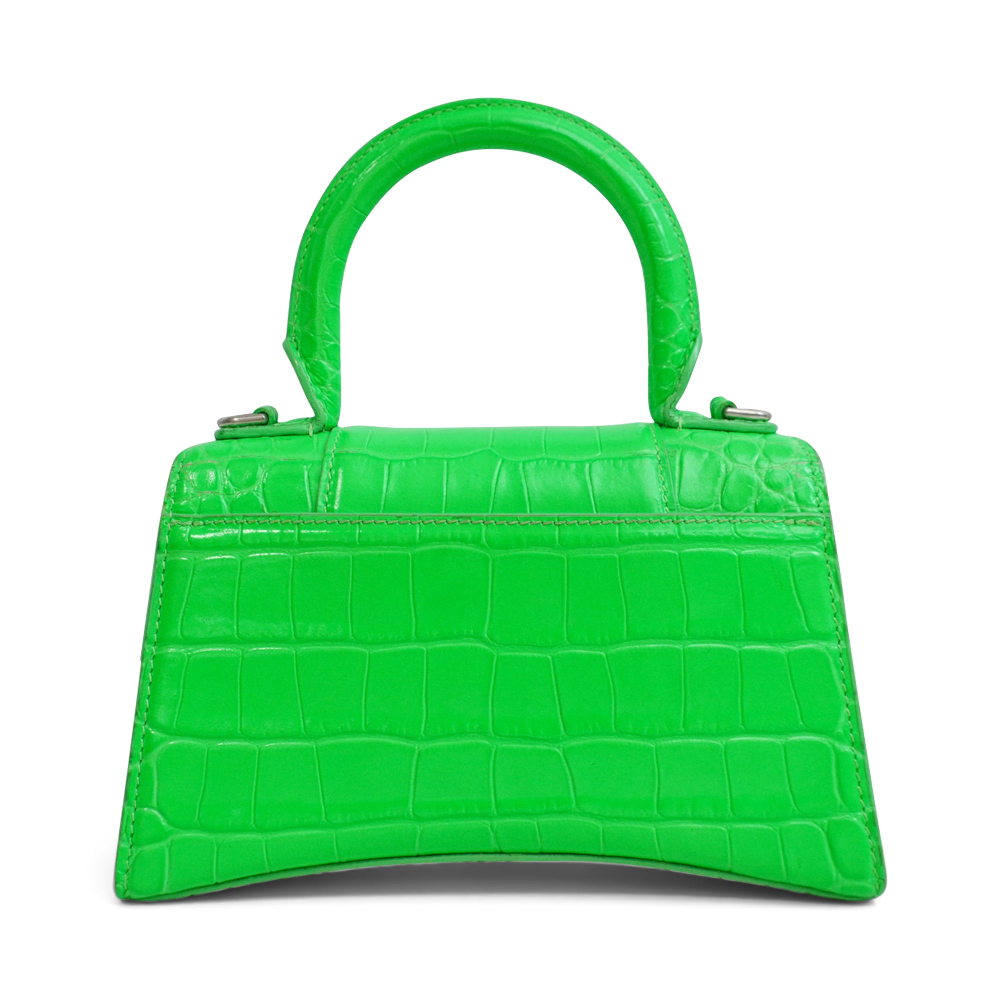 Balenciaga 'Hourglass Mini' handbag in neon green croc embossed leather with top handle, adjustable crossbody strap and slip pocket on the back. Featuring large 'B' logo clasp in silver hardware with magnetic snap closure.
