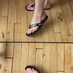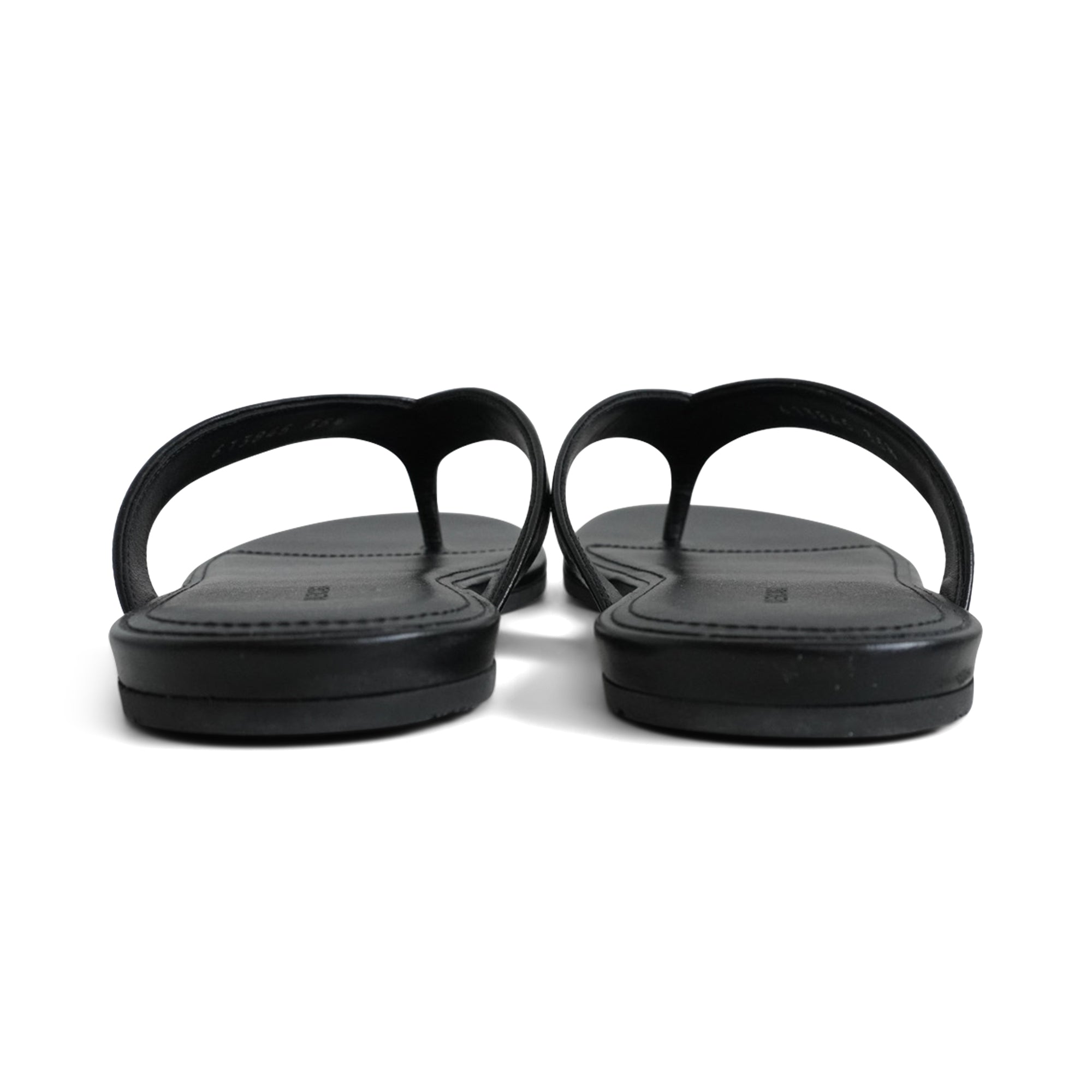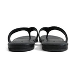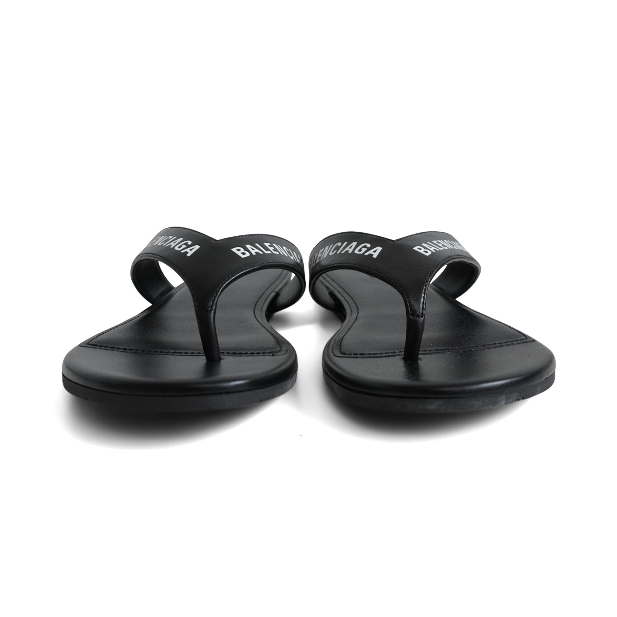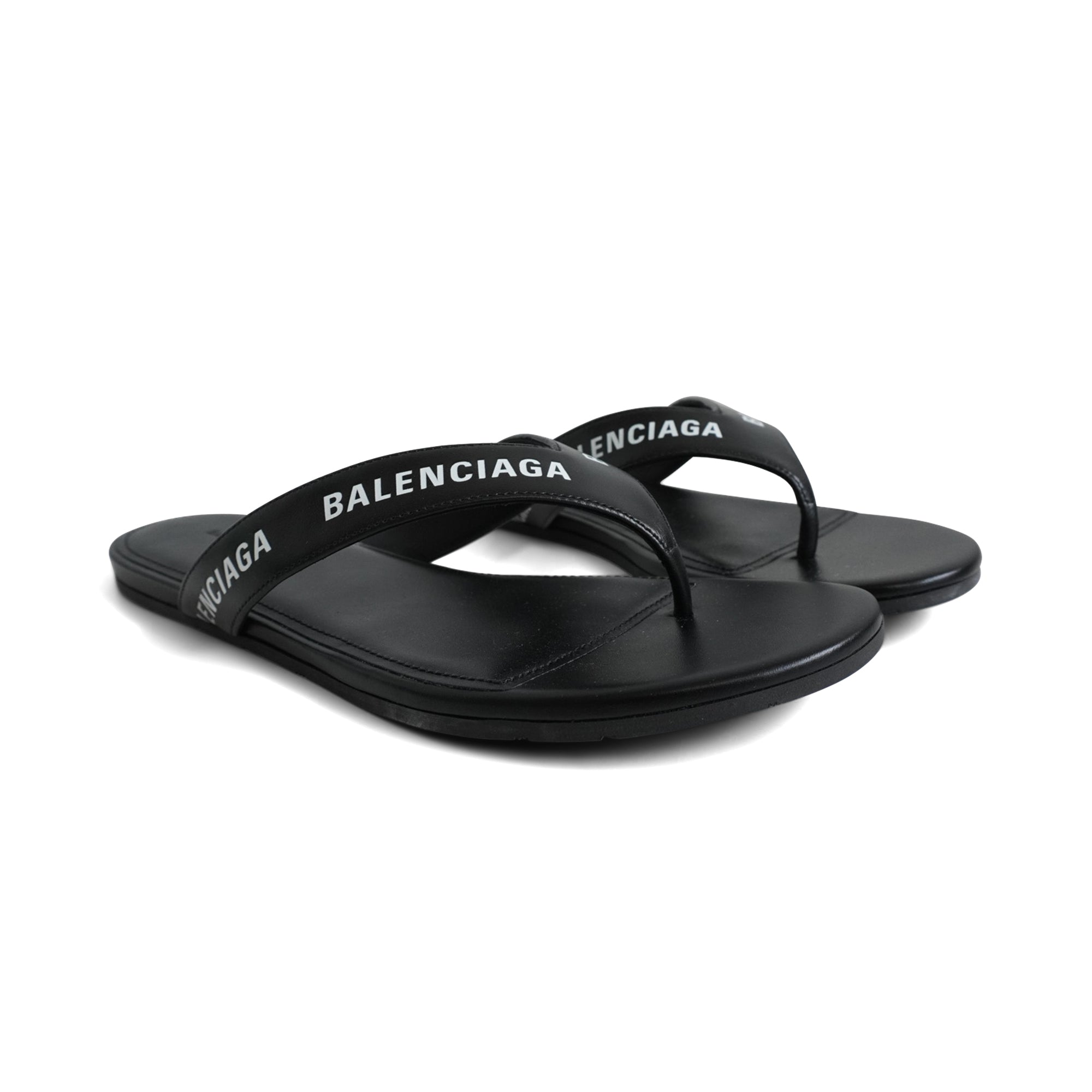 Balenciaga flip-flop sandals in black leather with a white logo monogram on the straps.