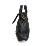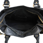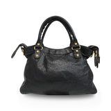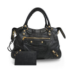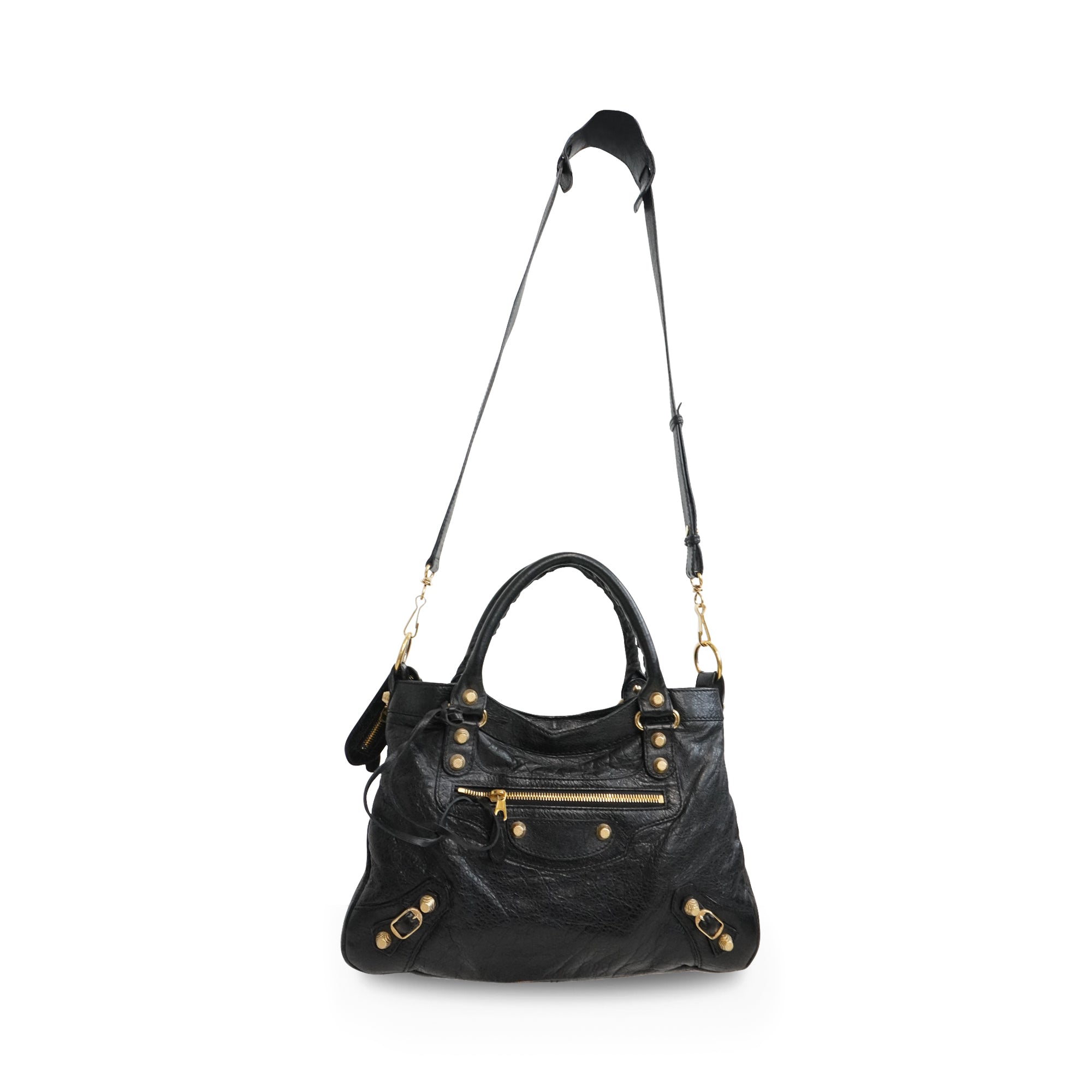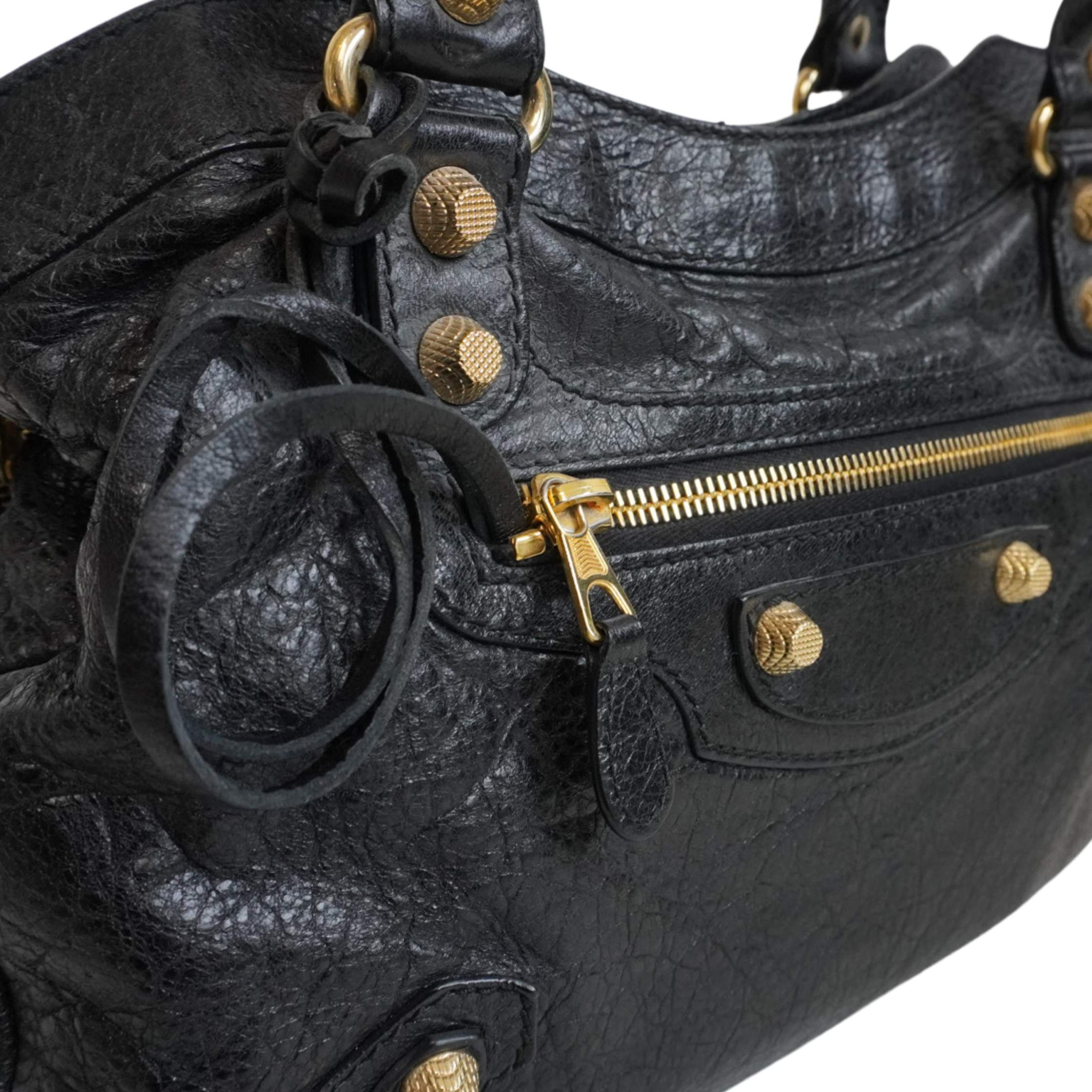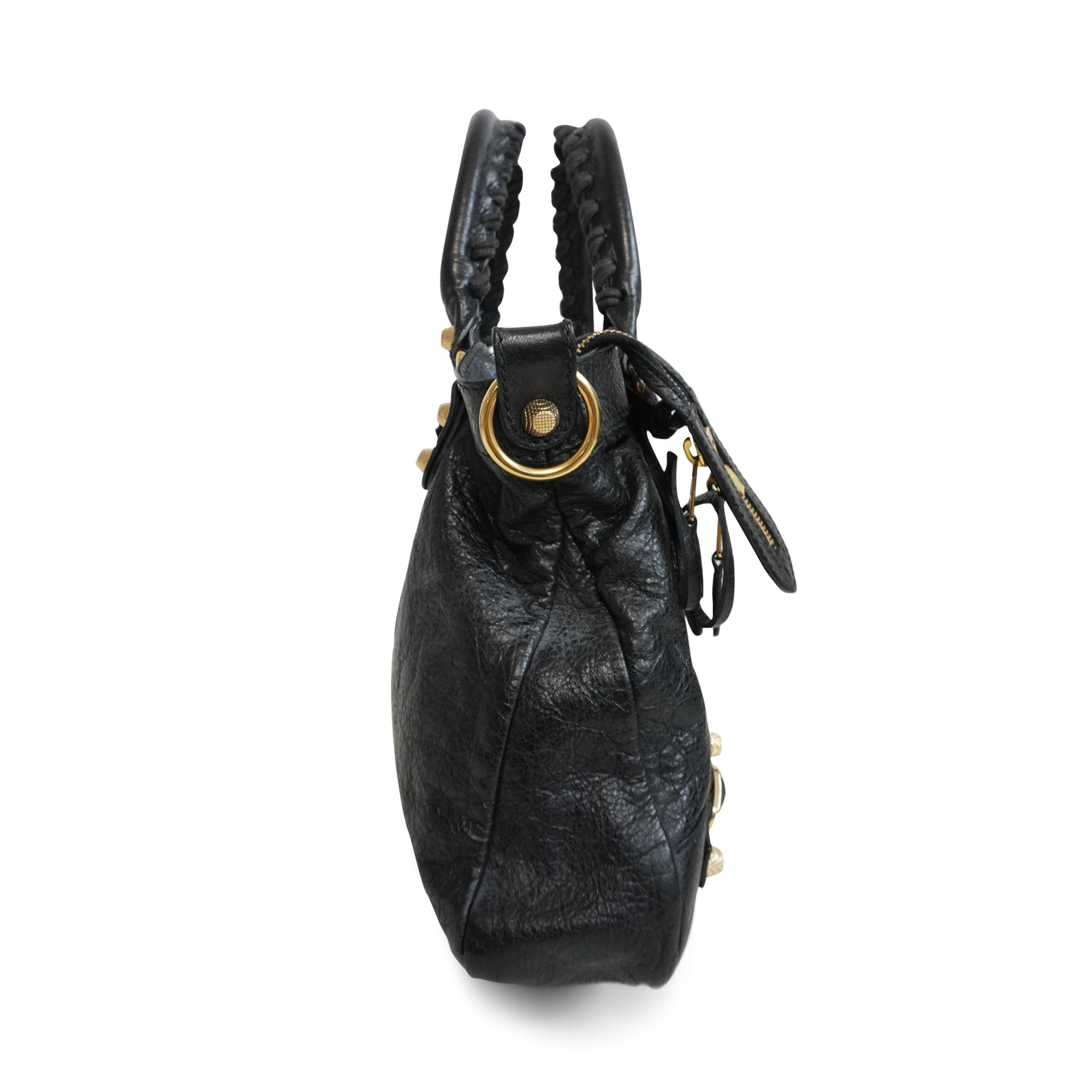 Balenciaga 'Motocross' handbag in black leather with gold grid stud hardware, a front zip pocket, dual rolled top handles with whip stitch detailing, and a removable crossbody strap. The bag has a top-zip opening revealing a black canvas interior lining with a zip pocket.