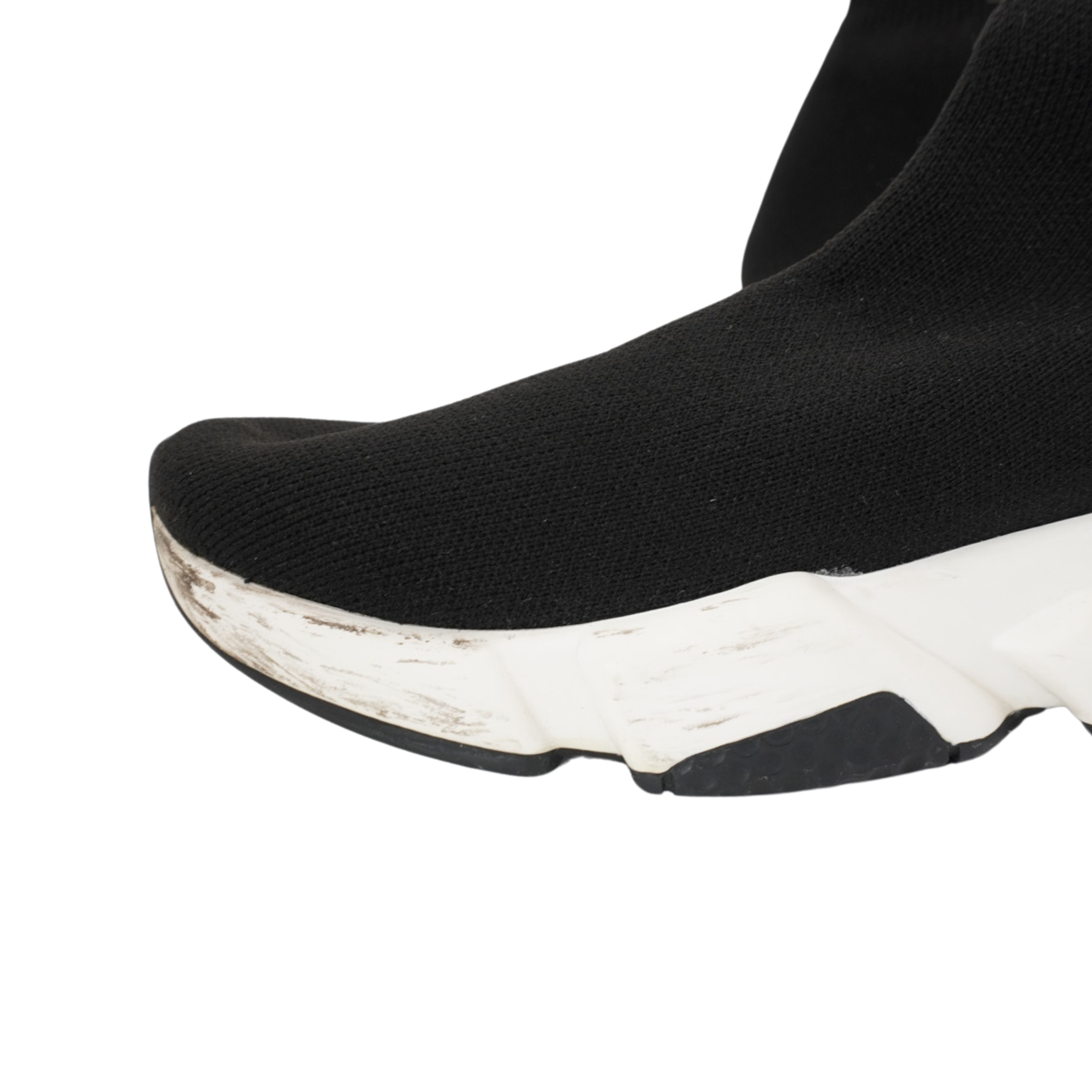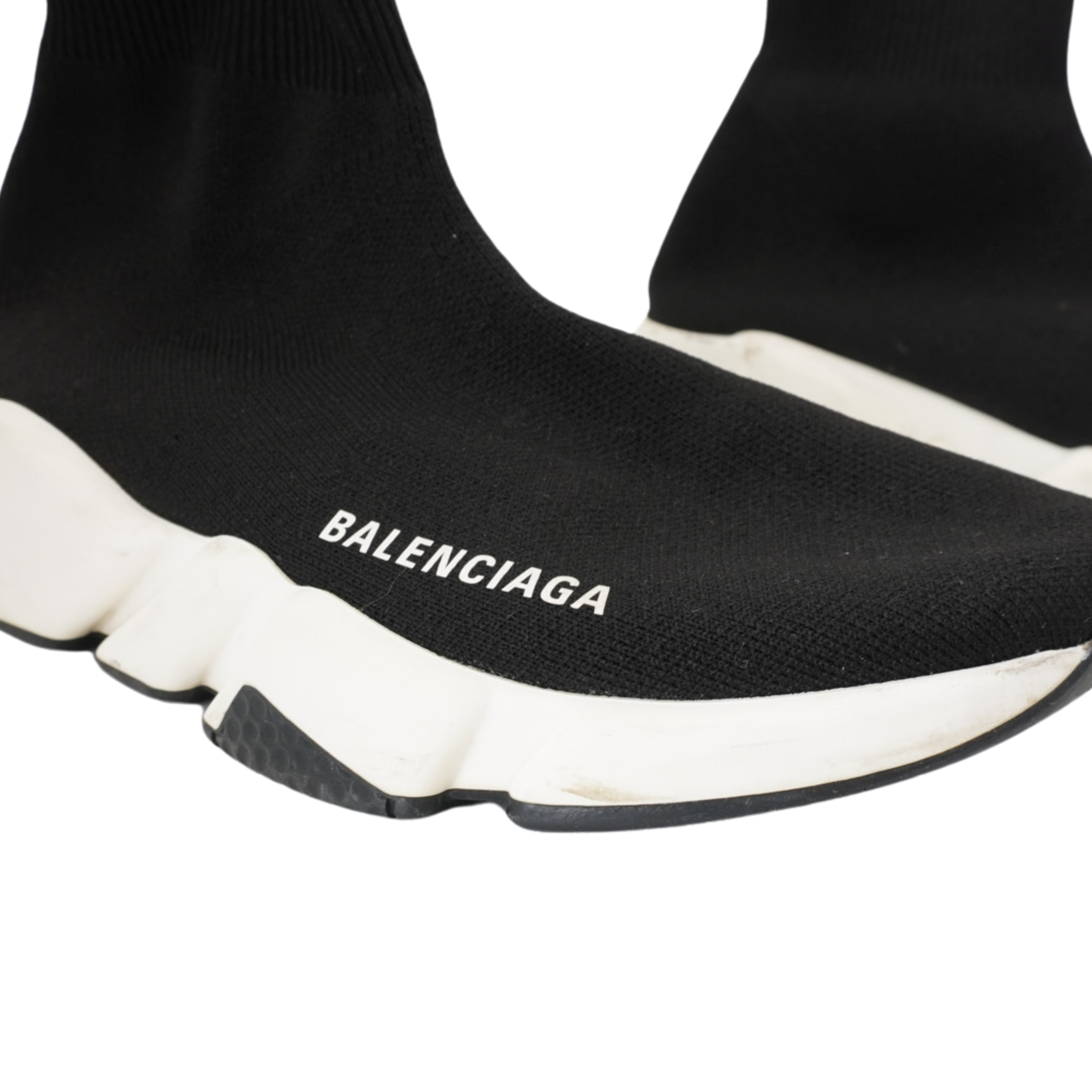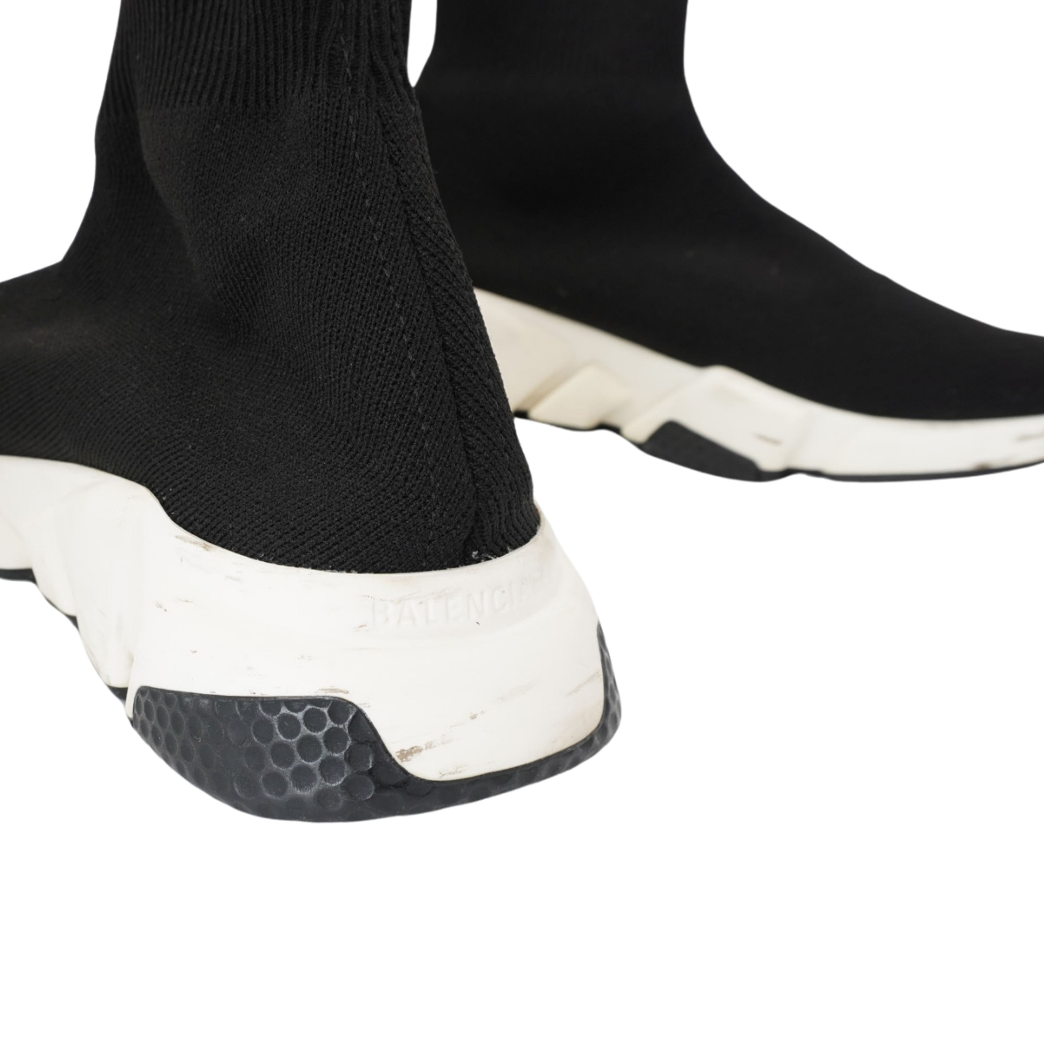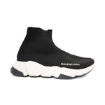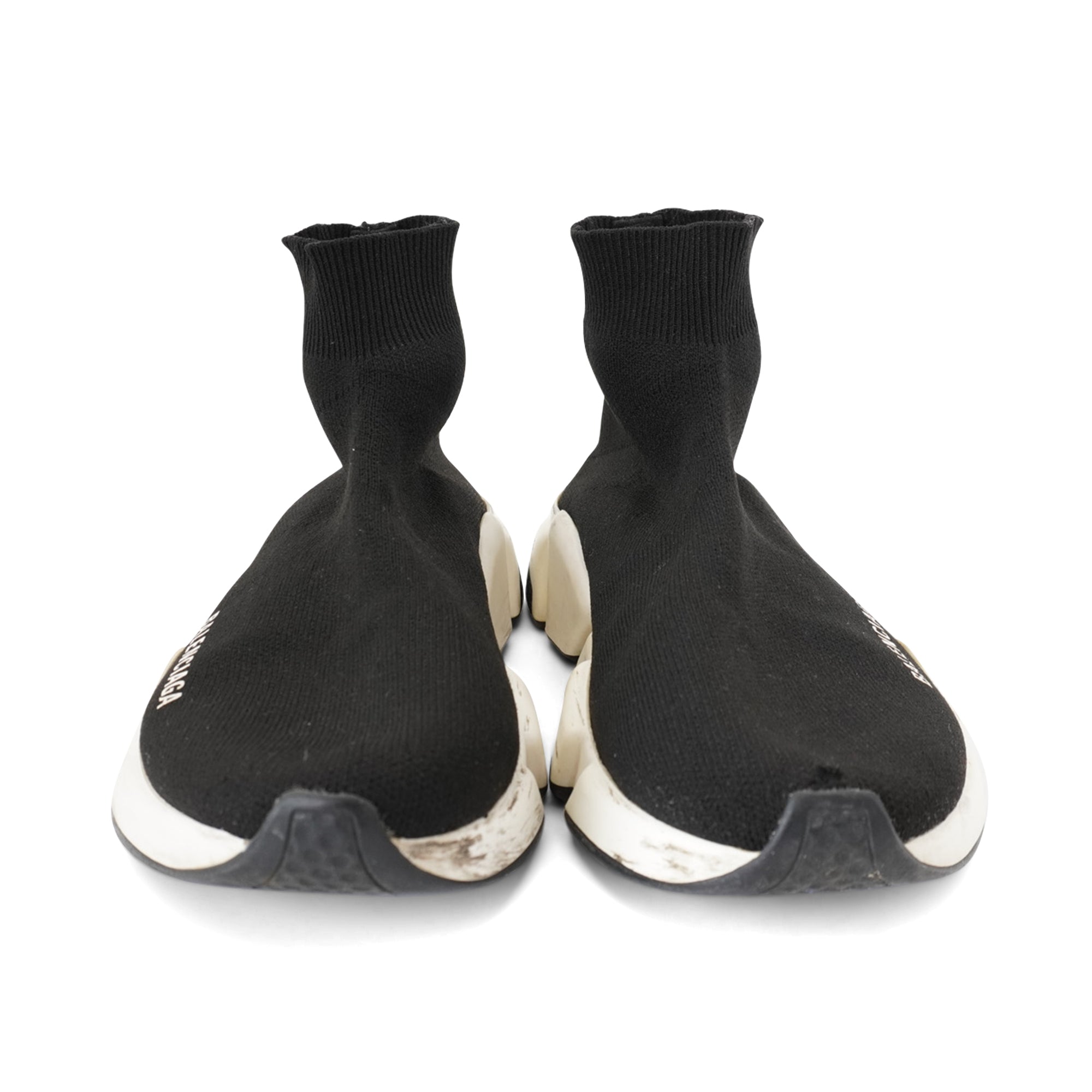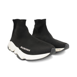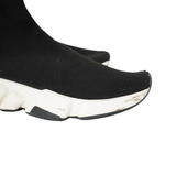 Balenciaga 'Speed Trainer' sock sneakers in black knit with a white logo on the sides and a white rubber soles.