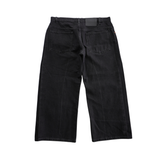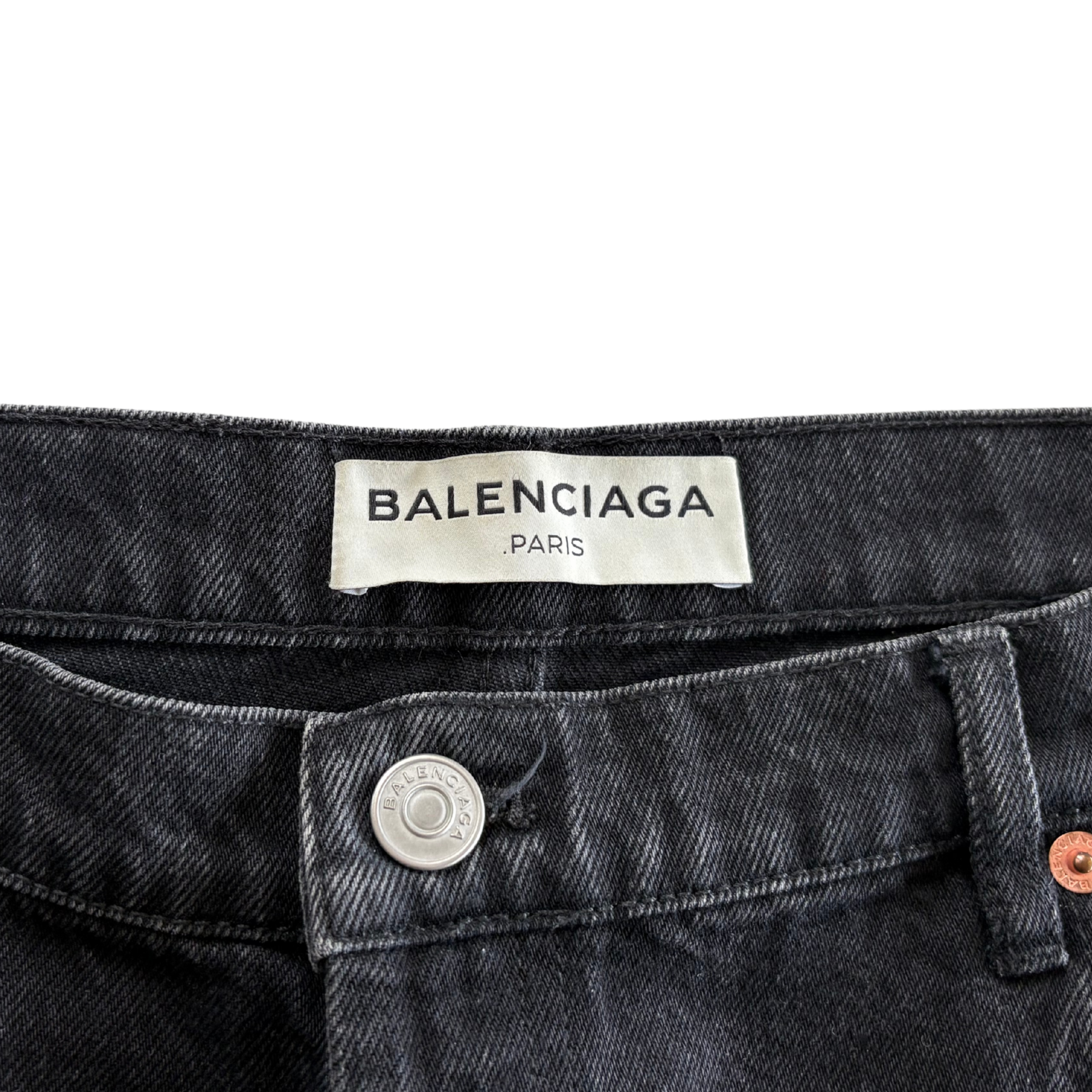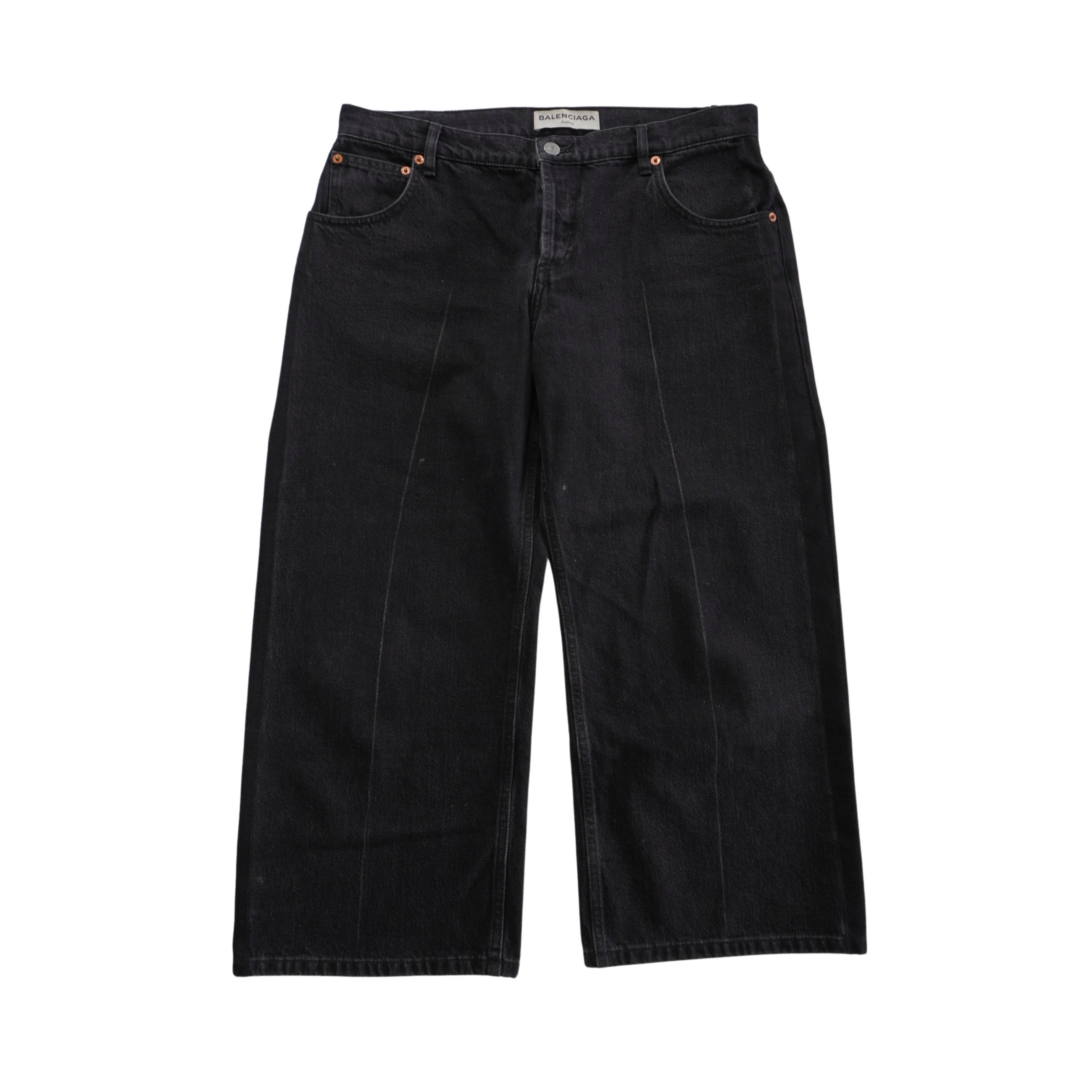 Balenciaga wide leg, cropped fit jeans in washed black denim with faded crease lines on the front and back. Feature a low-mid rise and button fly.