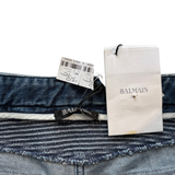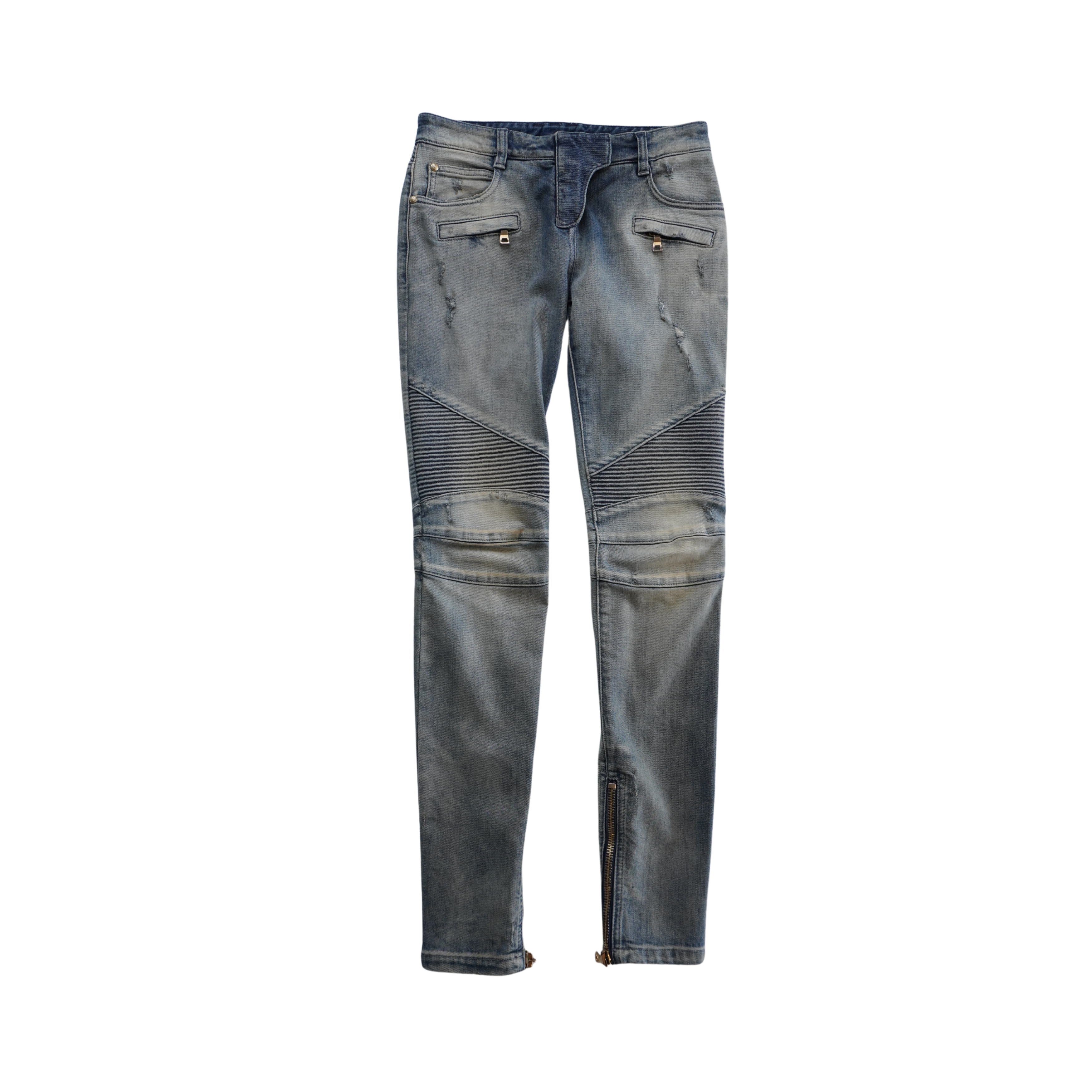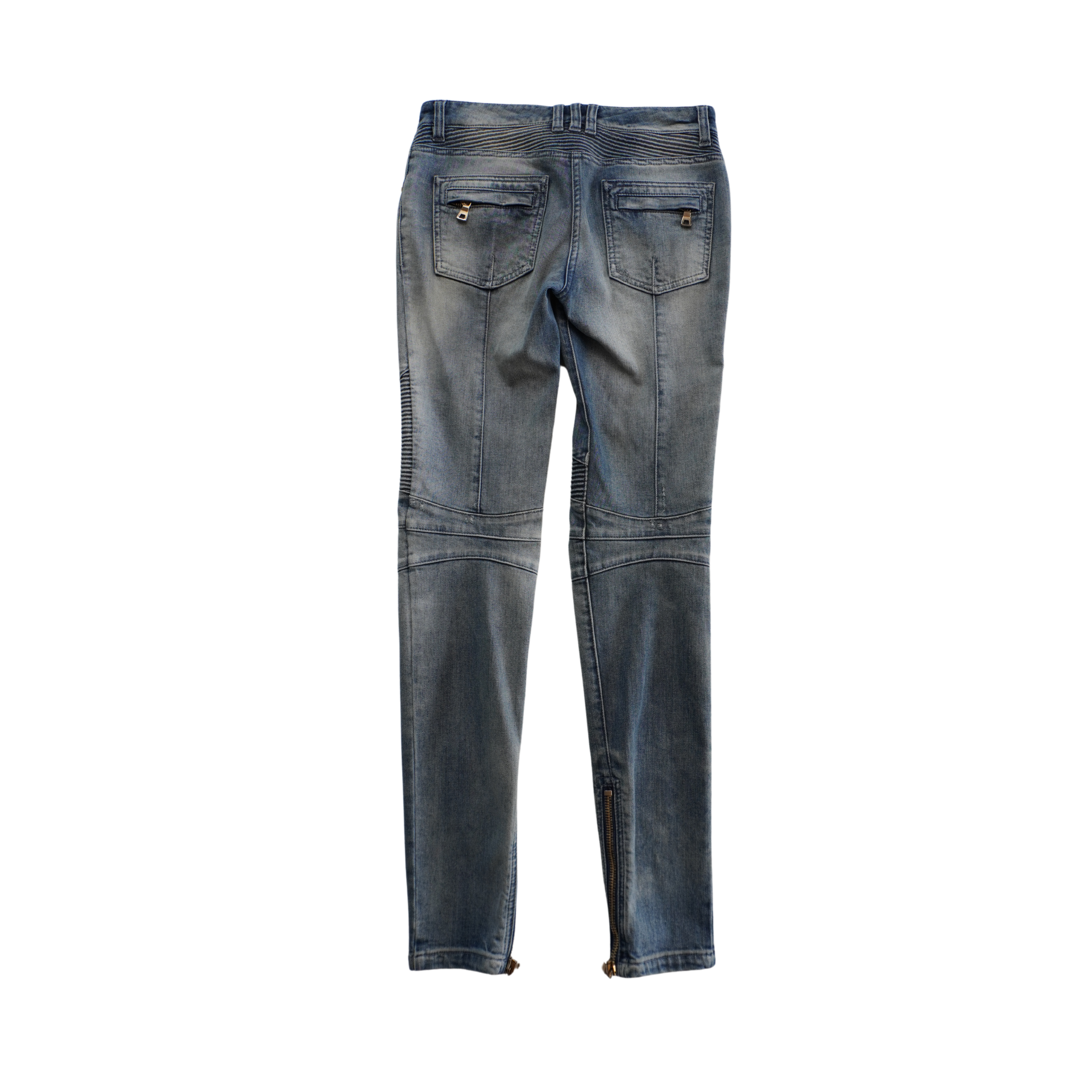 Balmain low-rise biker jeans in faded blue denim with light distressing, ribbing at the knees, zip hardware at the thighs and ankles, and a front hook-eye closure.