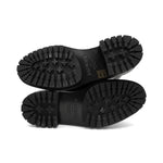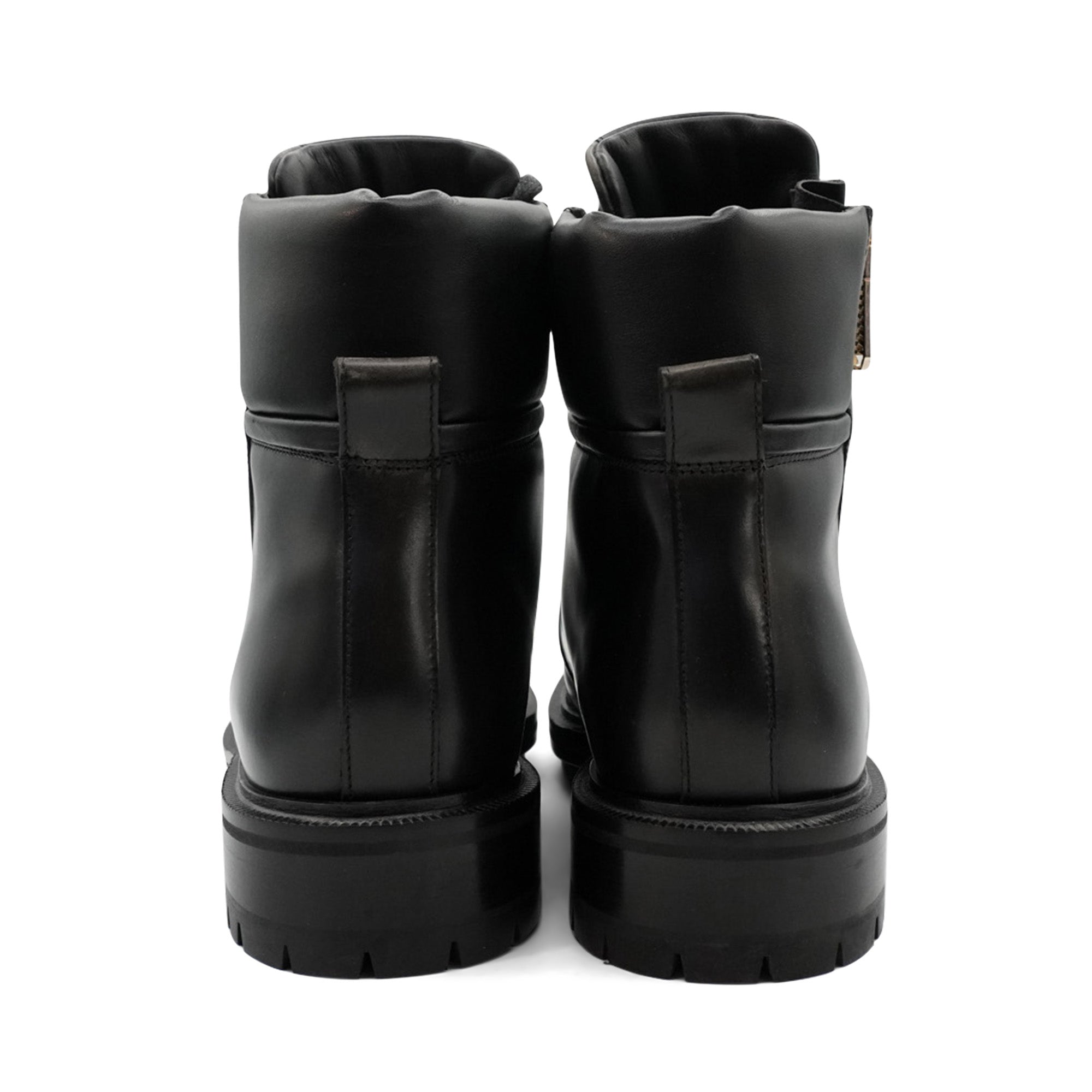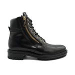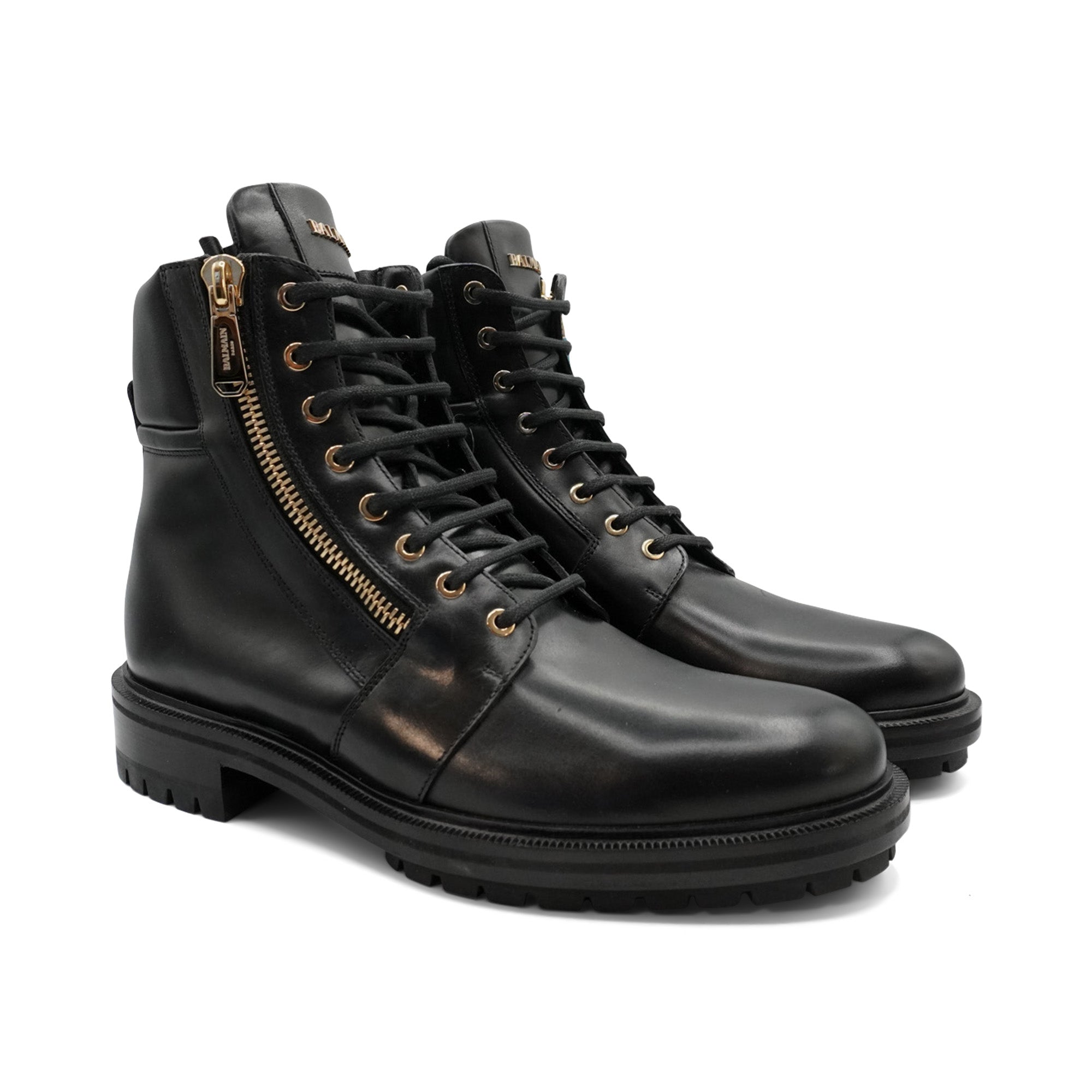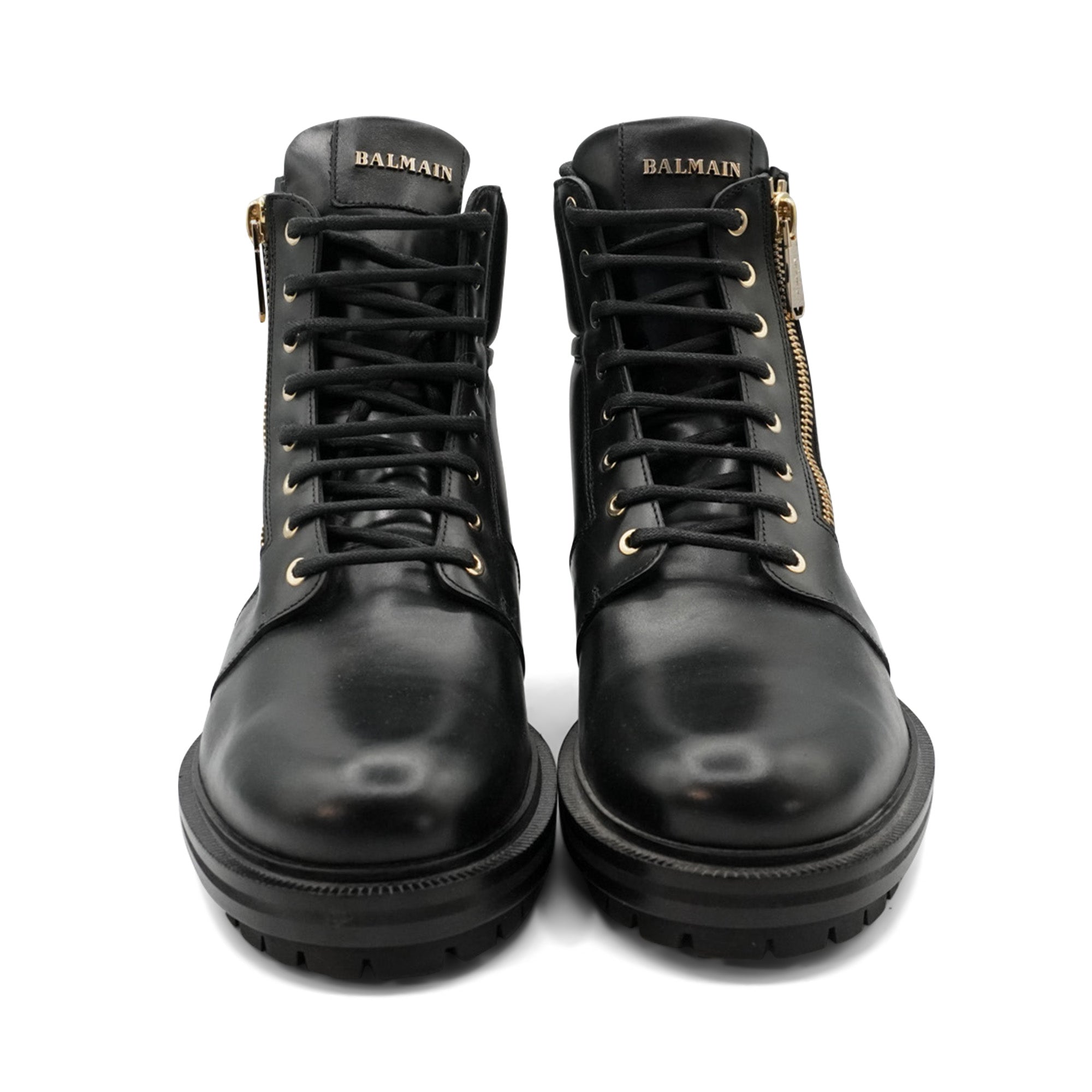Balmain black smooth leather combat ankle boots. Features gold hardware, half zipper closure on outside, a pull tab on back, and a gold metal logo on tongue.