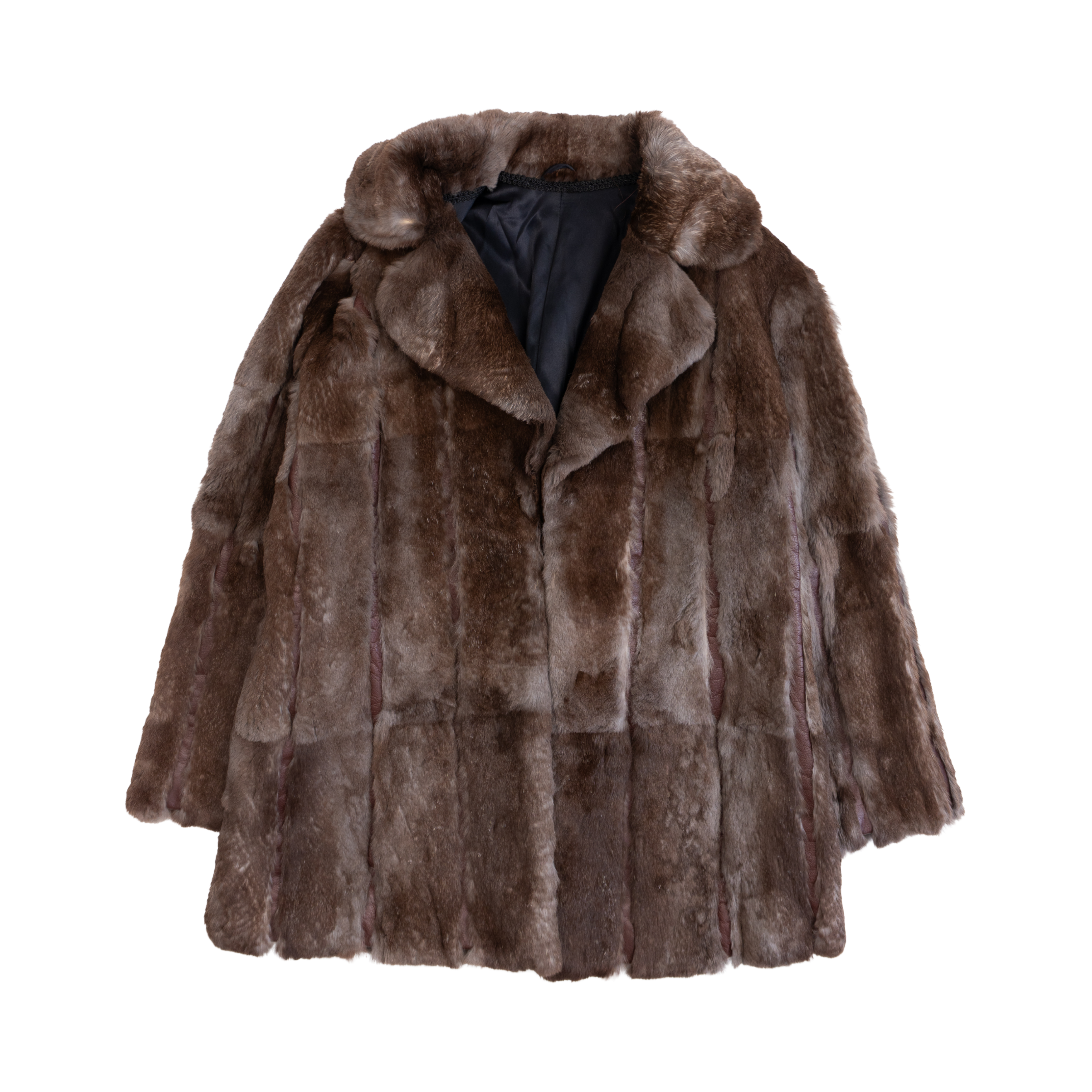 Bite Bear fur coat in brown sheared rabbit fur with leather panneling and side seam pockets with front hook and eye closure.