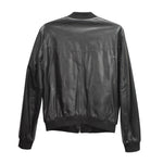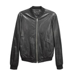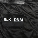 BLK DNM black leather bomber jacket with a front zip opening in silver hardware and side pockets.