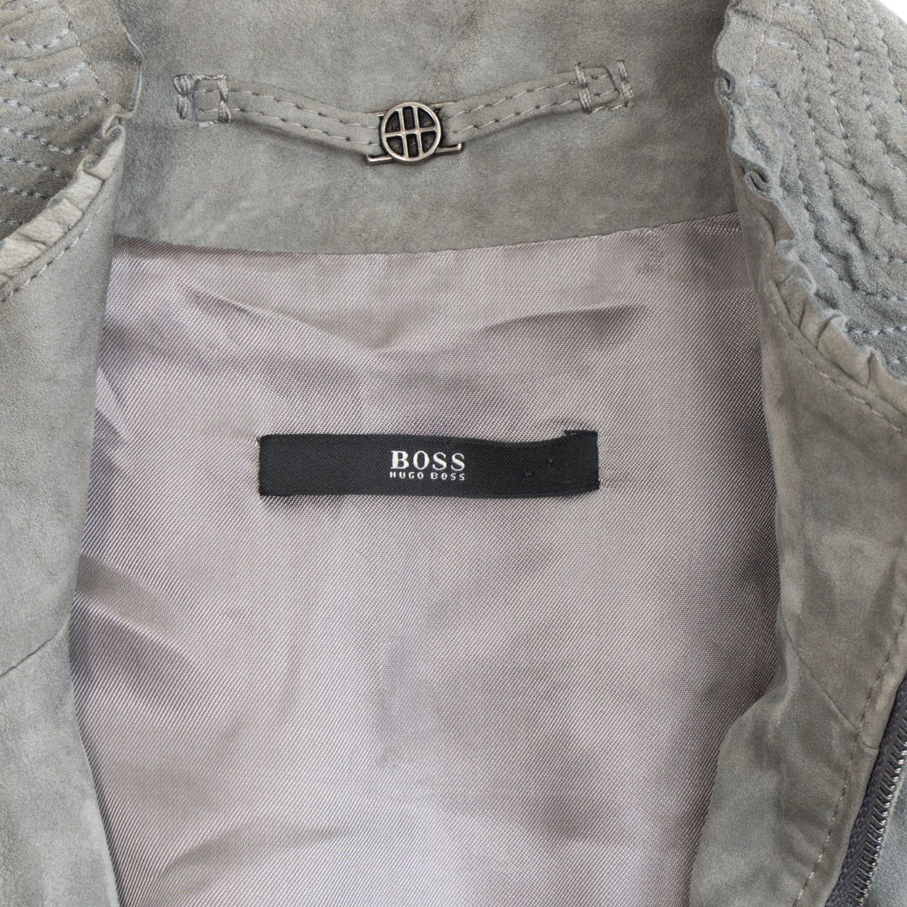 Boss jacket in grey suede with ruched stand collar, hem, sides and cuffs with front two way zipper closure in gunmetal hardware and two front slip snap pockets.