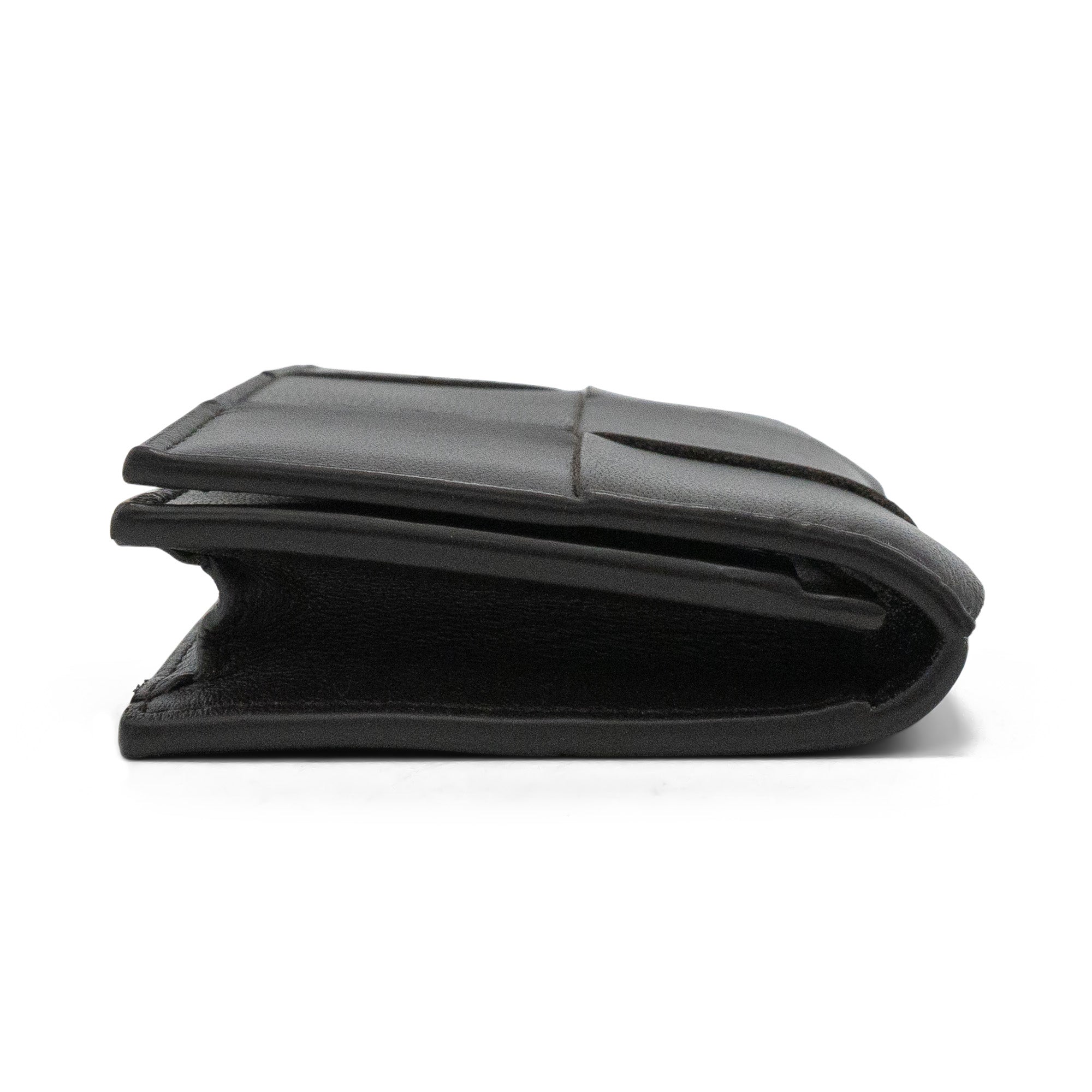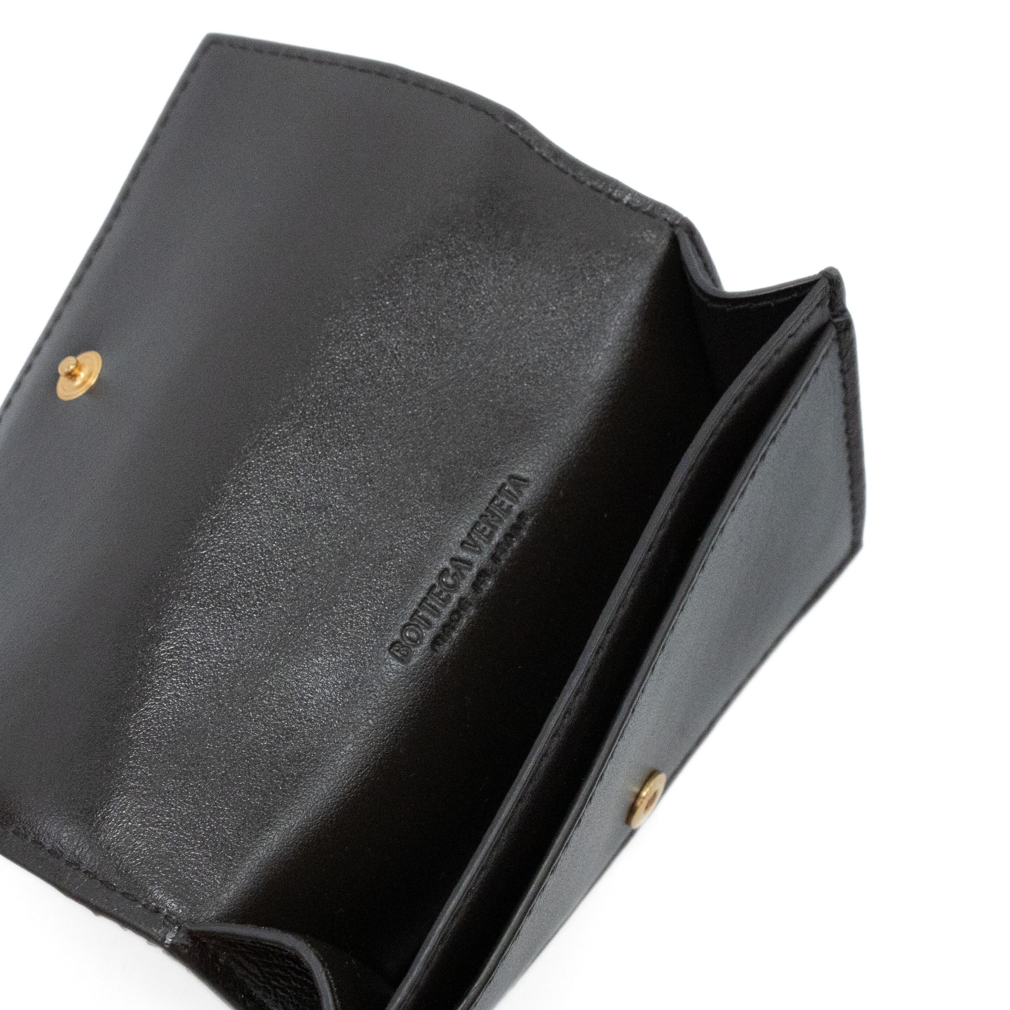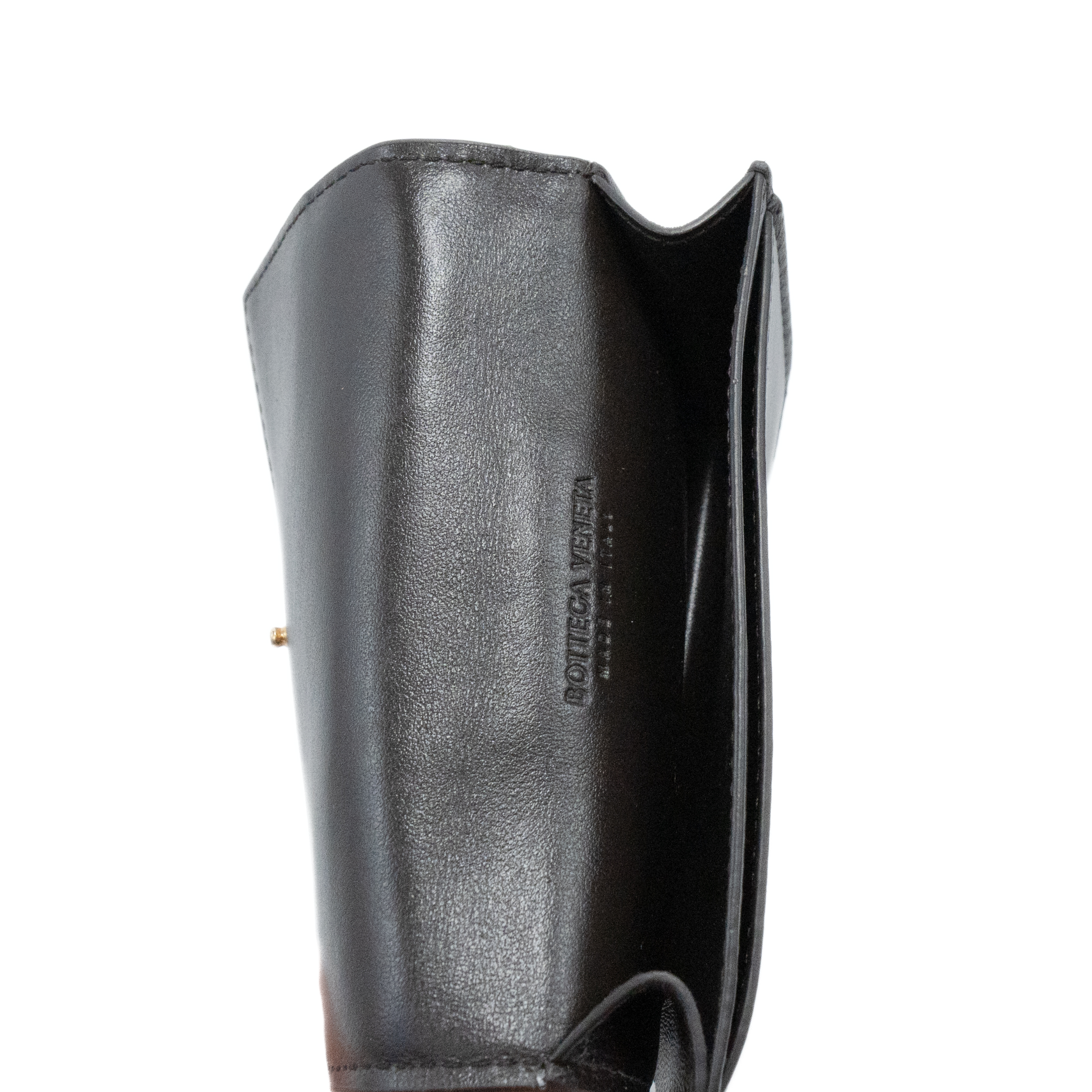 Bottega Veneta snap card holder wallet in 'big weave' dark brown leather. Features one small card slot and one slightly larger compartment.