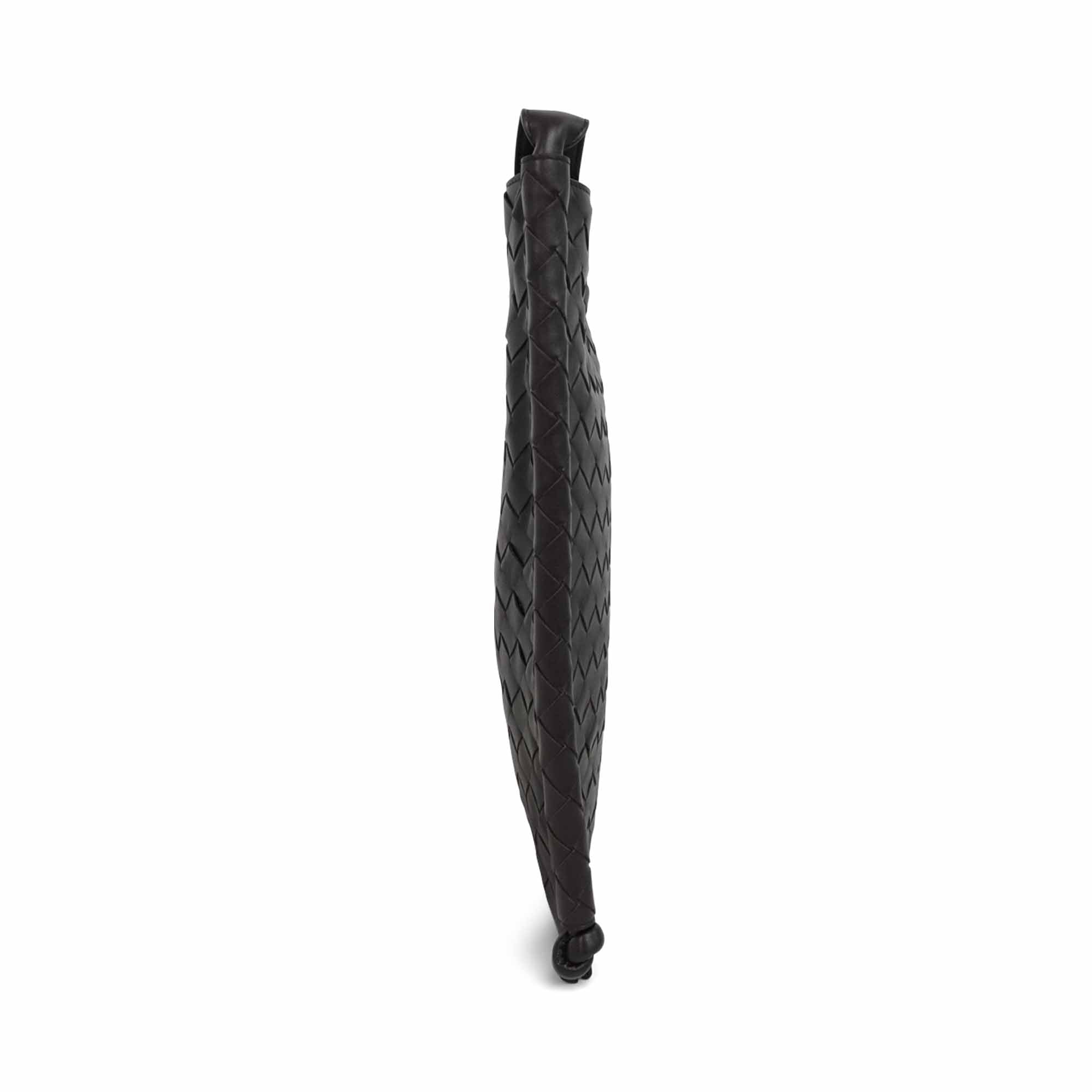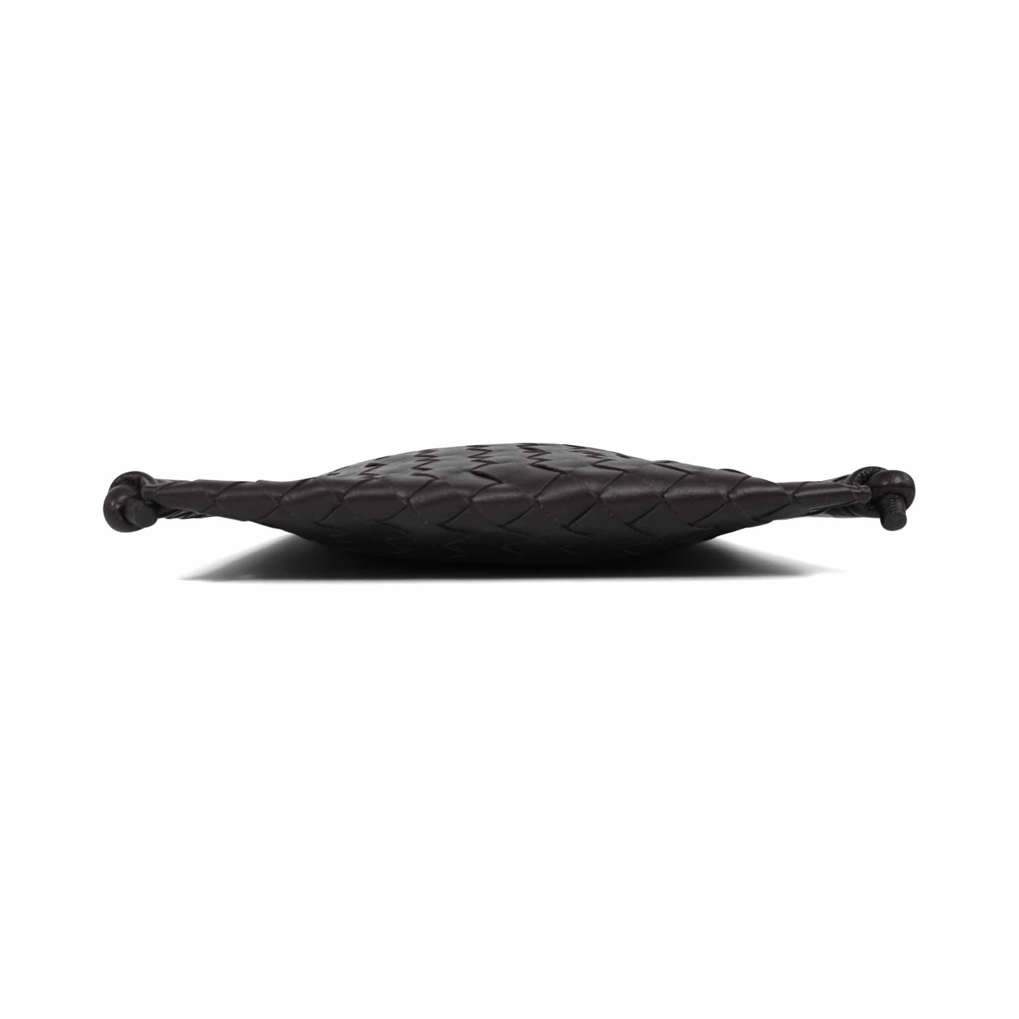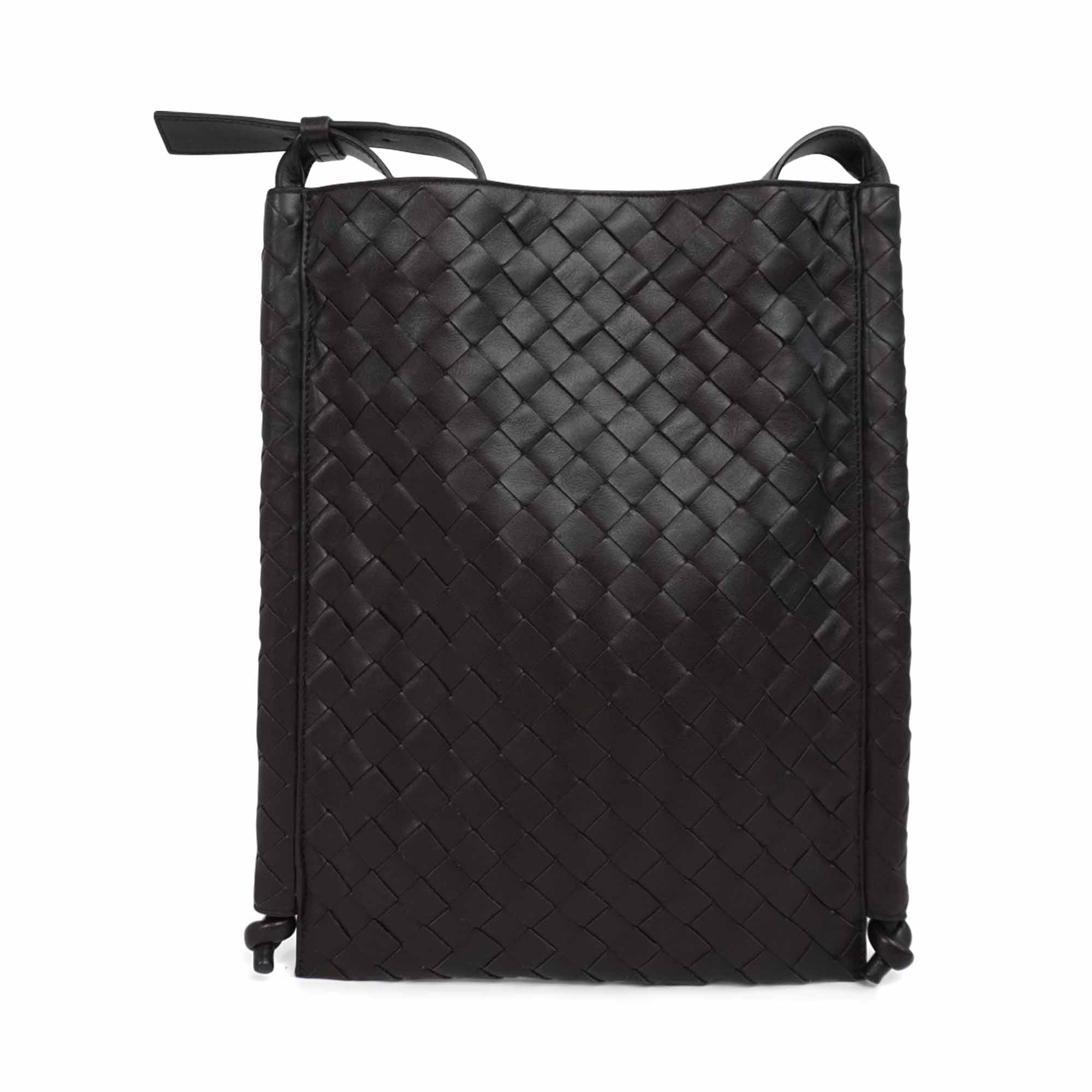 Bottega Veneta 'Flat Loop' messenger bag in signature intrecciato woven brown leather with adjustable shoulder strap and knot details at the bottom corners. Featuring magnetic closure that opens to beige canvas lining with two slip pockets.
