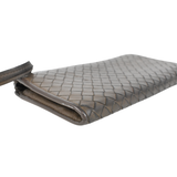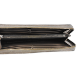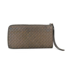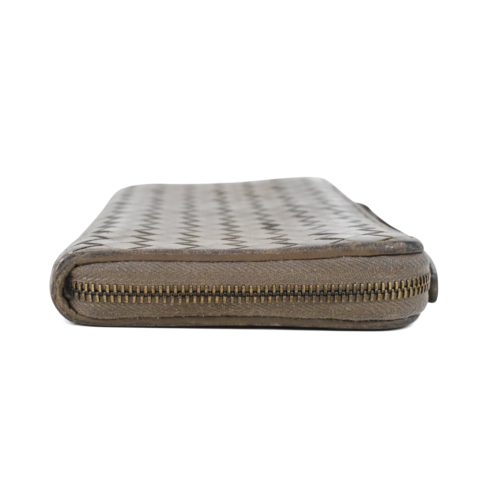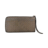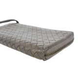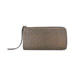 Bottega Veneta continental wallet in taupe intrecciato woven leather with a zip around opening in gunmetal hardware and a wristlet strap.