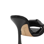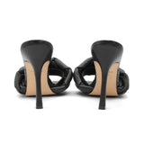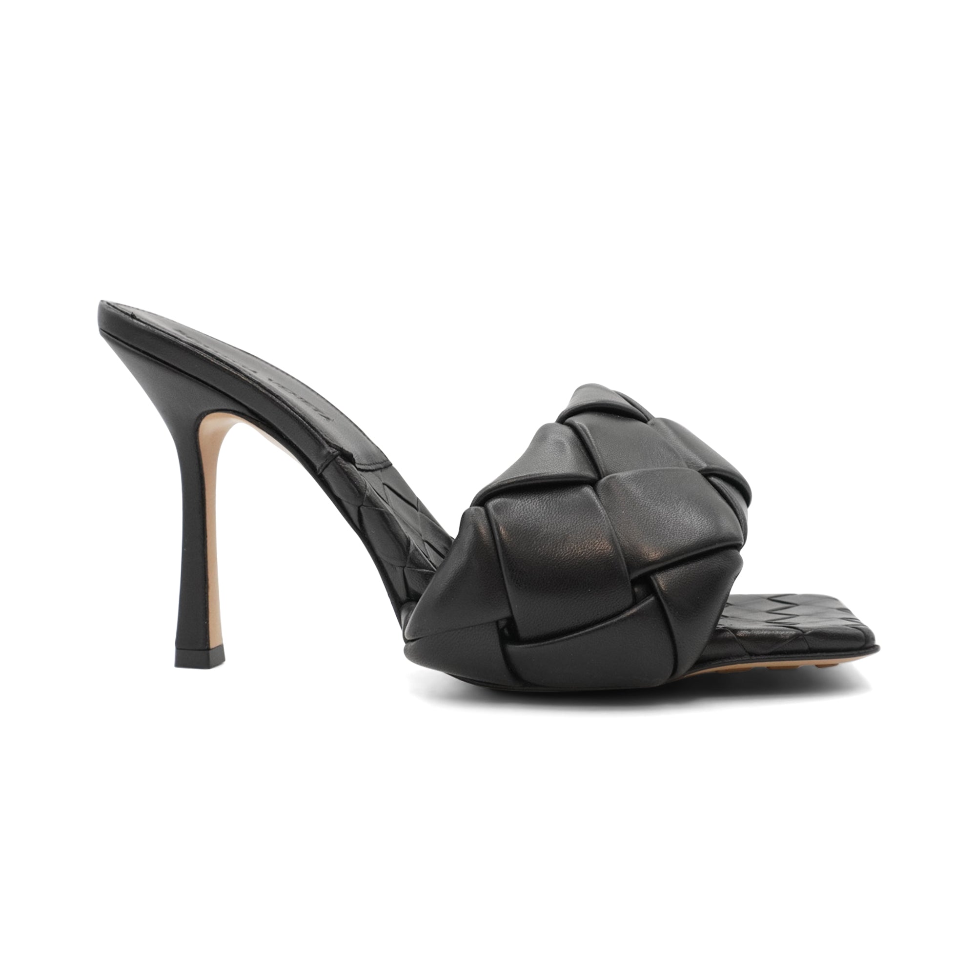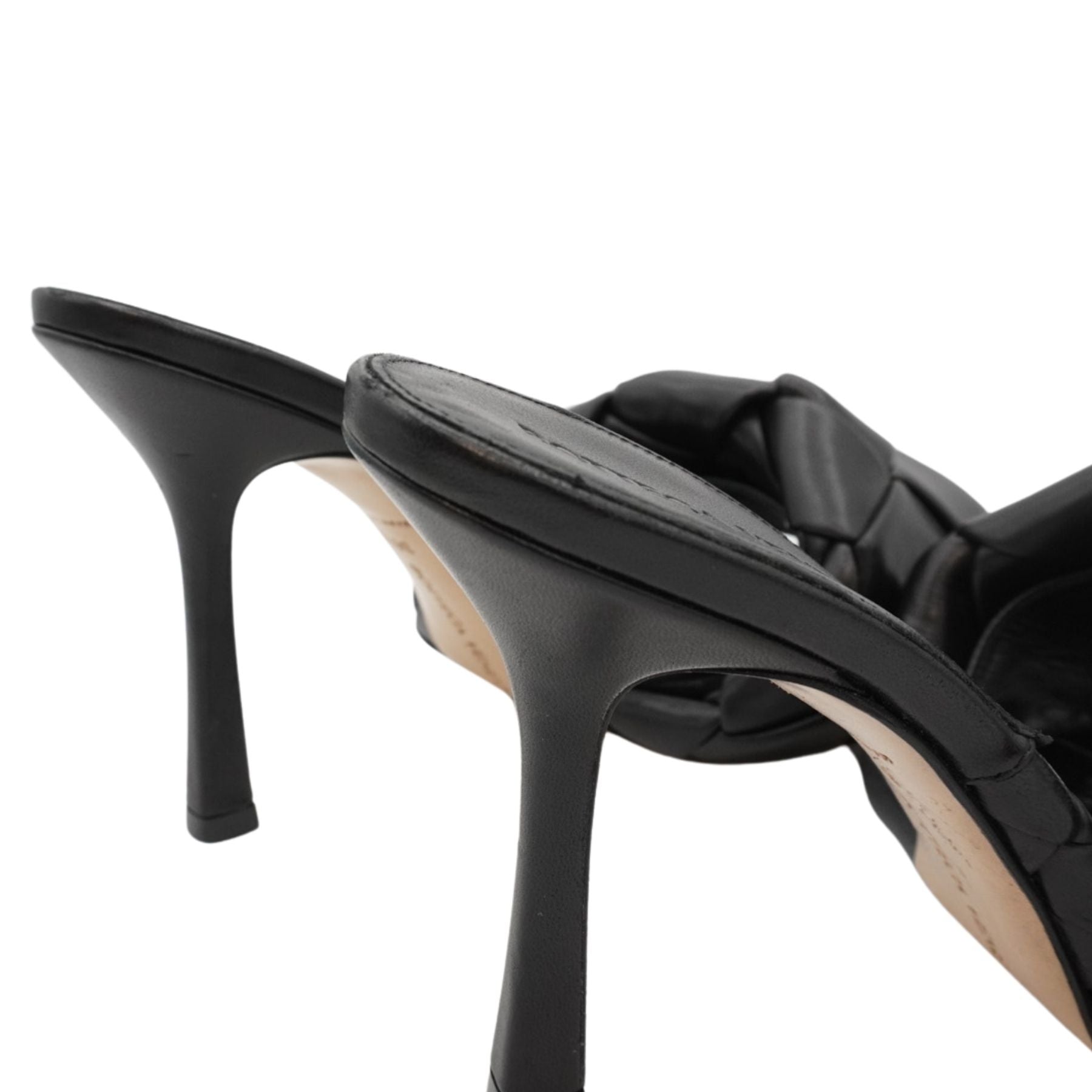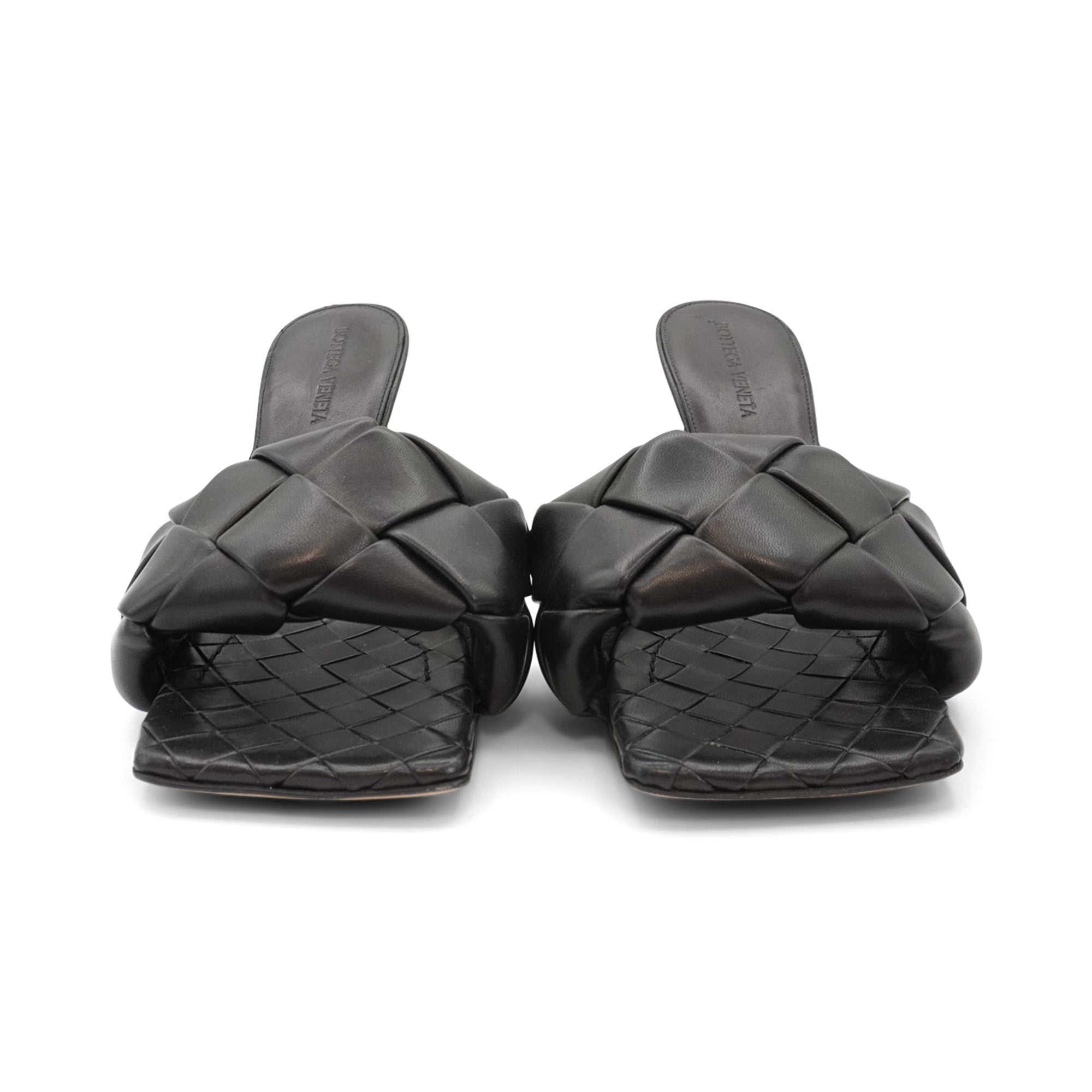 Bottega Veneta 'Lido' heeled mules in black intrecciato leather with covered leather heels and rubber soles.