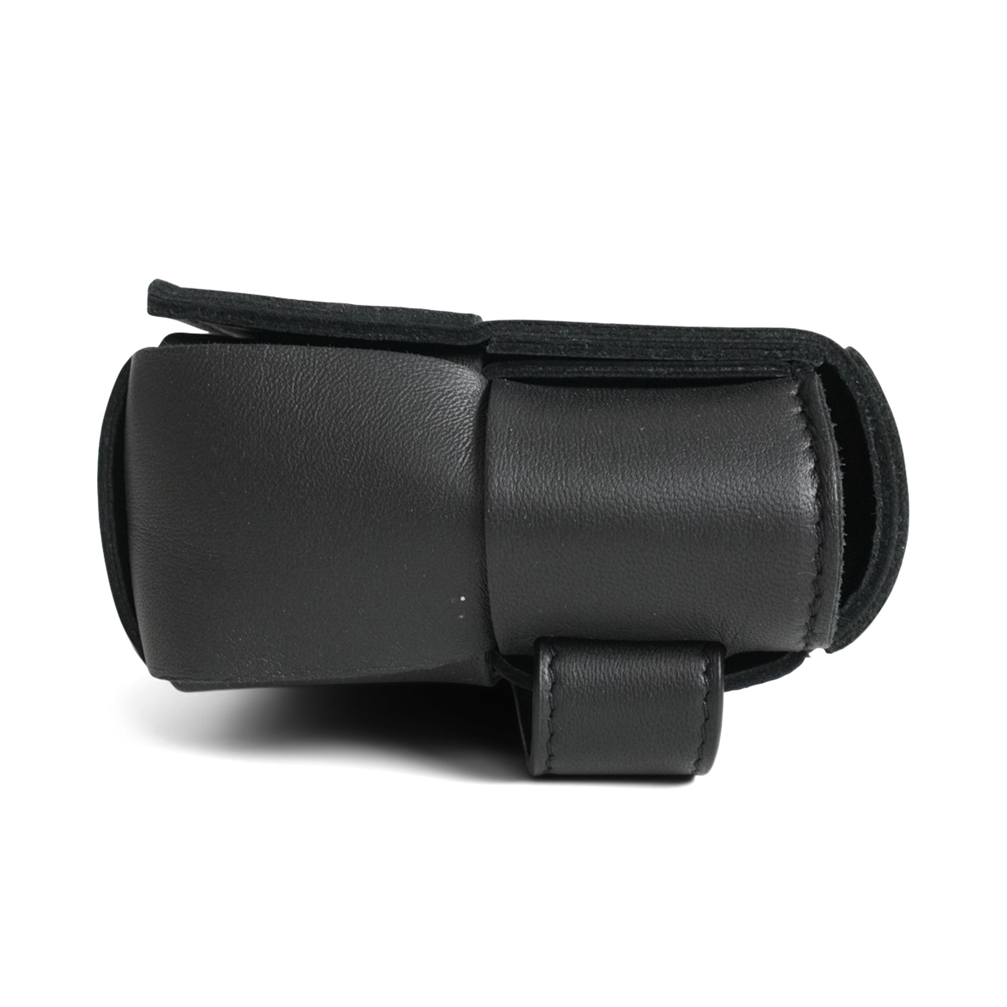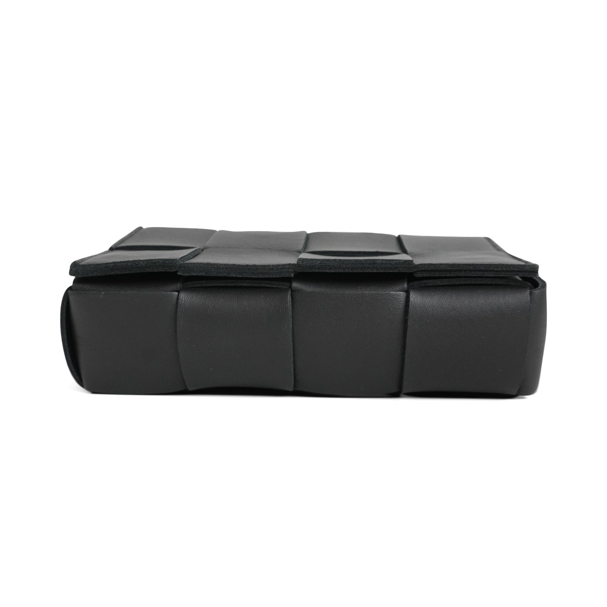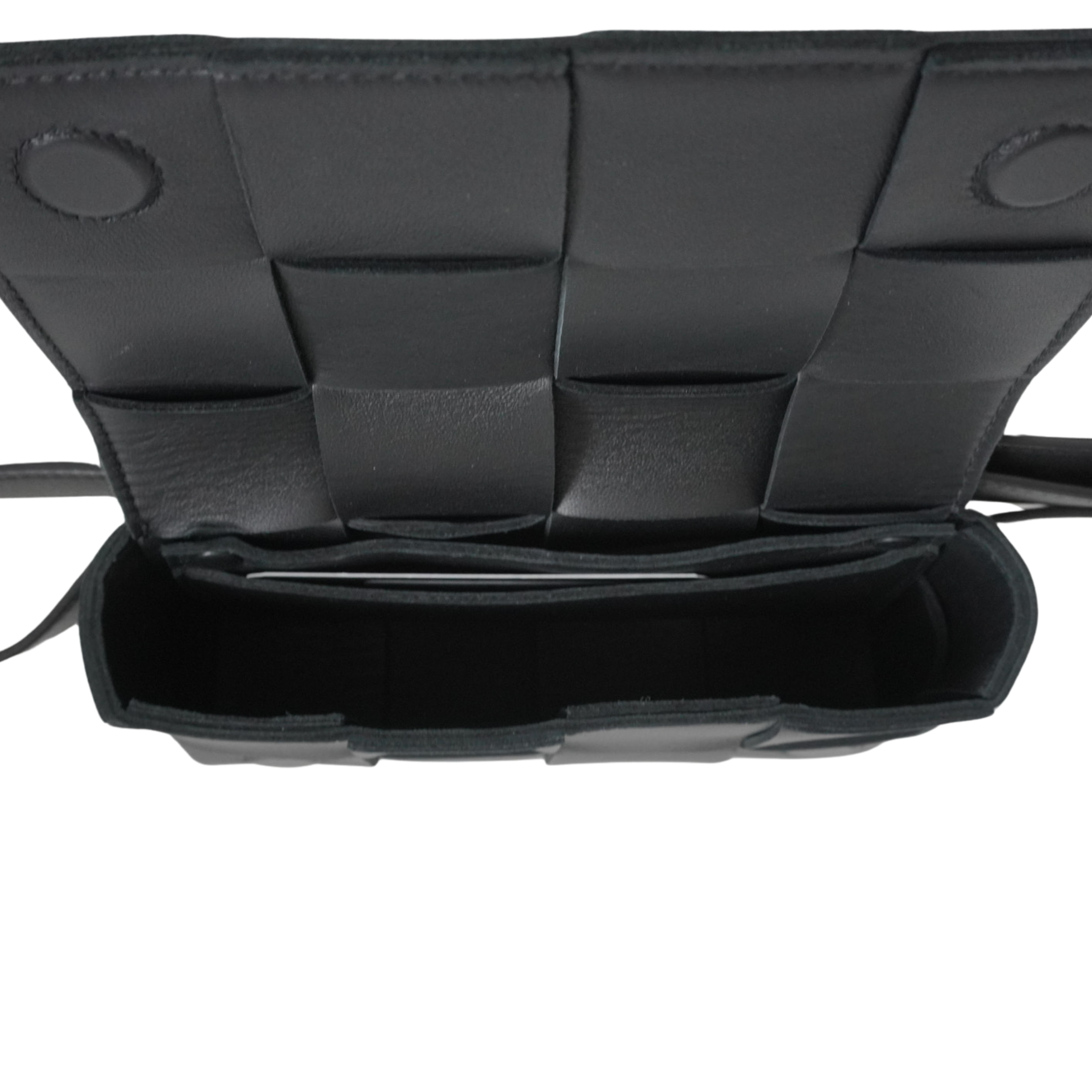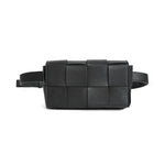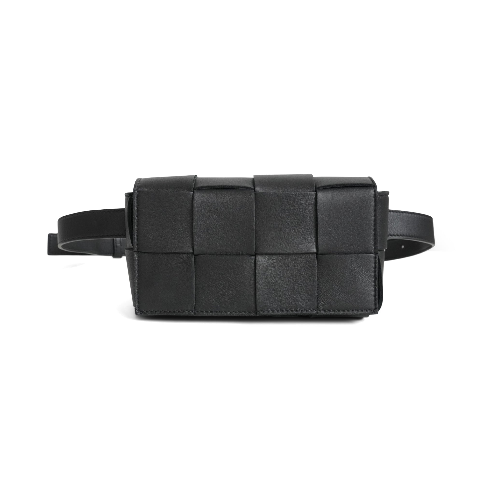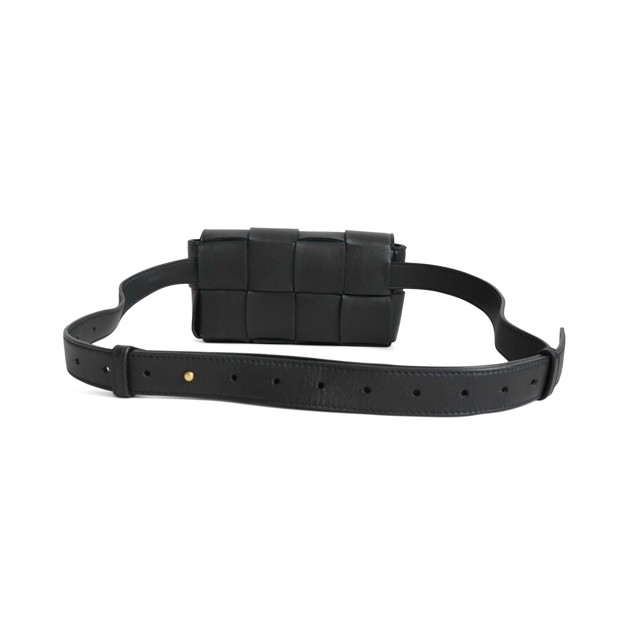 Bottega Veneta 'Mini Cassette' waist bag in black intrecciato woven leather with an adjstable crossbody strap, a front flap magentic closure, and an unlined interior.