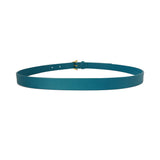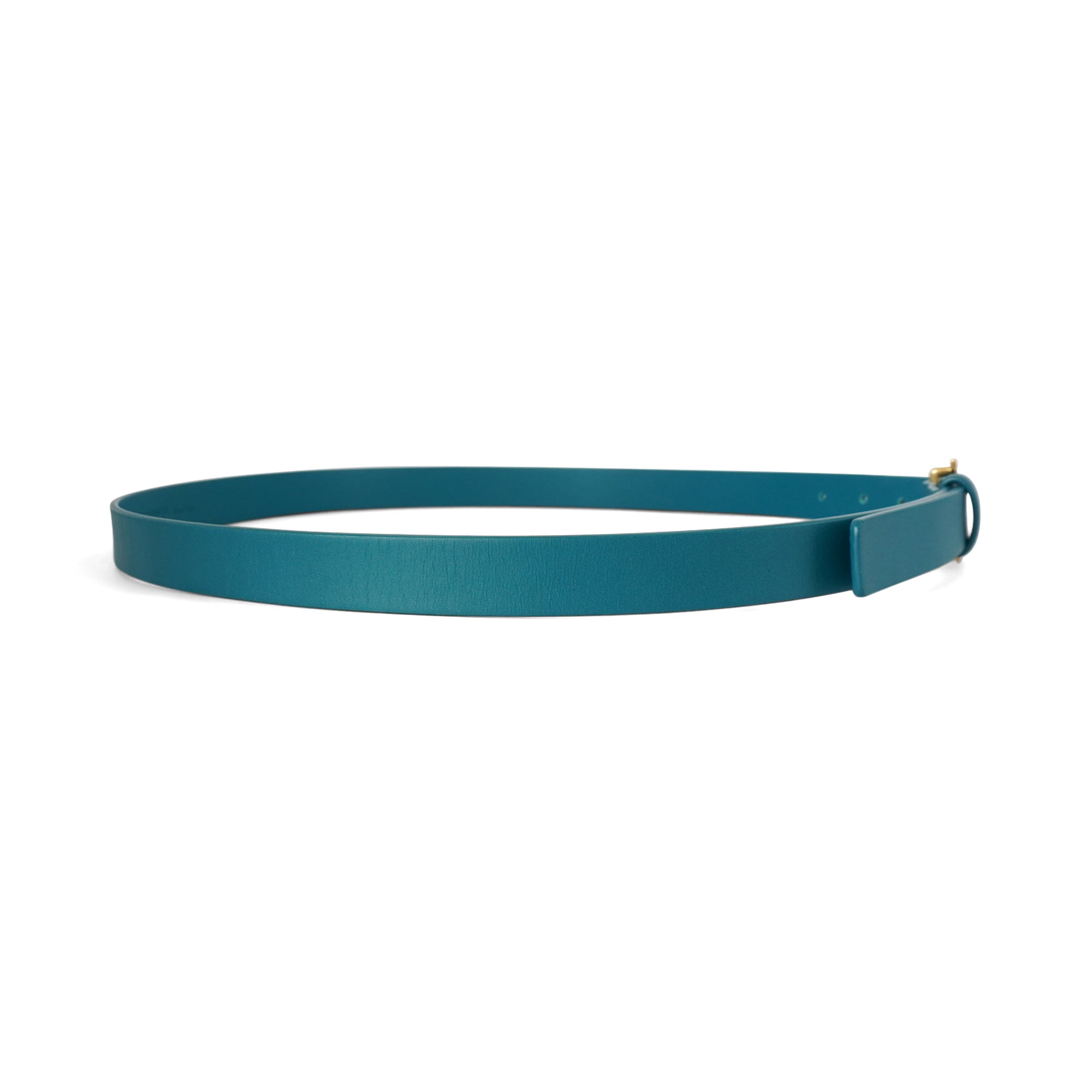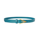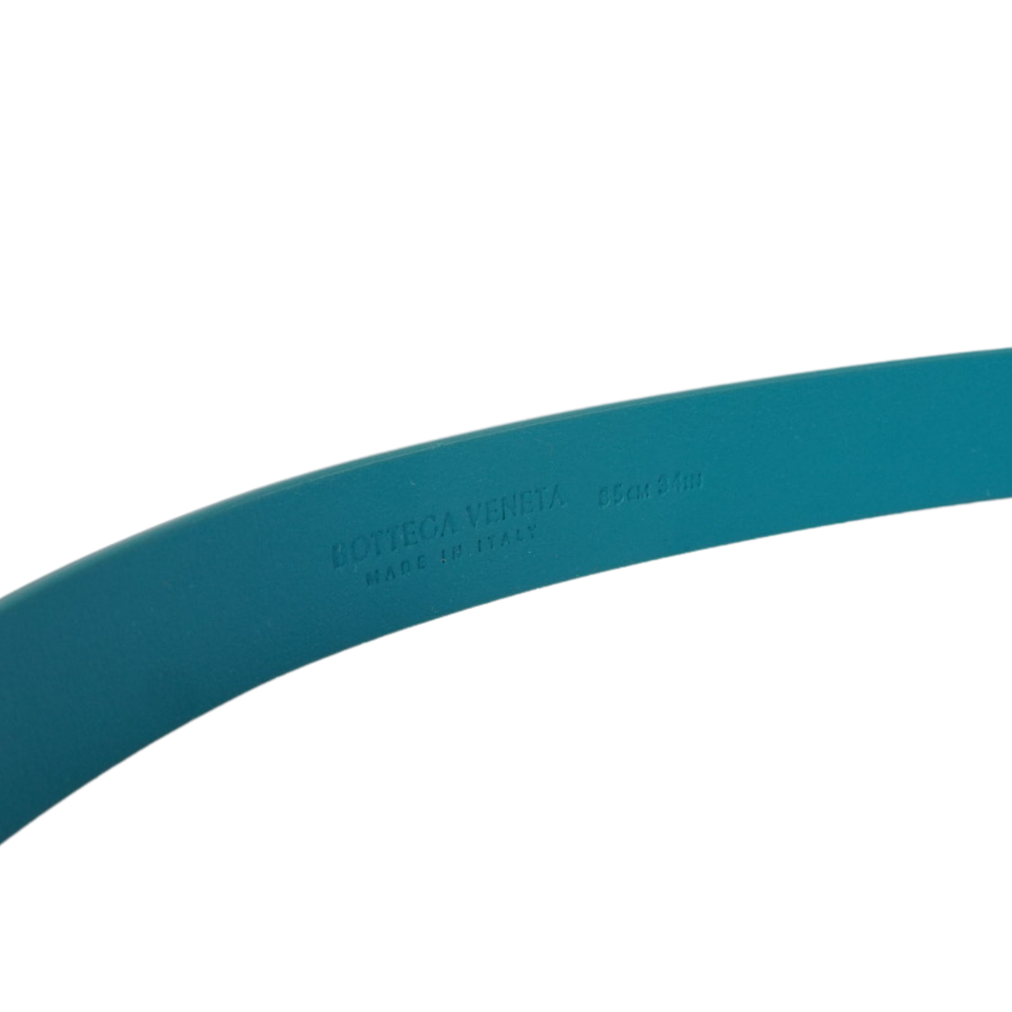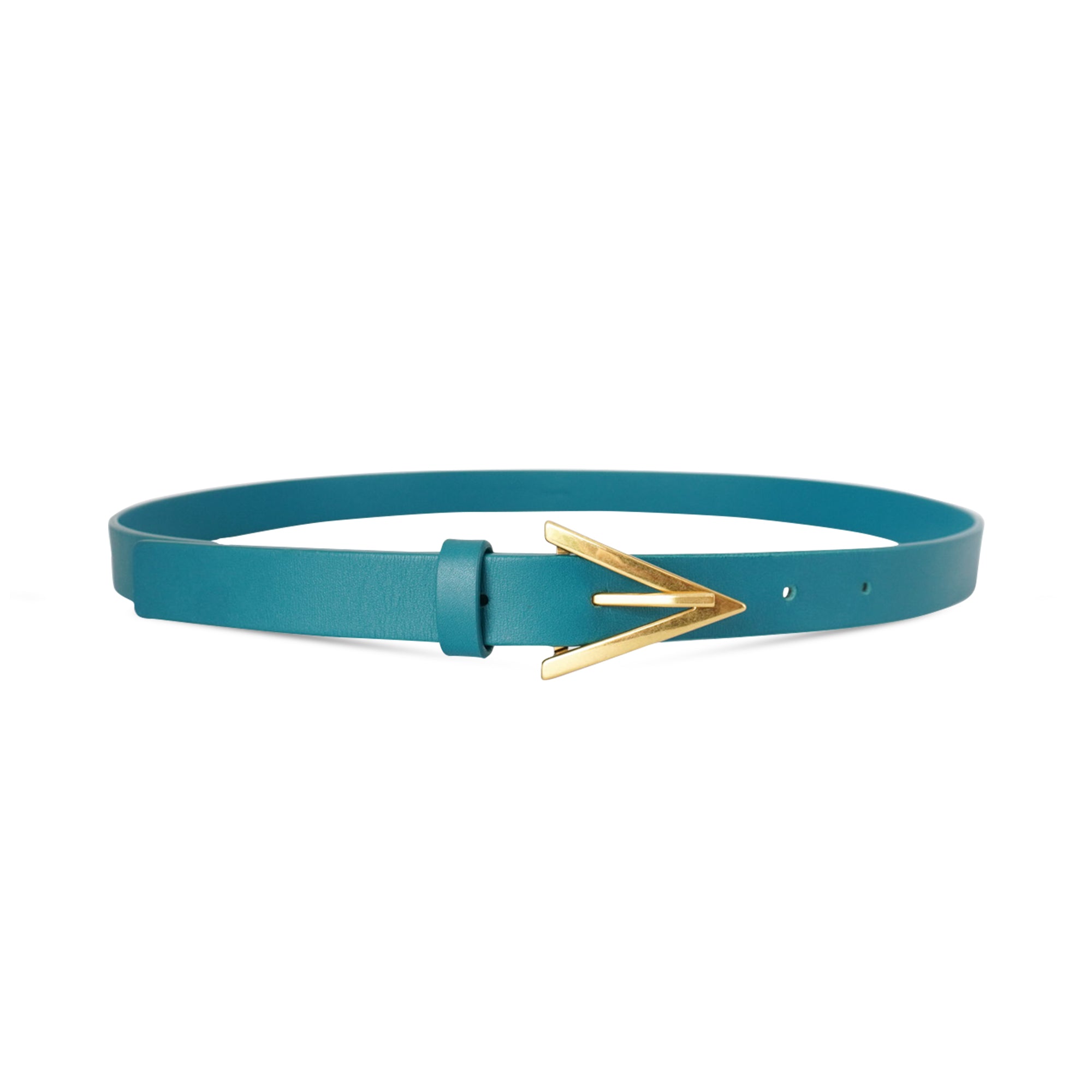 Bottega Veneta 'Triangle' belt in turquoise blue leather with a triangular gold pin buckle.