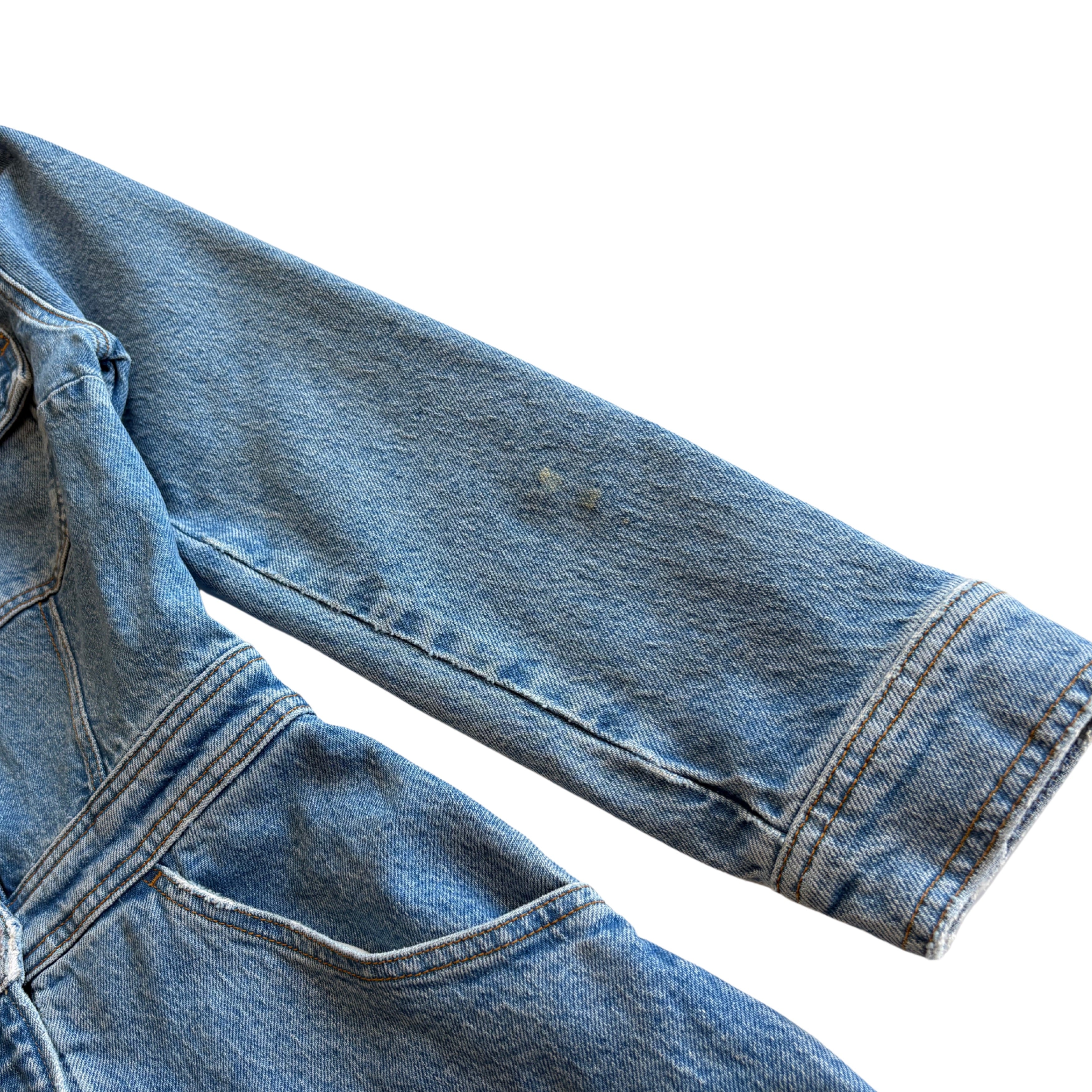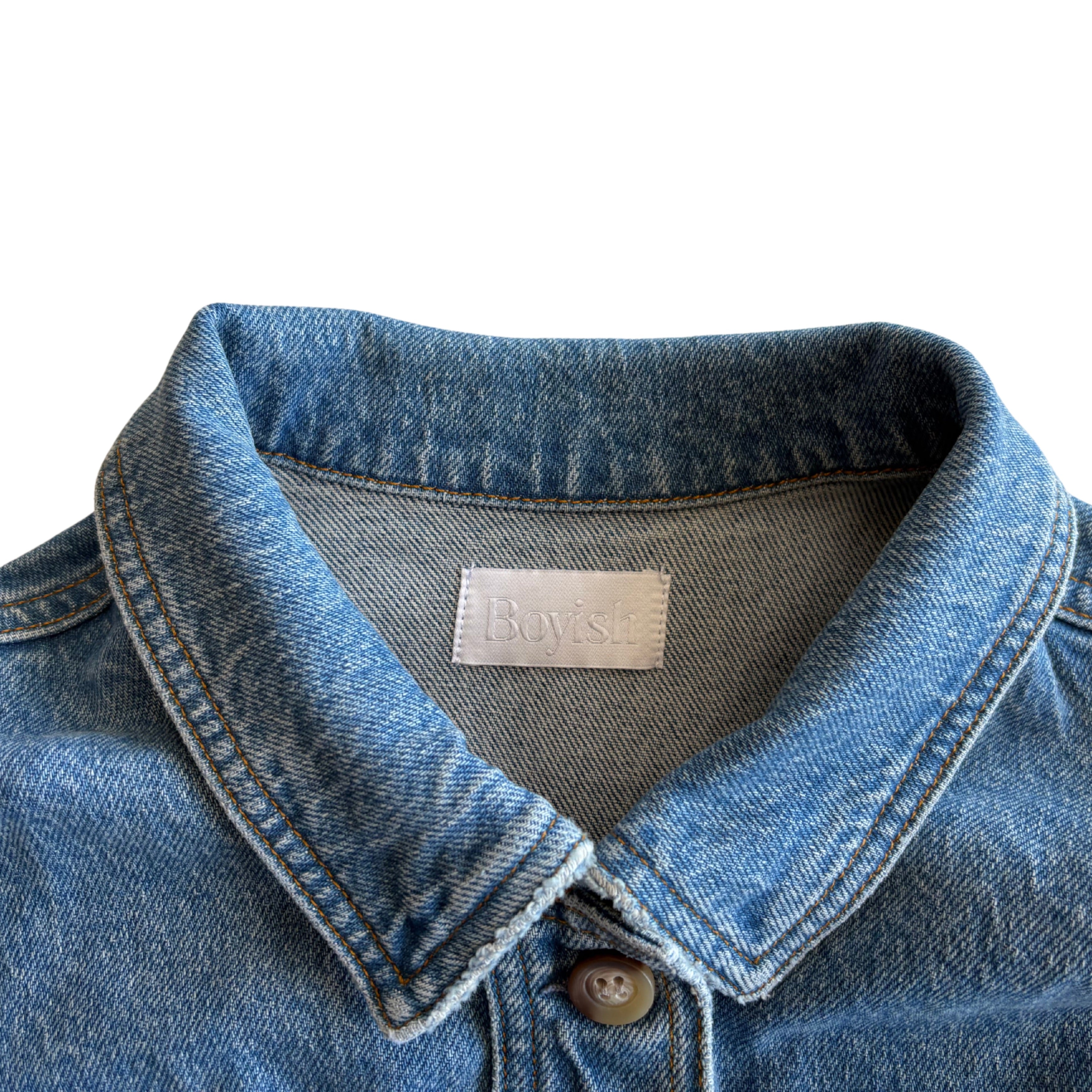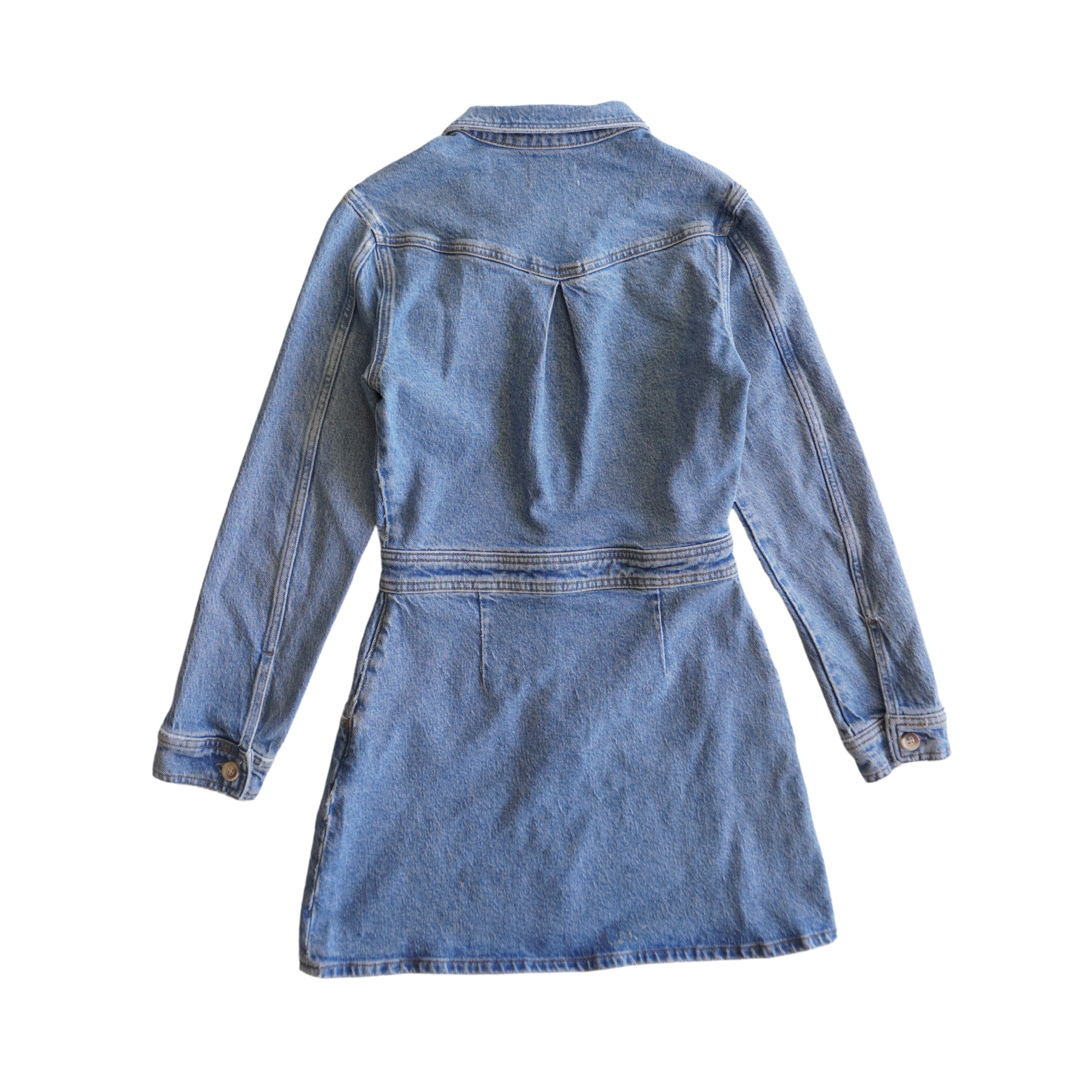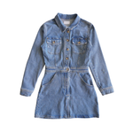 Boyish 'Skyler' long-sleeve collared denim dress in the wash 'Eternal Sunshine' with front flap chest pockets, waist slash pockets, and tortoise button closure.