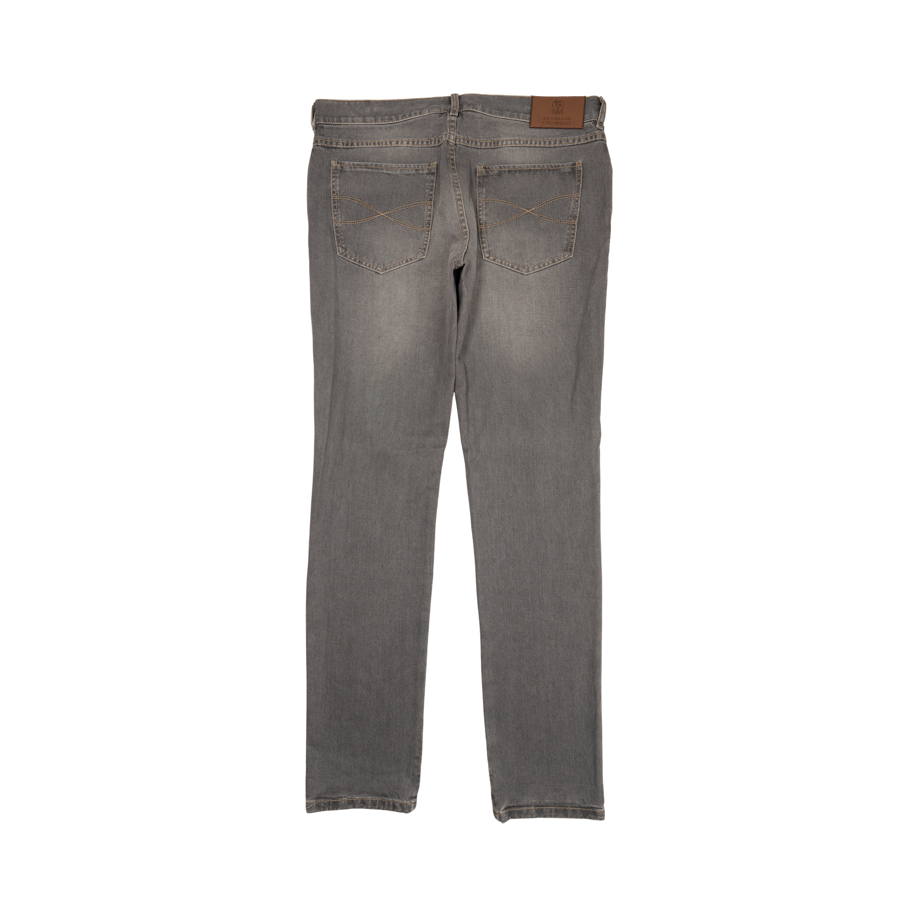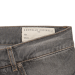 Brunello Cucinello slim-straight cut jeans in a light grey wash. Features a button fly with a silver logo button, hand pockets on the front and back, and a leather logo patch on the back waistband.