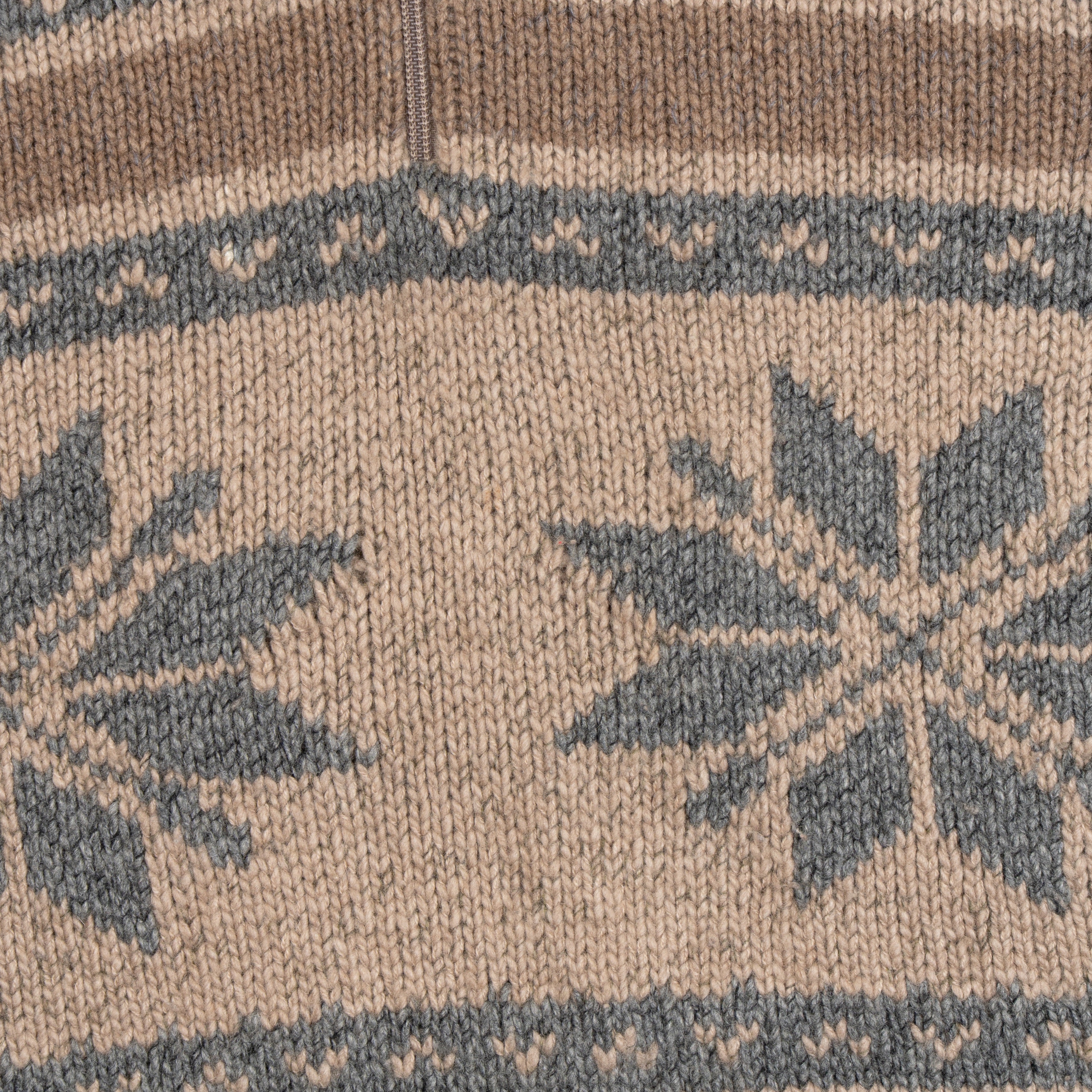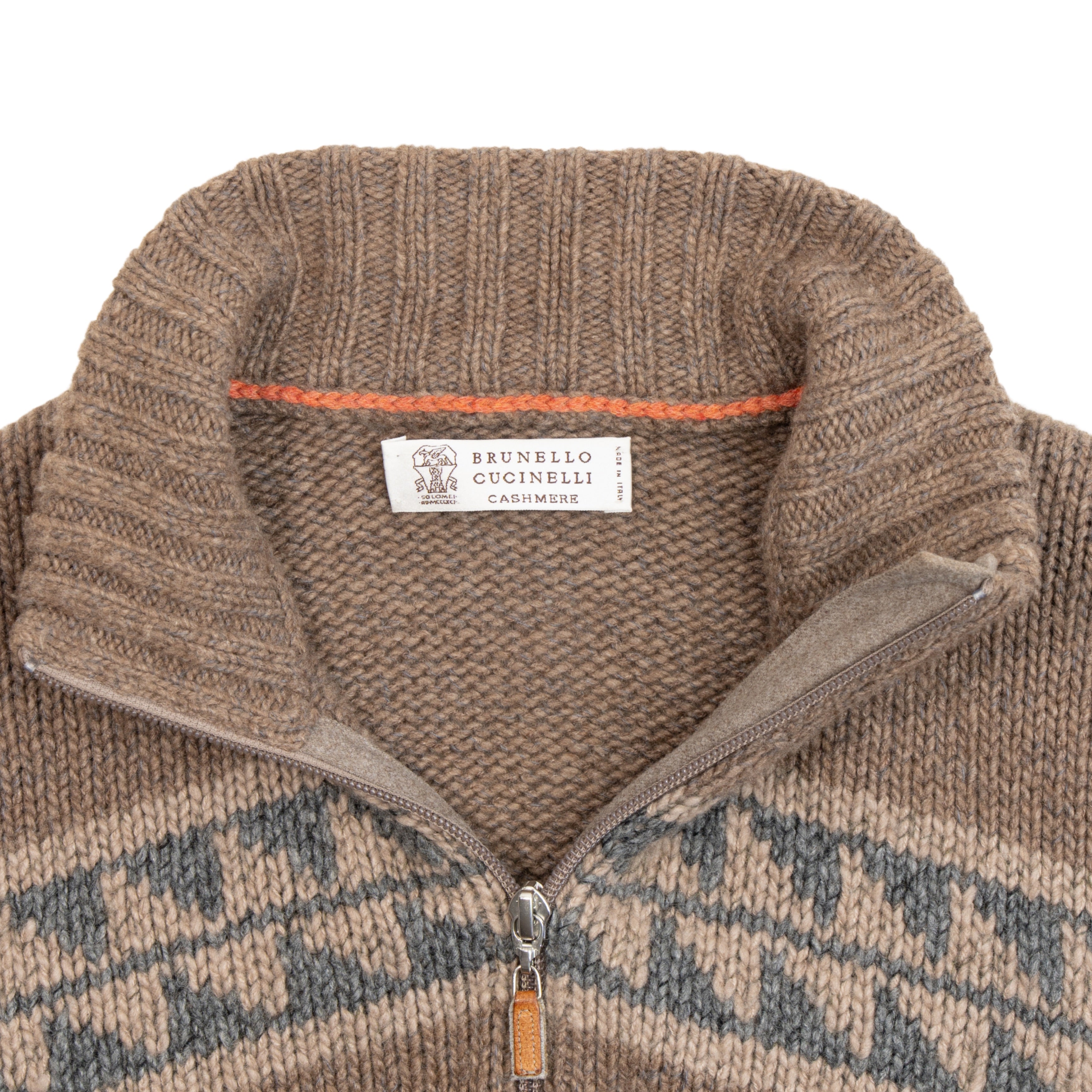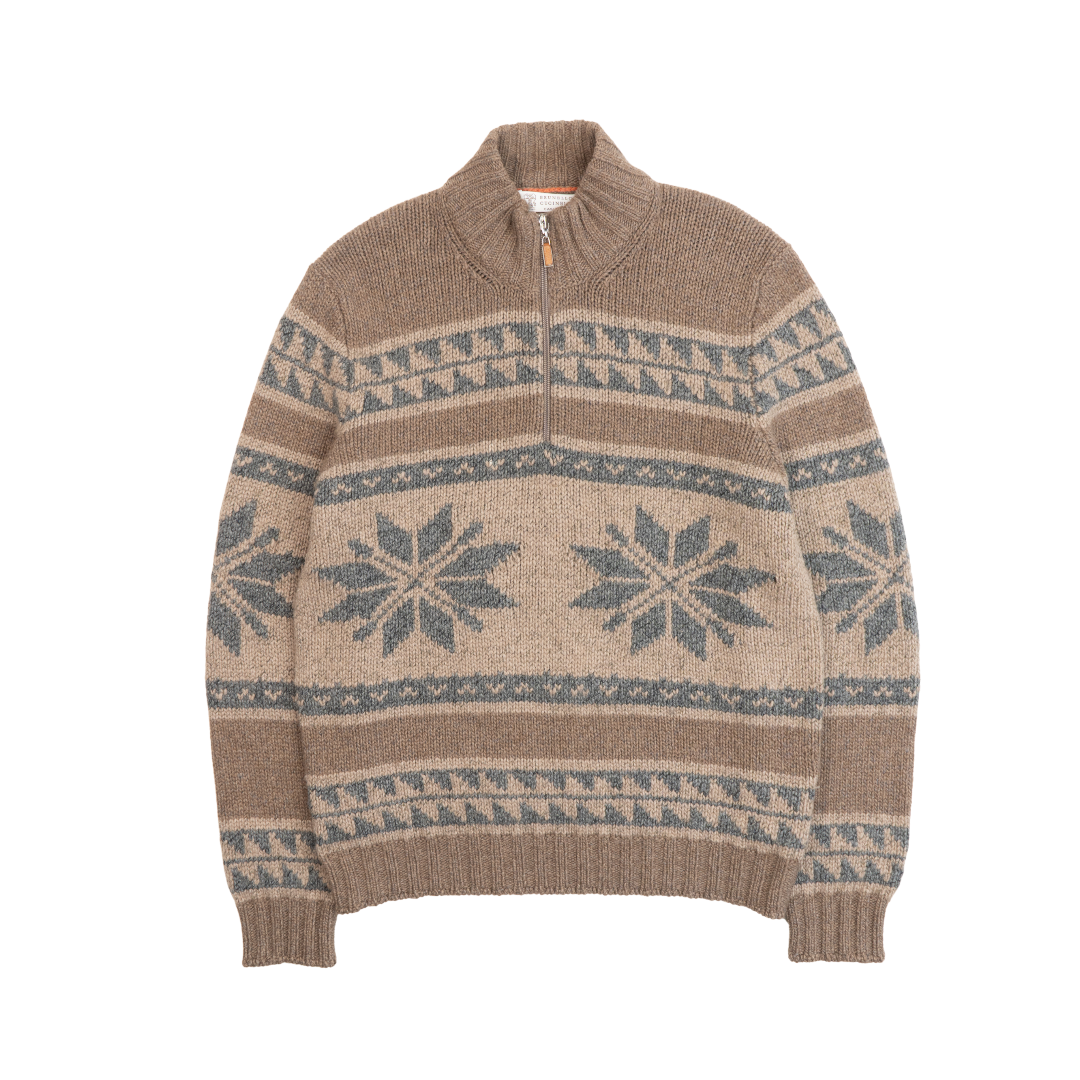 Brunello Cucinelli sweater in brown and grey knit cashmere with a snowflake graphic design, ribbed cuffs and hem, and a quarter zip opening in silver hardware.