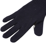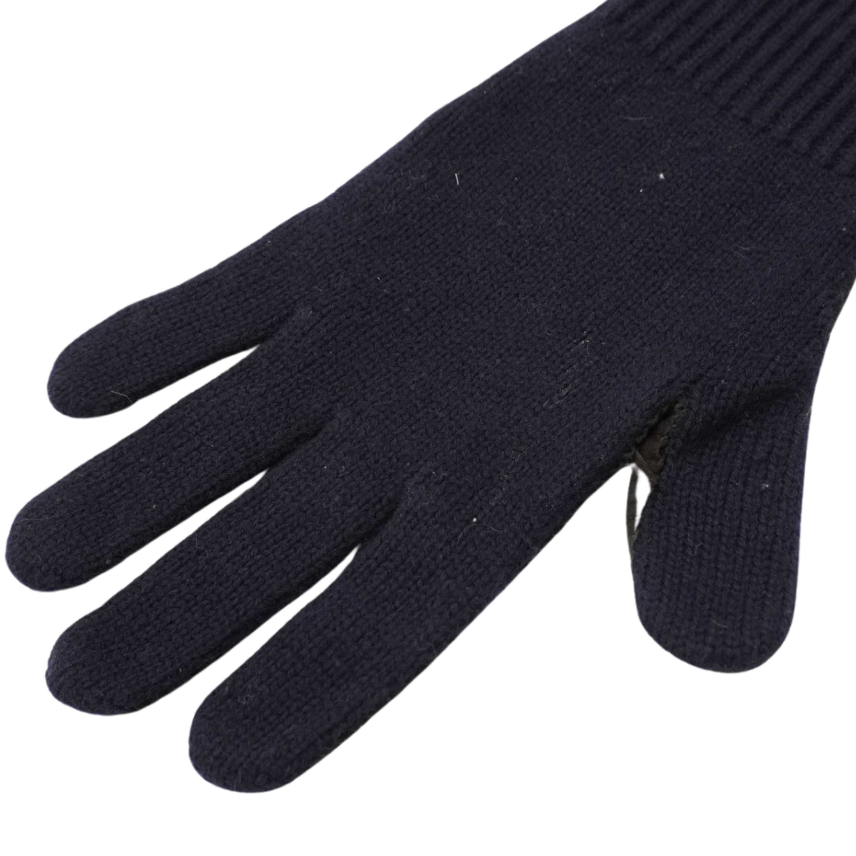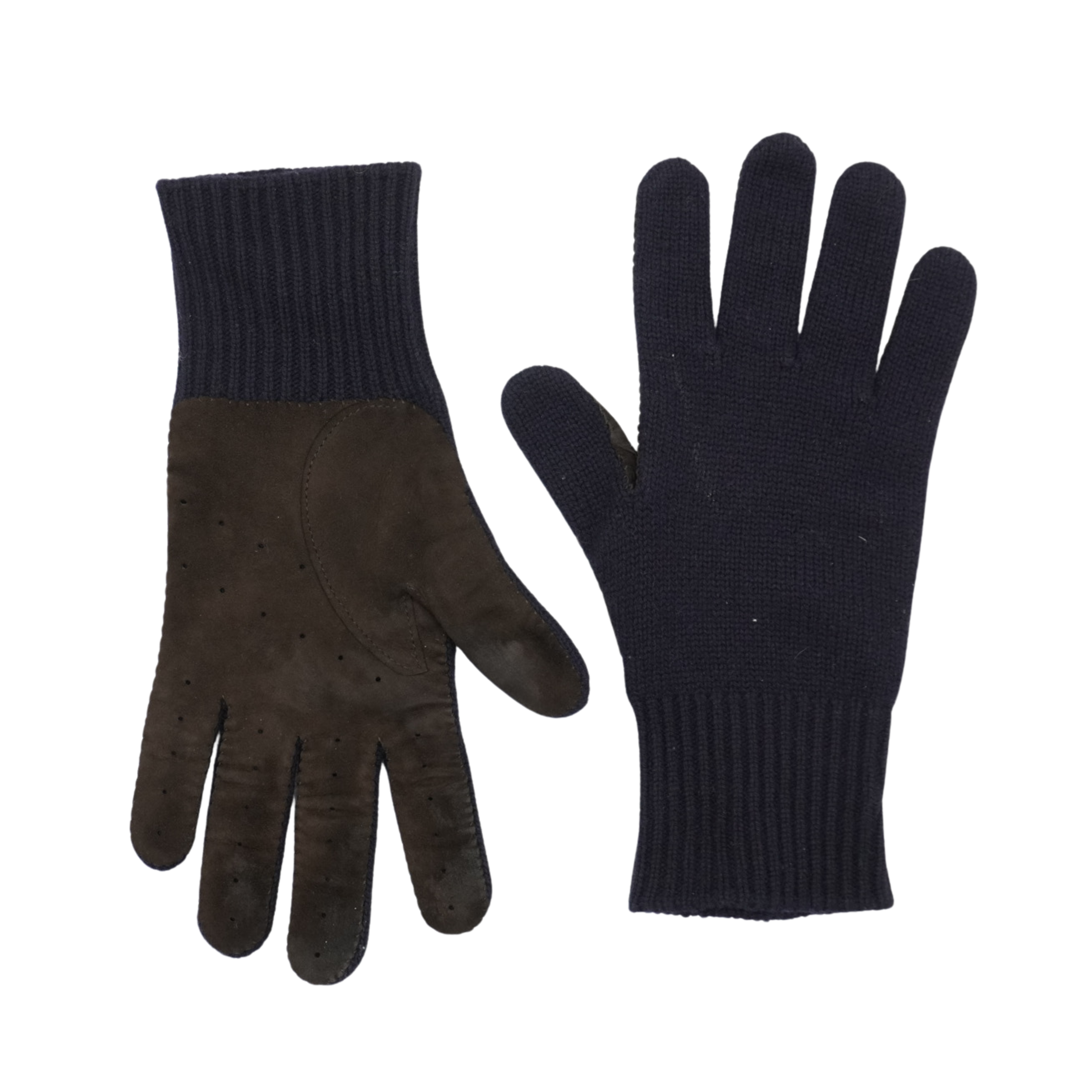 Brunello Cucinelli five finger gloves in navy knit cashmere with brown suede perforated reverse side and cashmere lining.