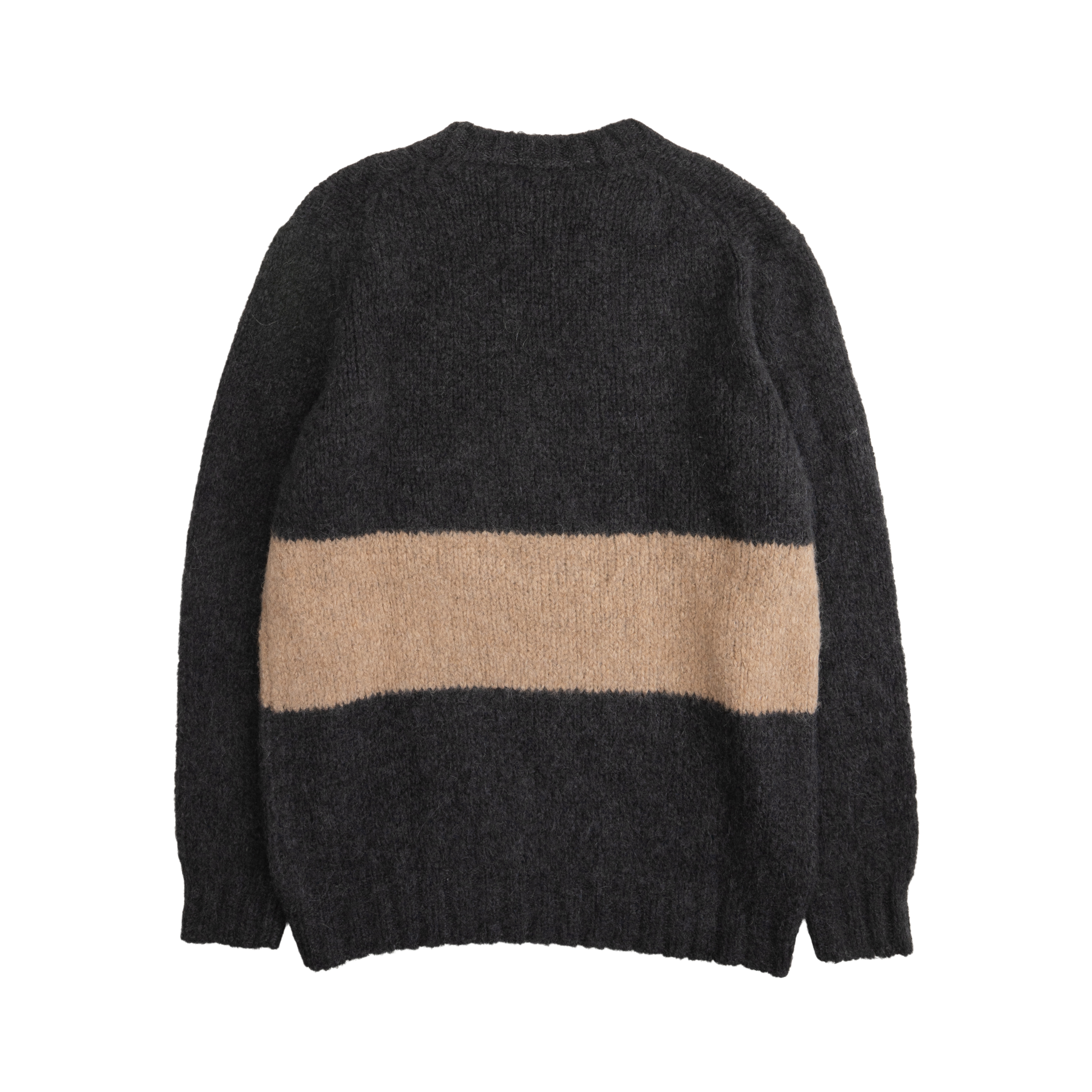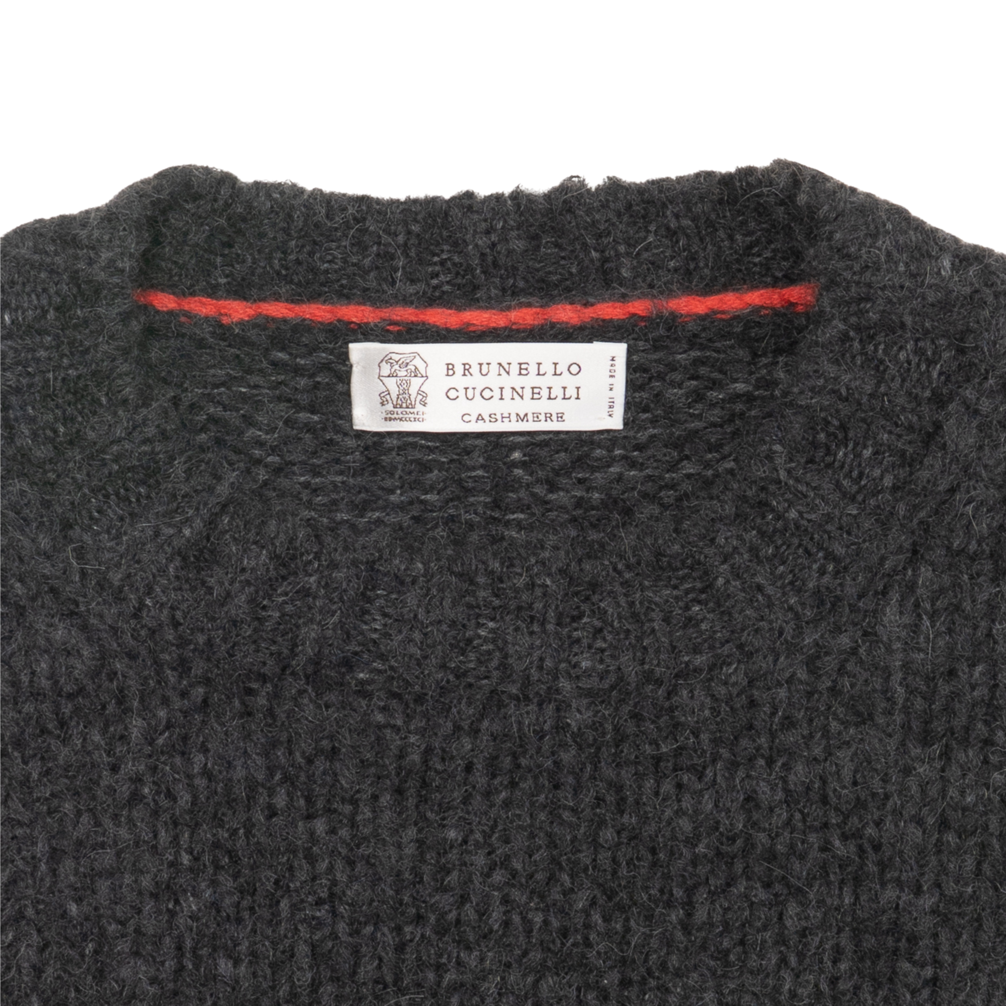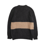 Brunello Cucinelli pullover knit sweater in dark grey with a tan stripe across the mid section.