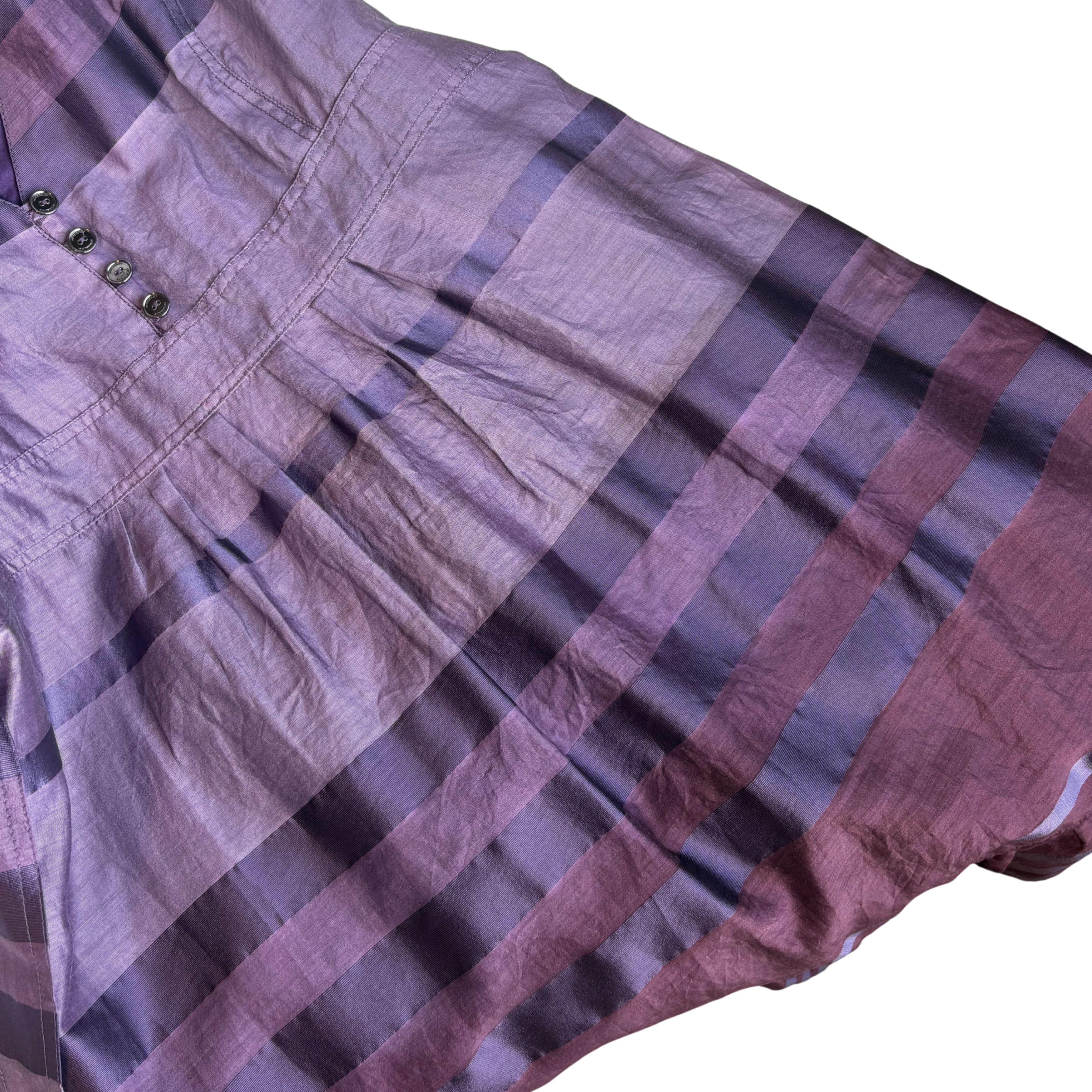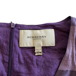 Burberry short-sleeve v-neck aline dress in purple horizontal stripe glossy cotton pattern with a waist tie, metallic silver chrome button closure, and back invisible zipper closure.
