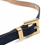 Burberry thin belt in navy blue suede leather with square pin buckle in soft gold hardware.
