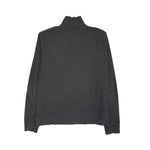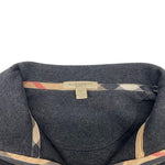 Burberry Brit quarter-zip long sleeve sweater in dark grey cotton. Features beige novacheck interior trim, grey embroidered logo on the chest, and gunmetal hardware.
