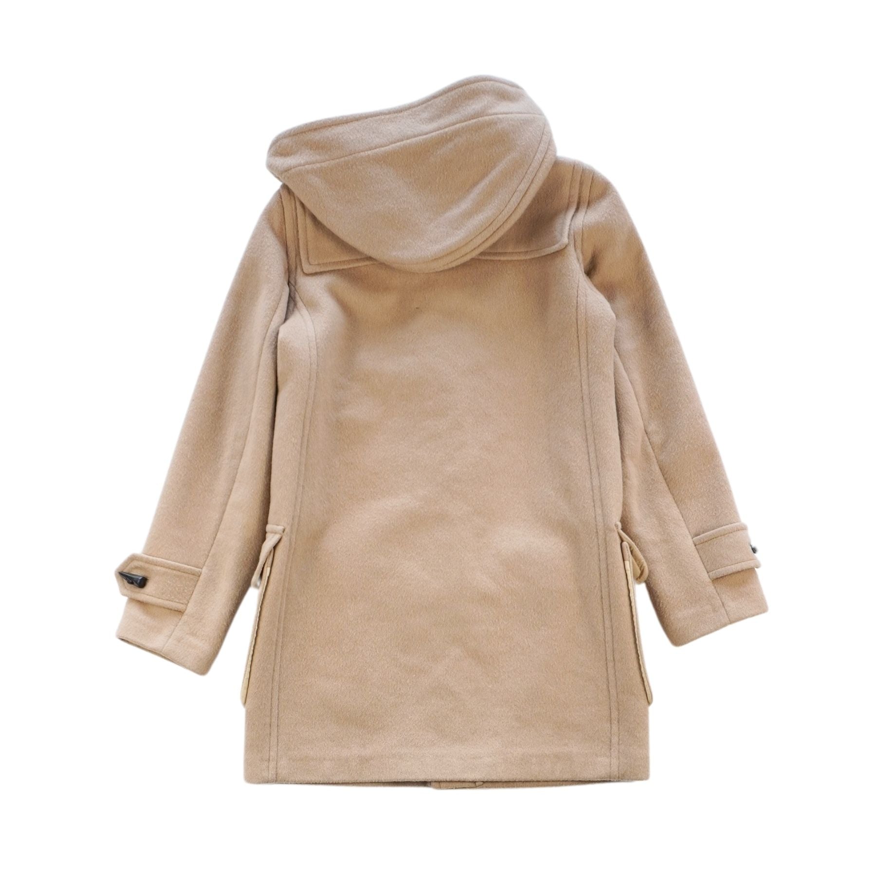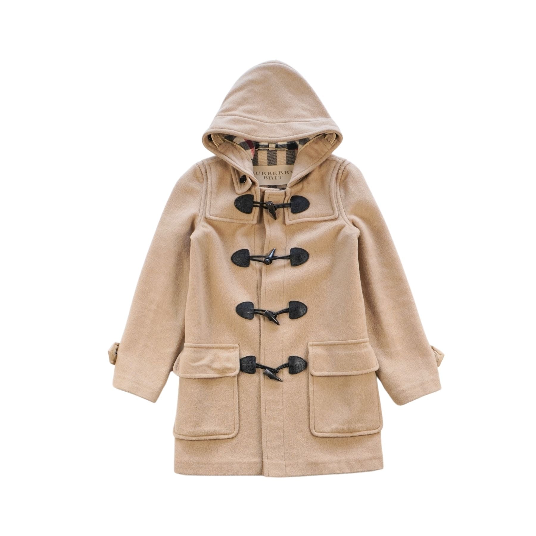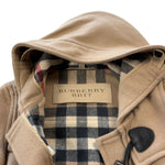 Burberry Brit coat in tan wool with a a front toggle closure with black leather straps, large front flap pockets, novacheck printed inner lining, and a hood.