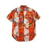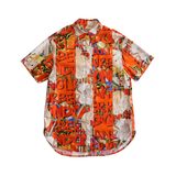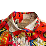 Burberry button-down shirt in red cotton-silk blend with an all-over multicolour ornate logo print, a hidden front-button closure, and a large chest pocket.