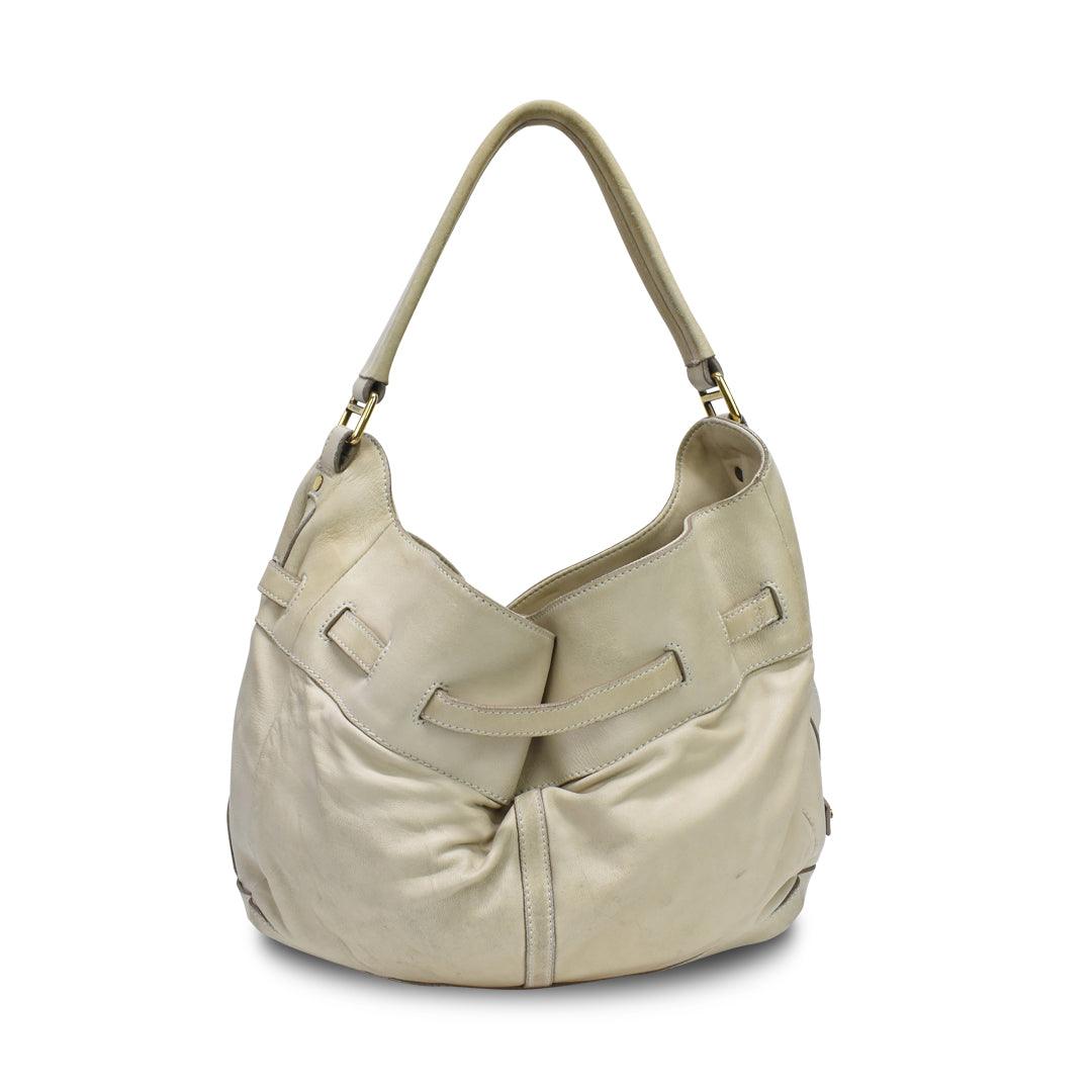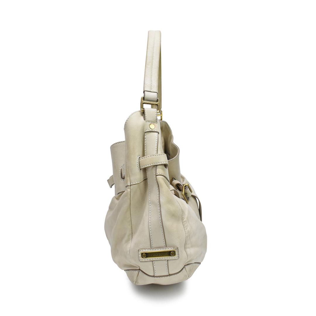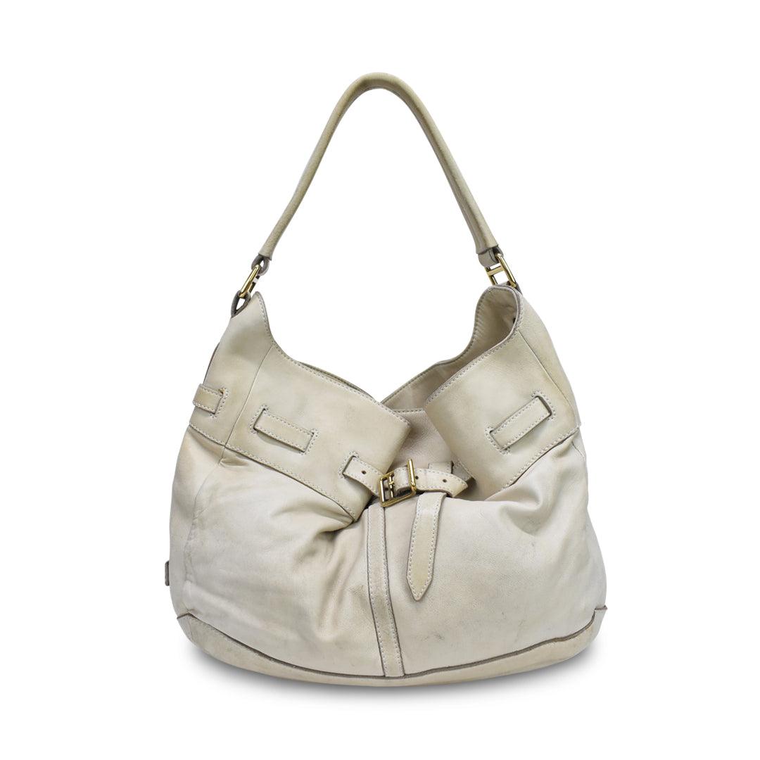 Burberry Hobo Shoulder Bag in cream leather with belted detailing in gold hardware. Features top push button closure, inner zip compartment, inner zip pocket, and monogram canvas lining.