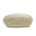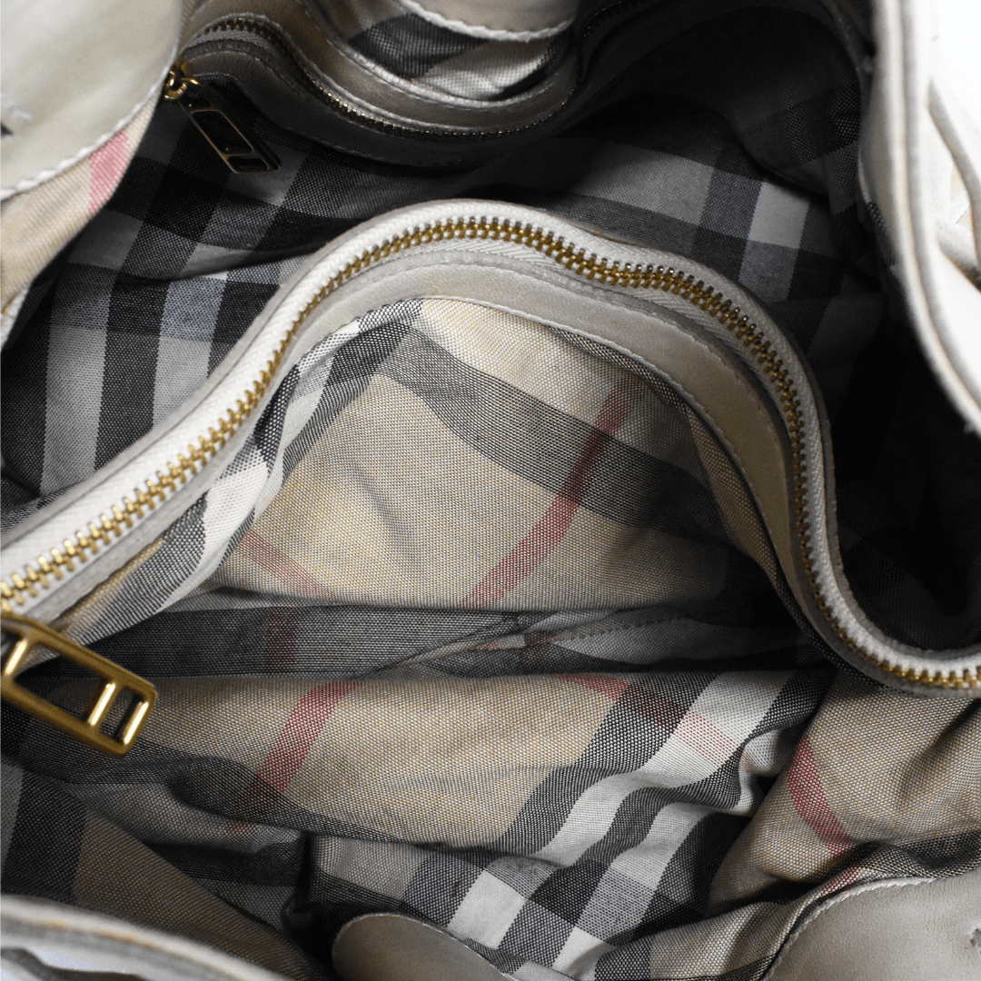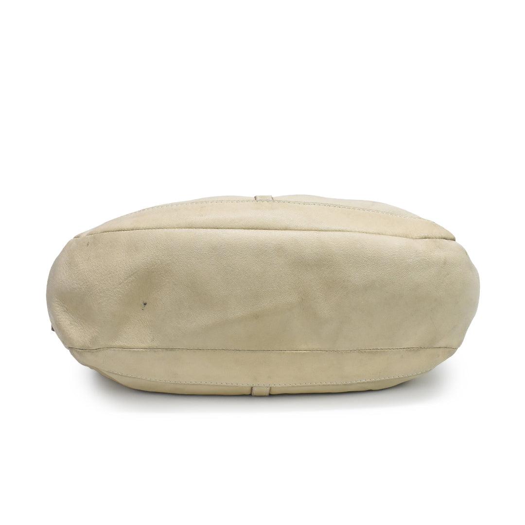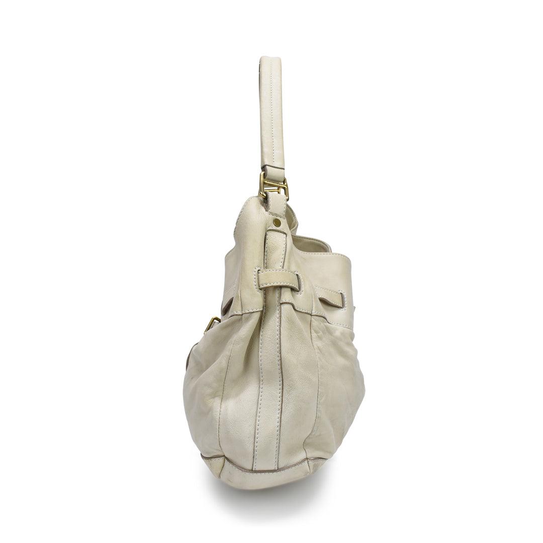 Burberry Hobo Shoulder Bag in cream leather with belted detailing in gold hardware. Features top push button closure, inner zip compartment, inner zip pocket, and monogram canvas lining.