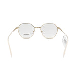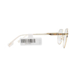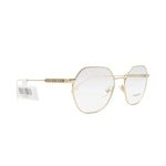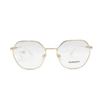 Burberry eye glasses in gold metal with a hexagonal frame, a novacheck patterned enamel detail on the arms, and clear matte acetate trim at the ends.