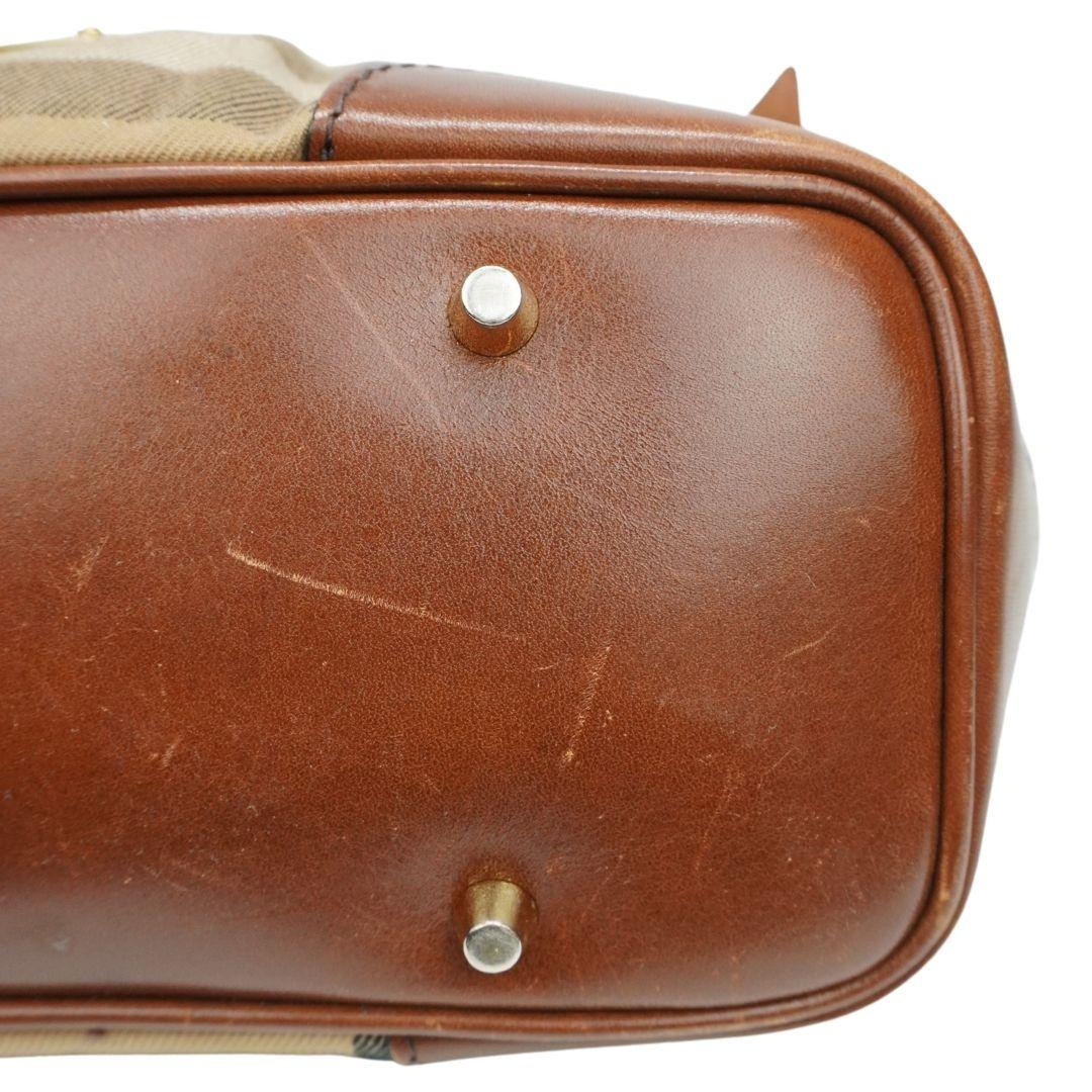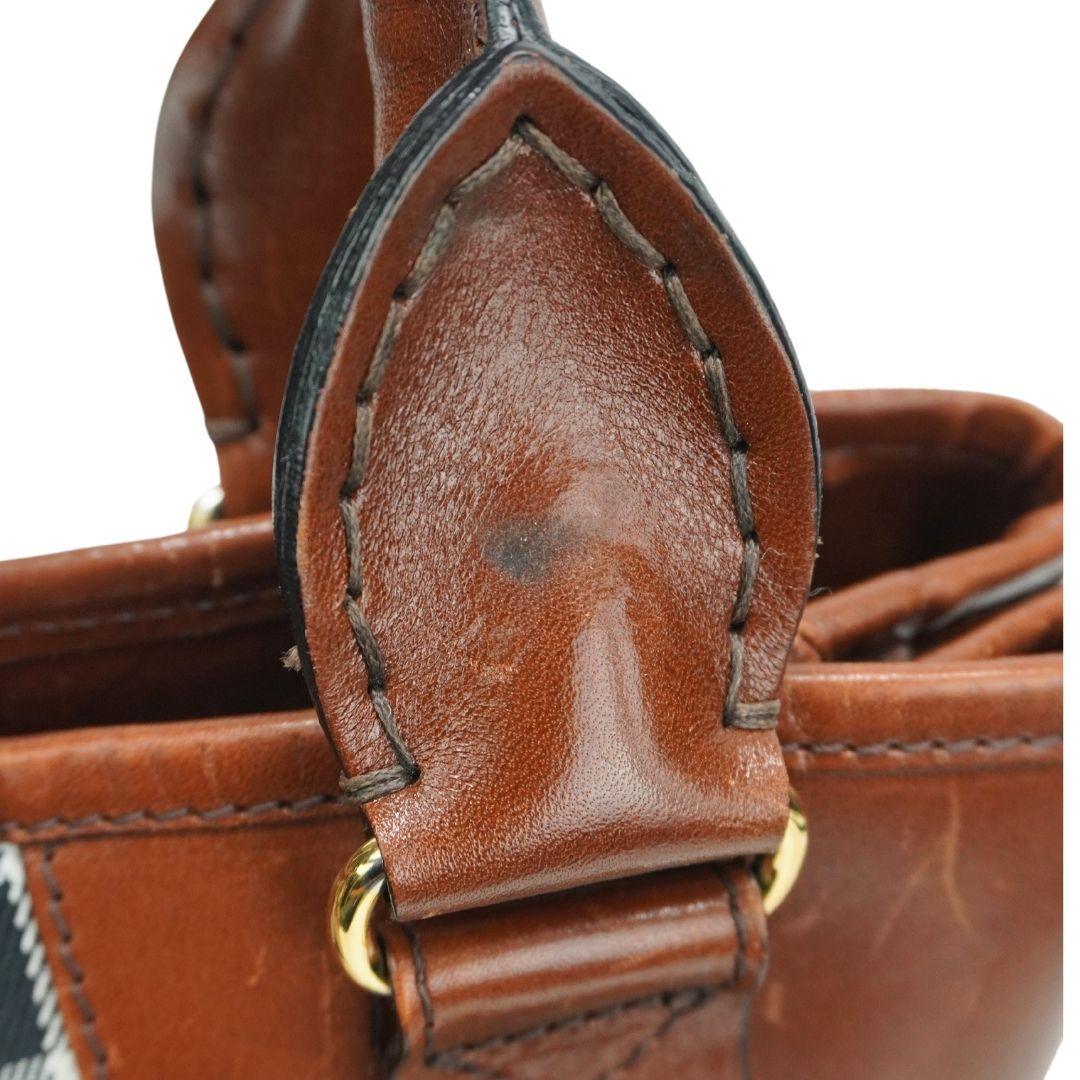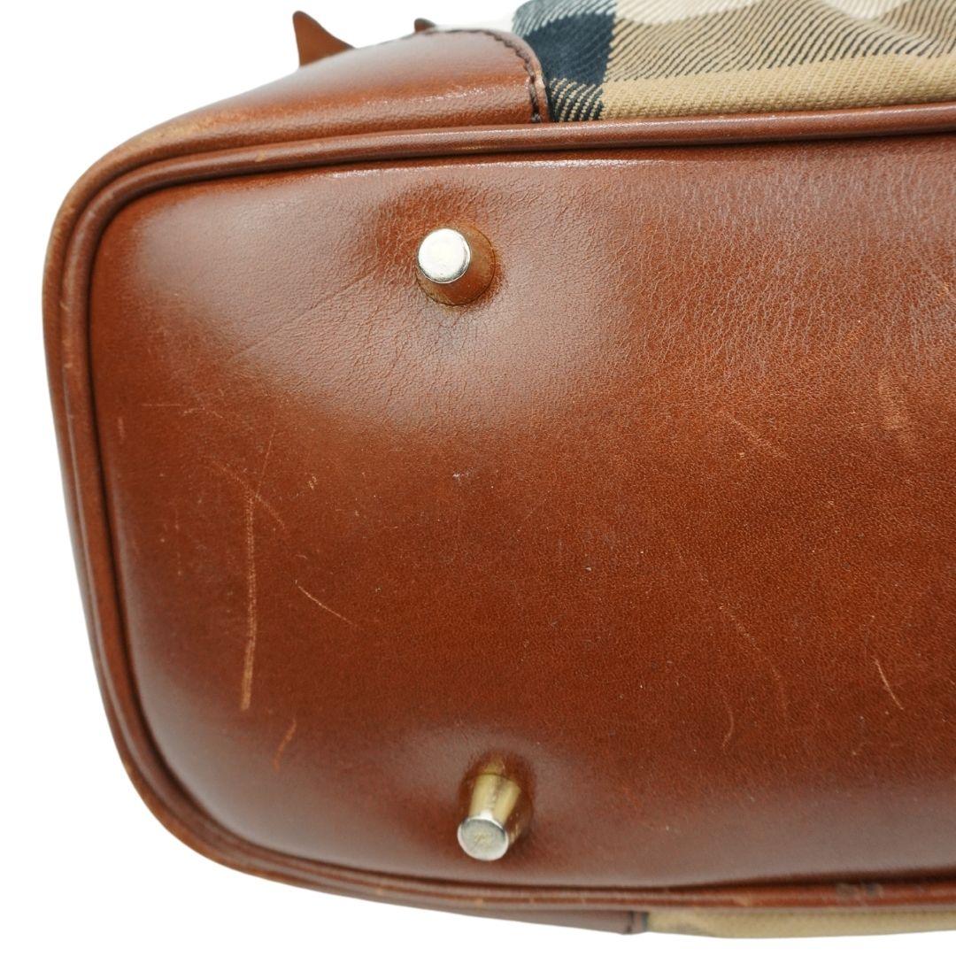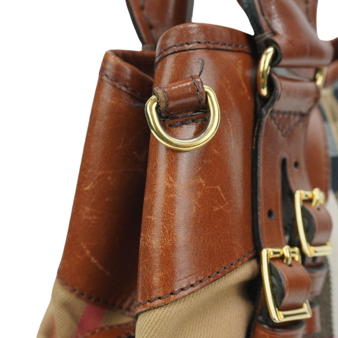 Burberry shoulder bag in beige nova check canvas with dark brown leather trim, buckle detailing, front pleats and logo plaque in gold hardware. Features dual rolled handles, removable shoulder strap and push button closure. Includes black canvas lining, inner zip and open pockets.