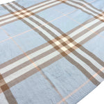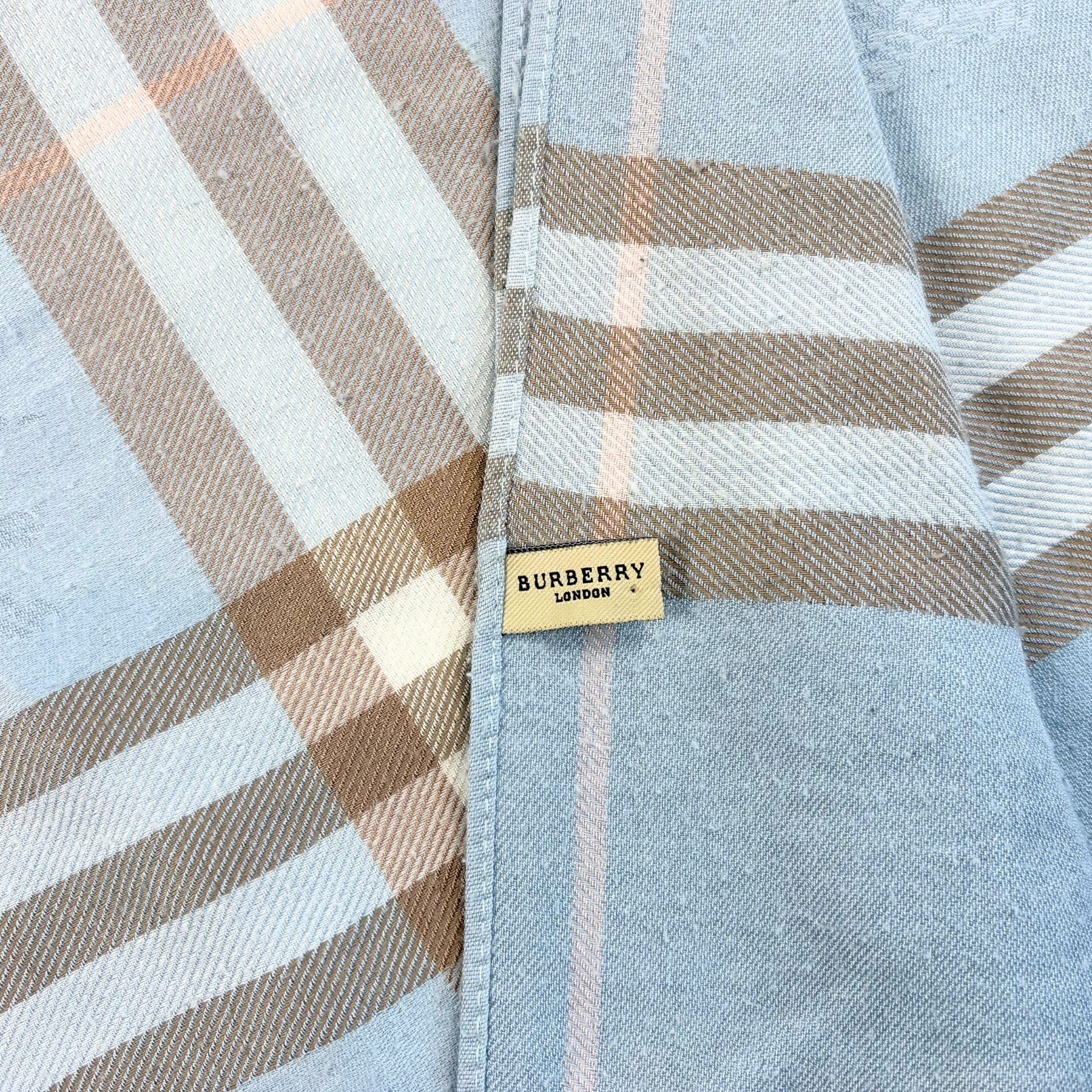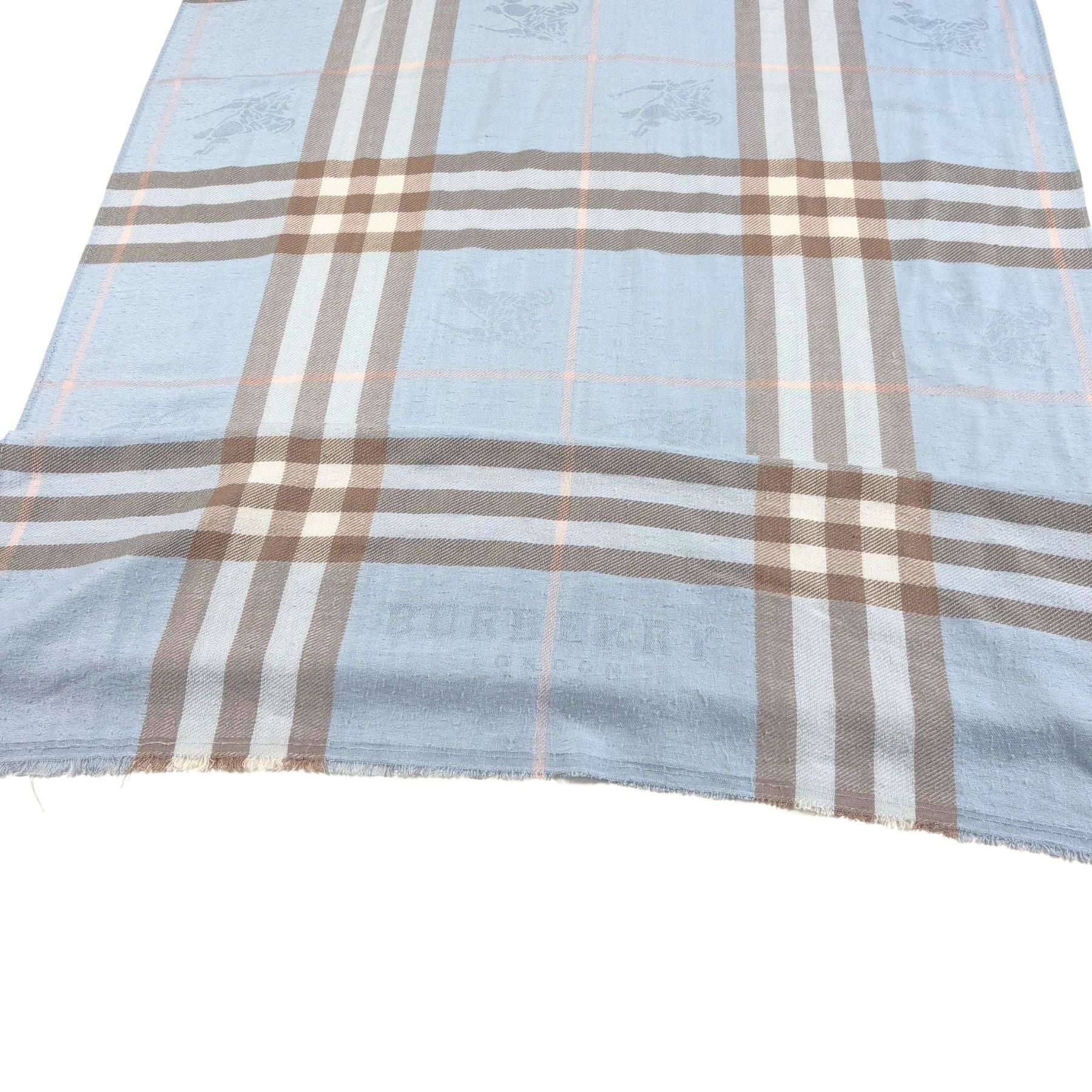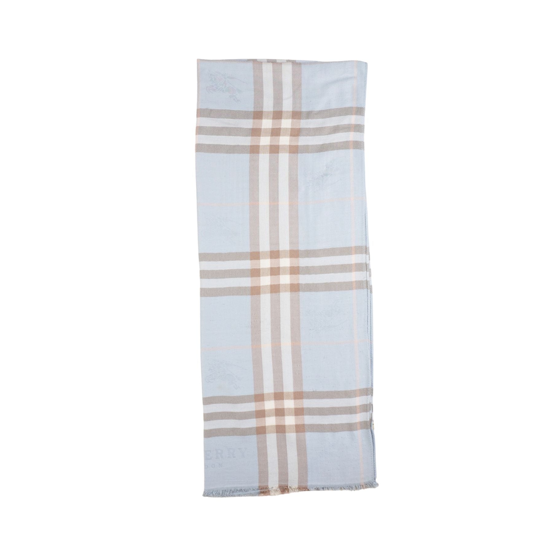 Burberry scarf in a light blue novacheck printed cashmere-silk blend with a short fringe trim on the ends and a tonal logo.