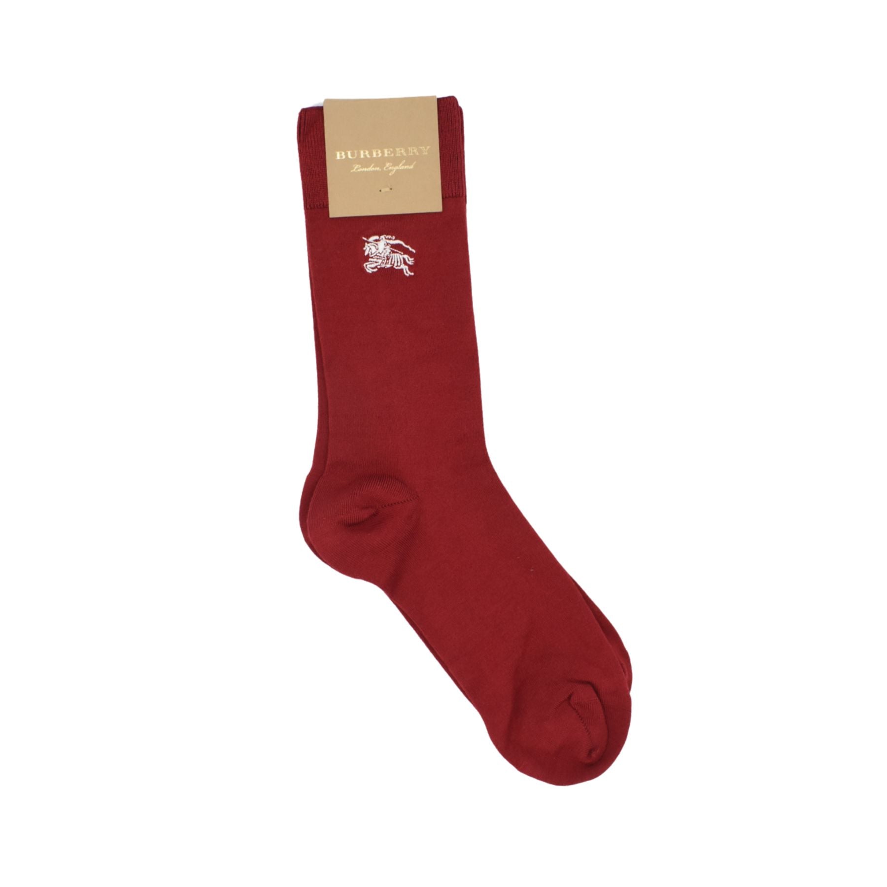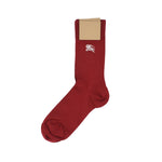 Burberry socks in a burgundy red silk blend with a white embroidered knight logo.
