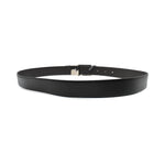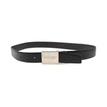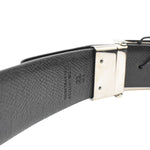 Burberry reversible textured leather belt with black on one side and brown on the other. Features a silver plaque buckle with logo engraving.