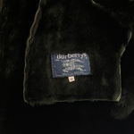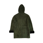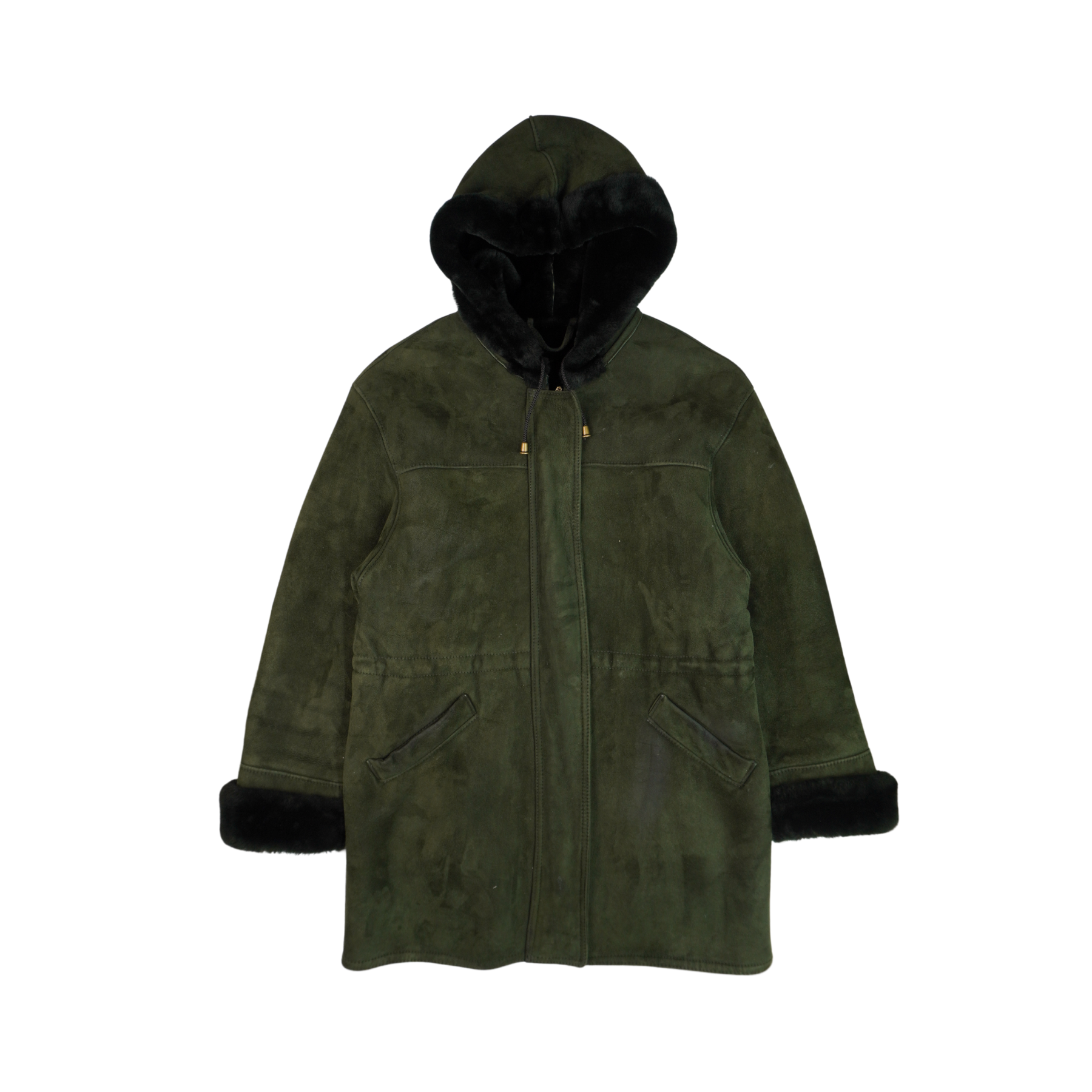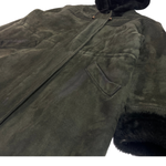 Burberry mid-length shearling jacket in dark olive green suede with green fur lining. Features a fur trim hood, an adjustable drawstring waist, a zip and button-up closure, fur trim cuffs, adjustable drawstrings at the hood, gold hardware, and two slip pockets on the front.