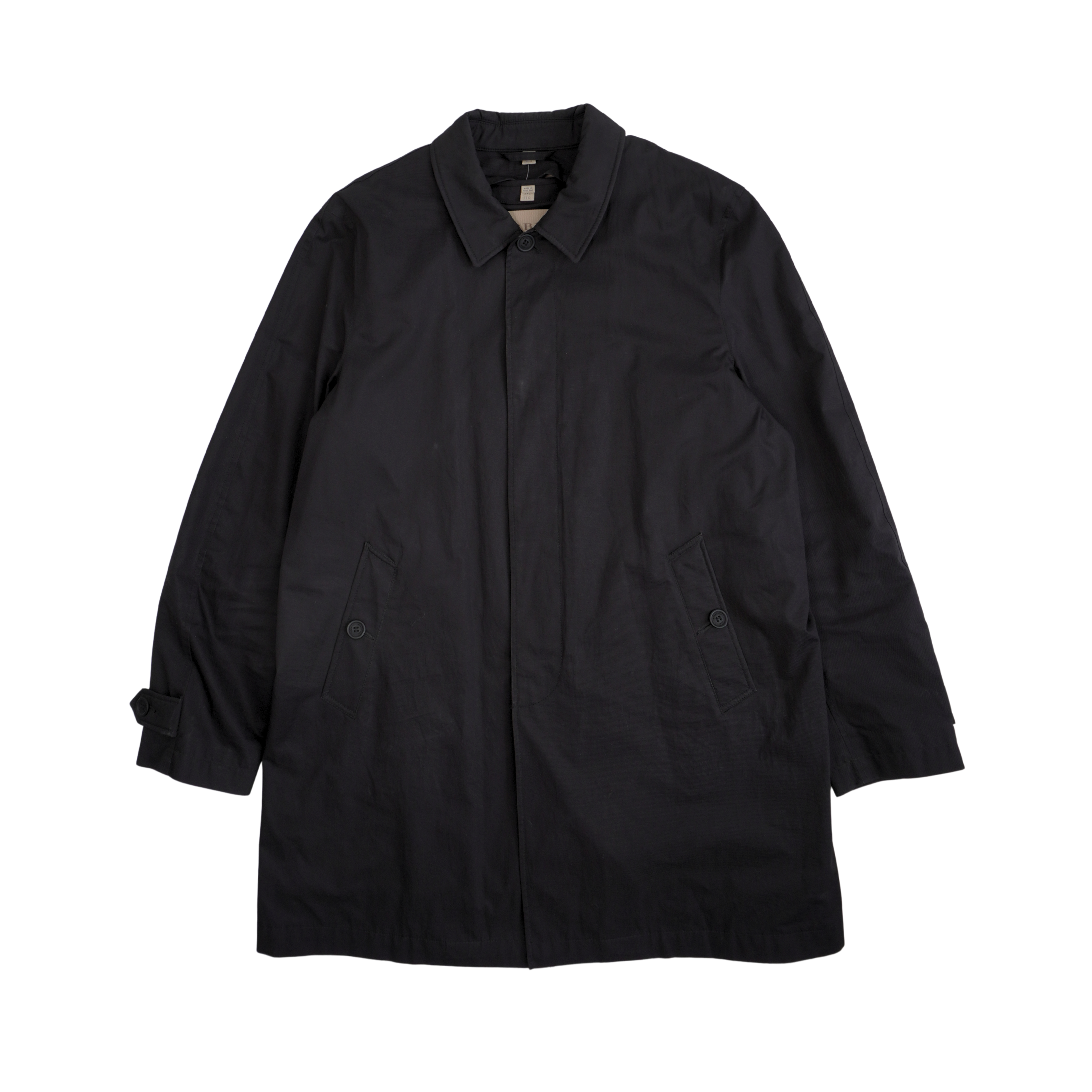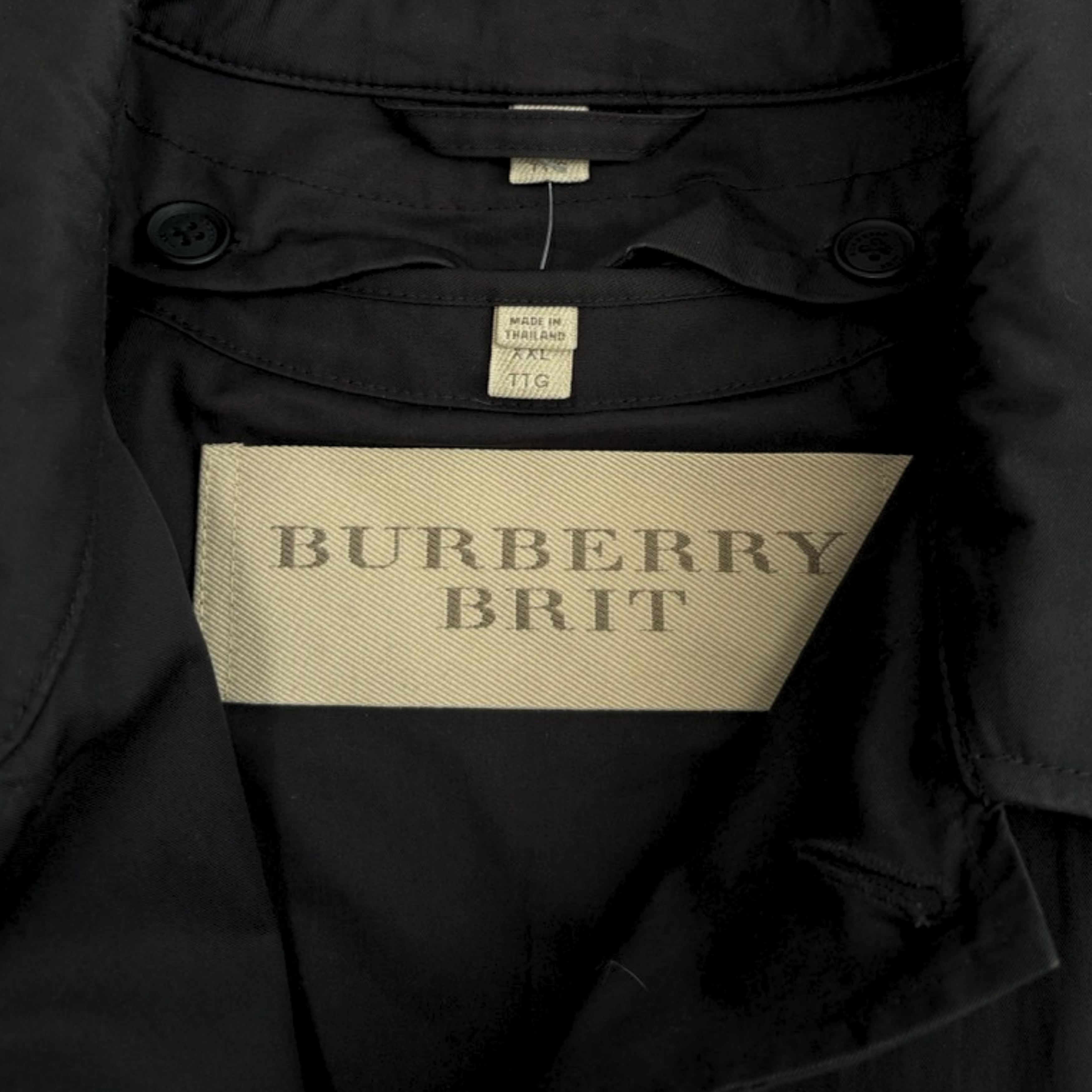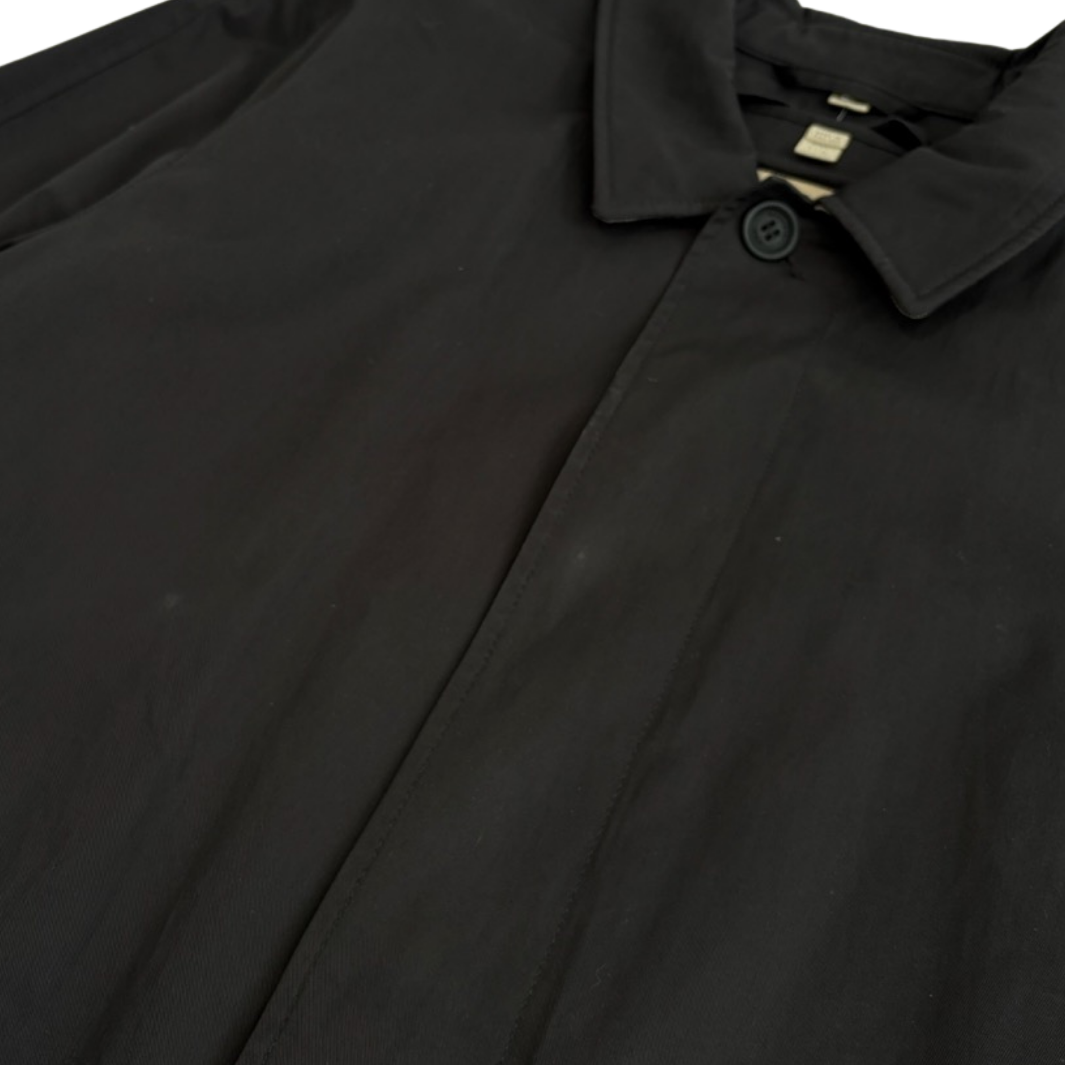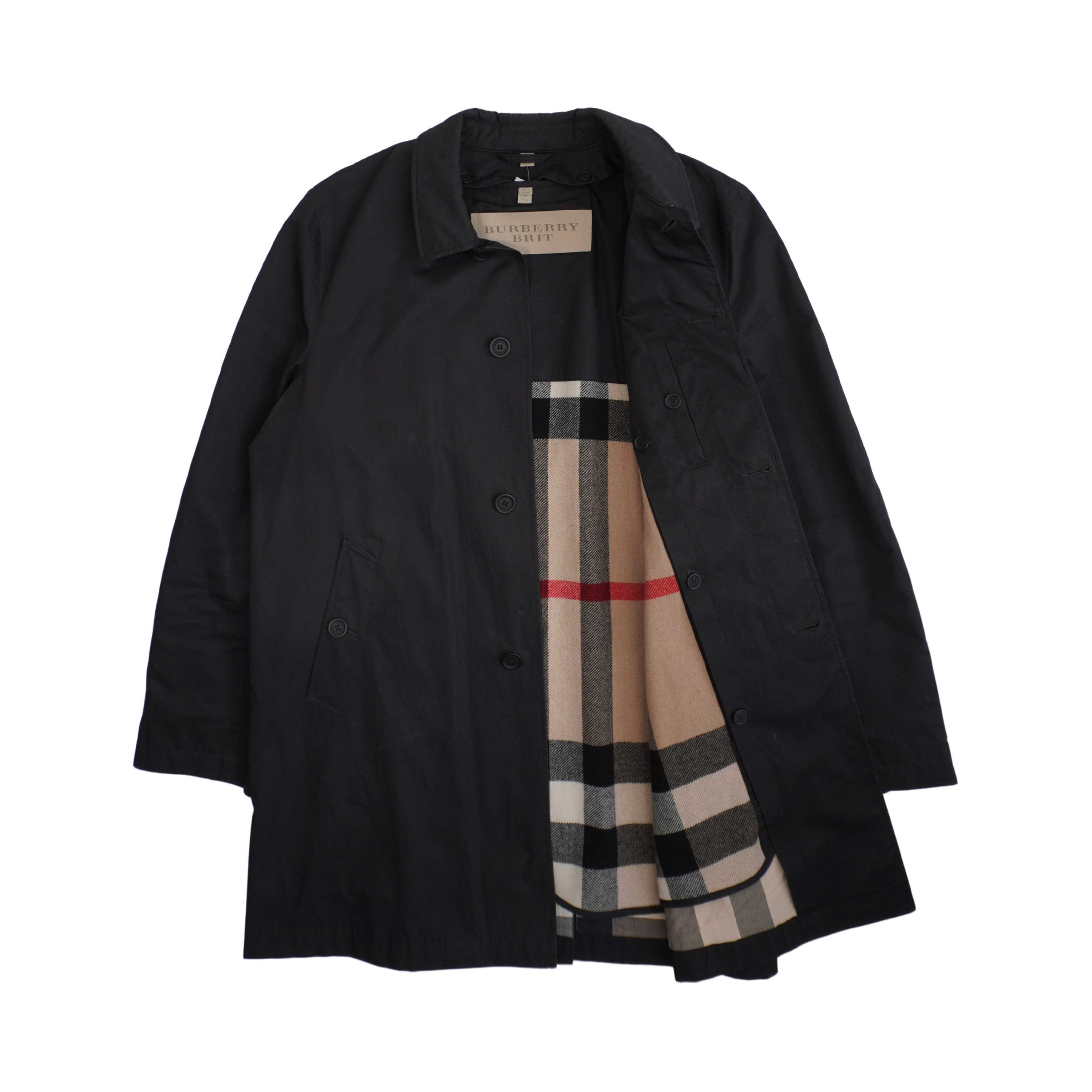 Burberry Brit mid length trench coat in black cotton with front hidden button placket, two front welt pockets, and back vent. Features a novacheck detachable wool lining.