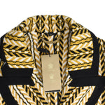 Burberry double-breasted knee-length jacket in yellow, black, and white chevron patterned wool with long sleeves, a notched lapel, and fringe detailing on the shoulders. Features two top-flap pockets, large black buttons with embossed logo crest, black trim, and a back vent. From the F/W 2016 runway collection.