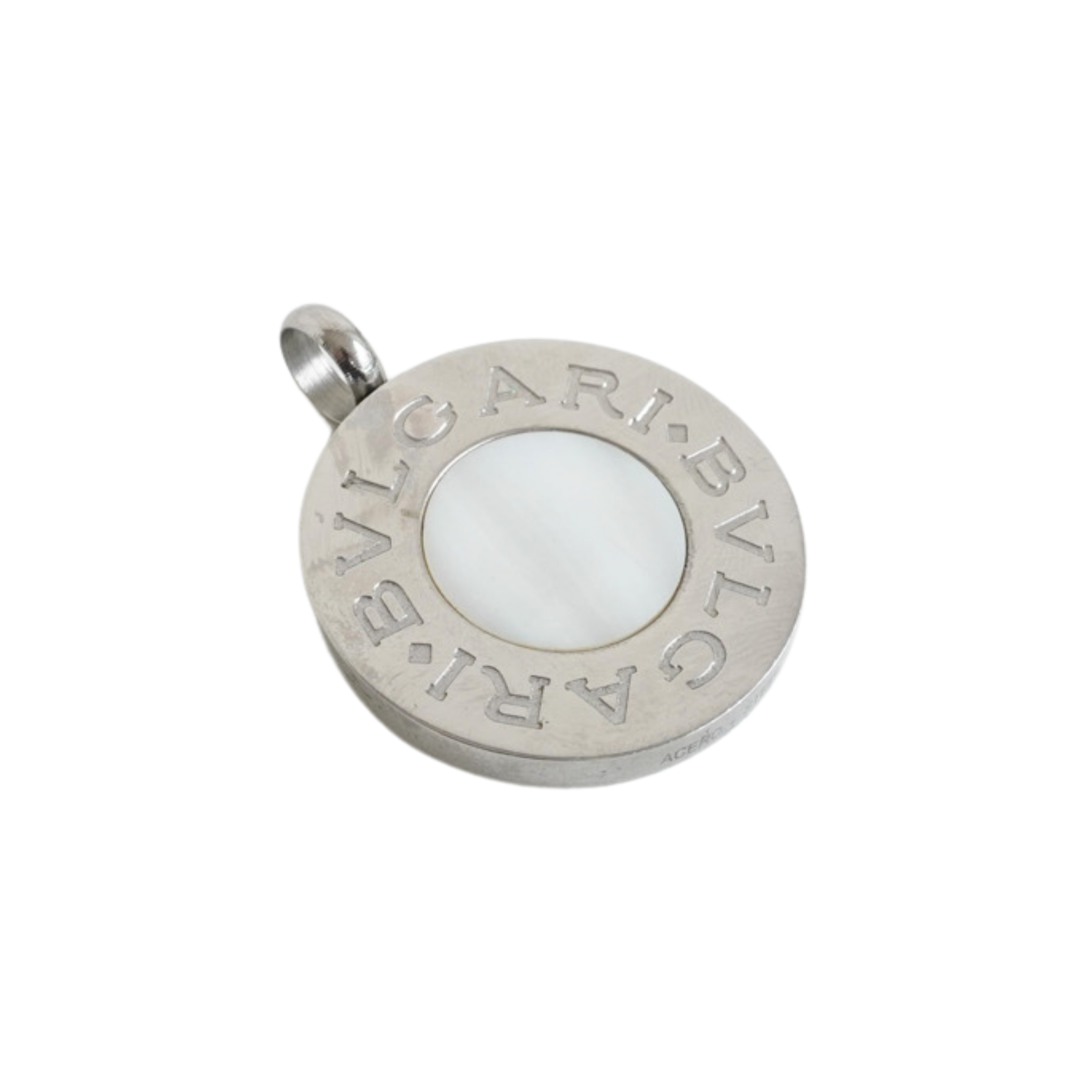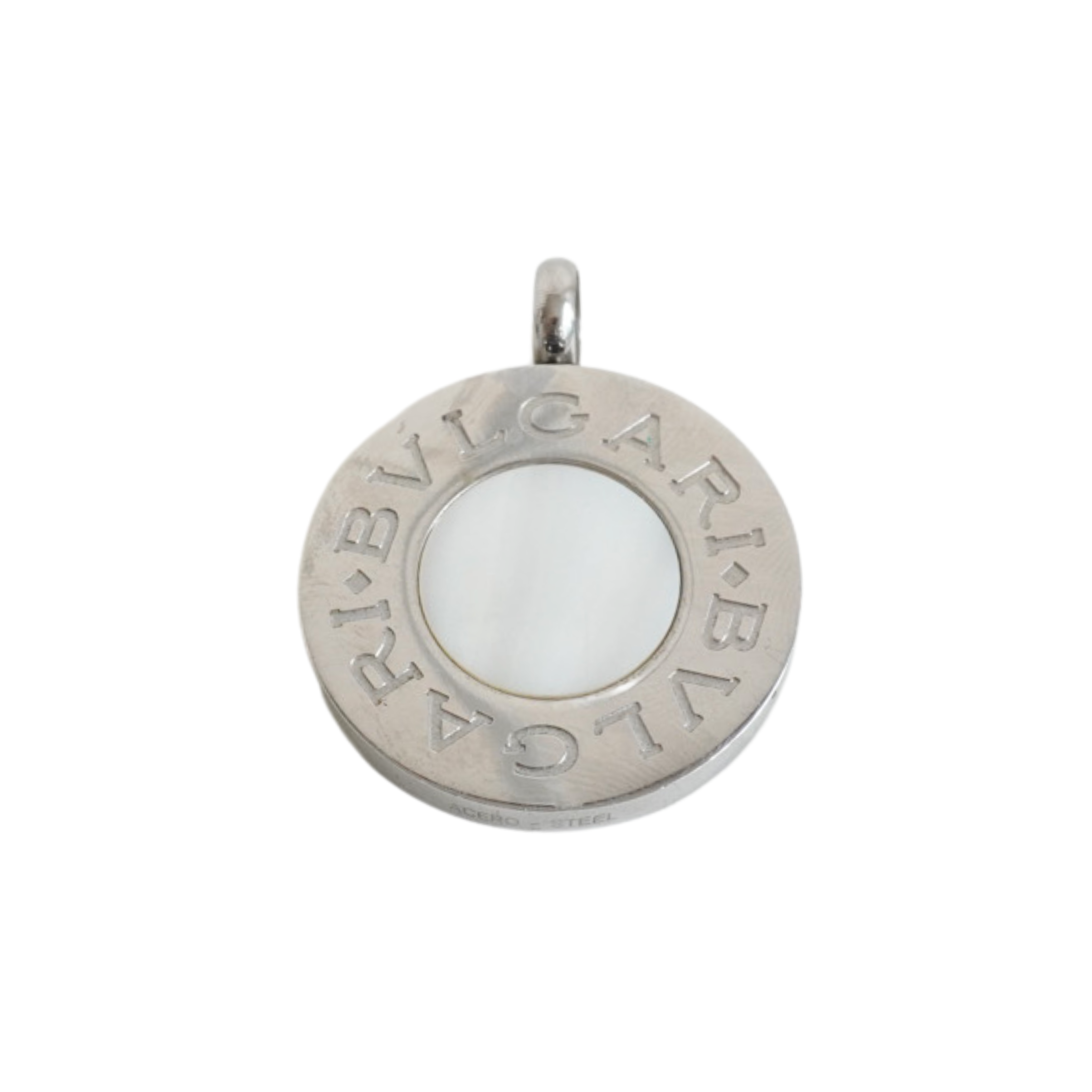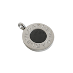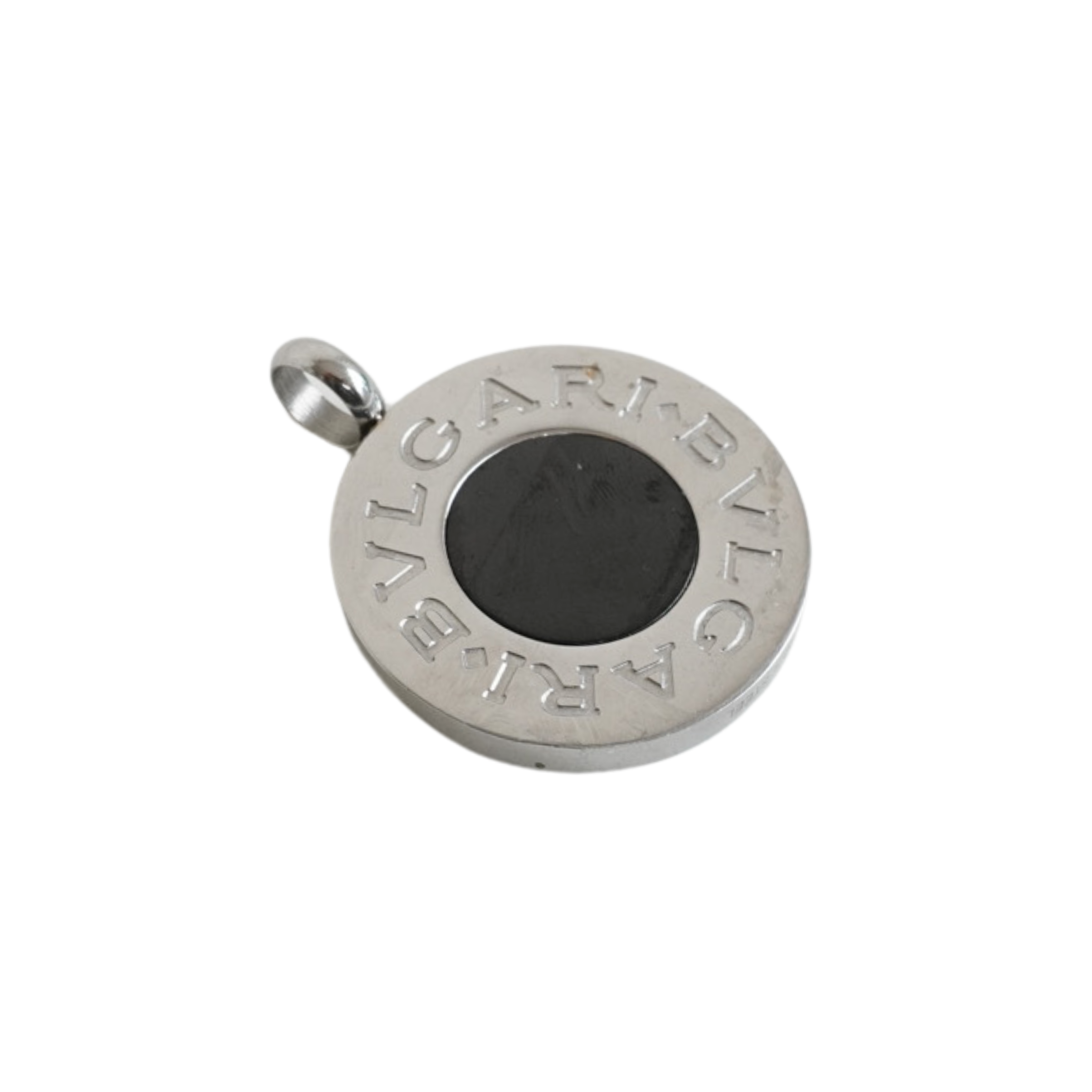 Bvlgari stainless steel reversible coin pendant with mother of pearl and onyx inlays surrounded by logo engraving.