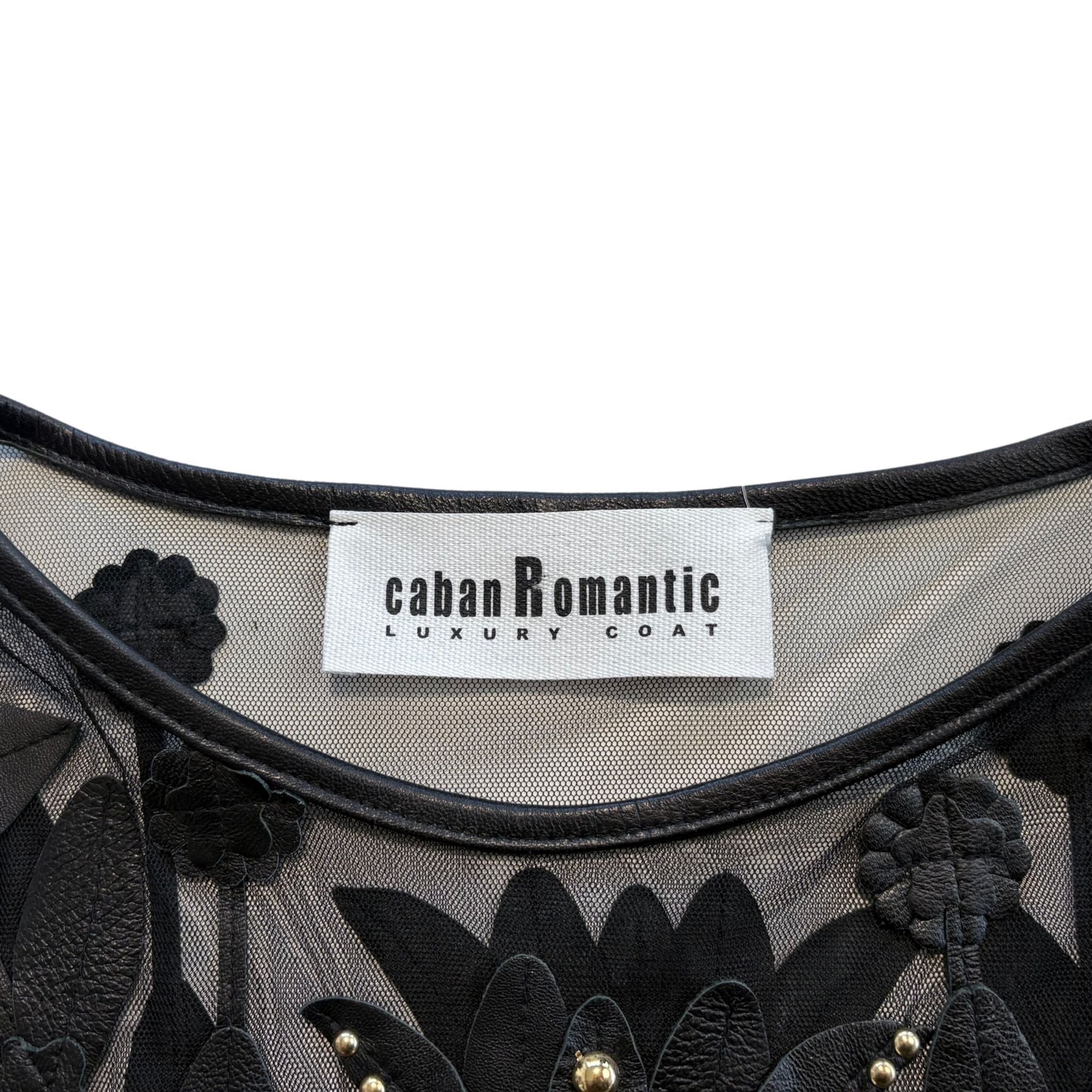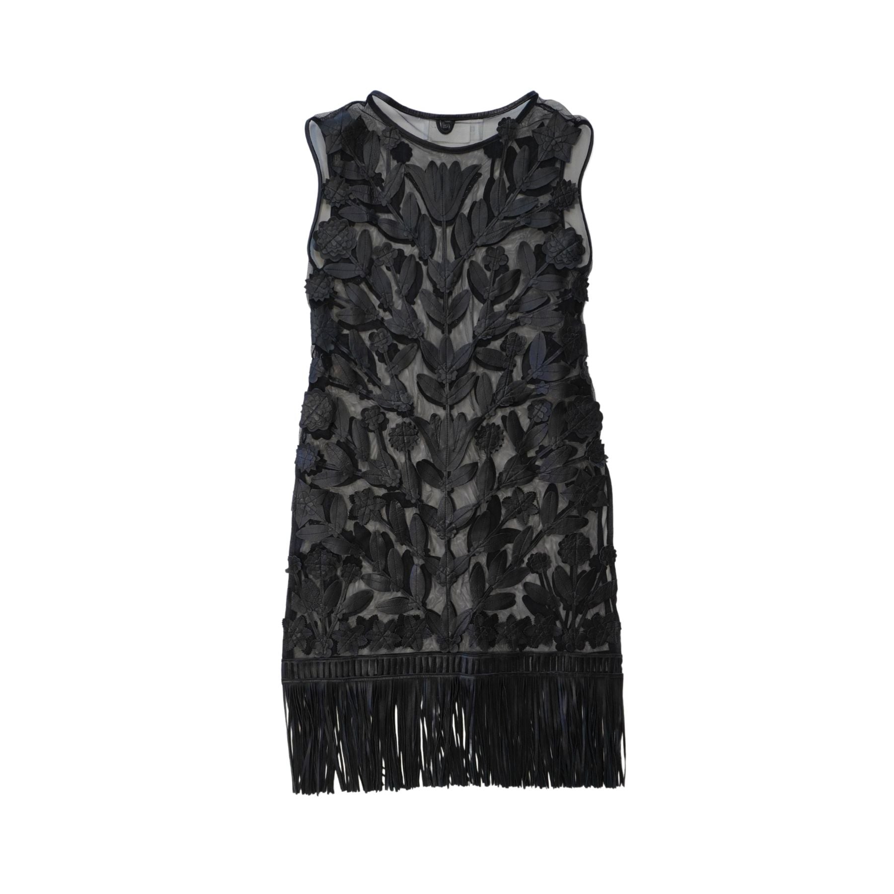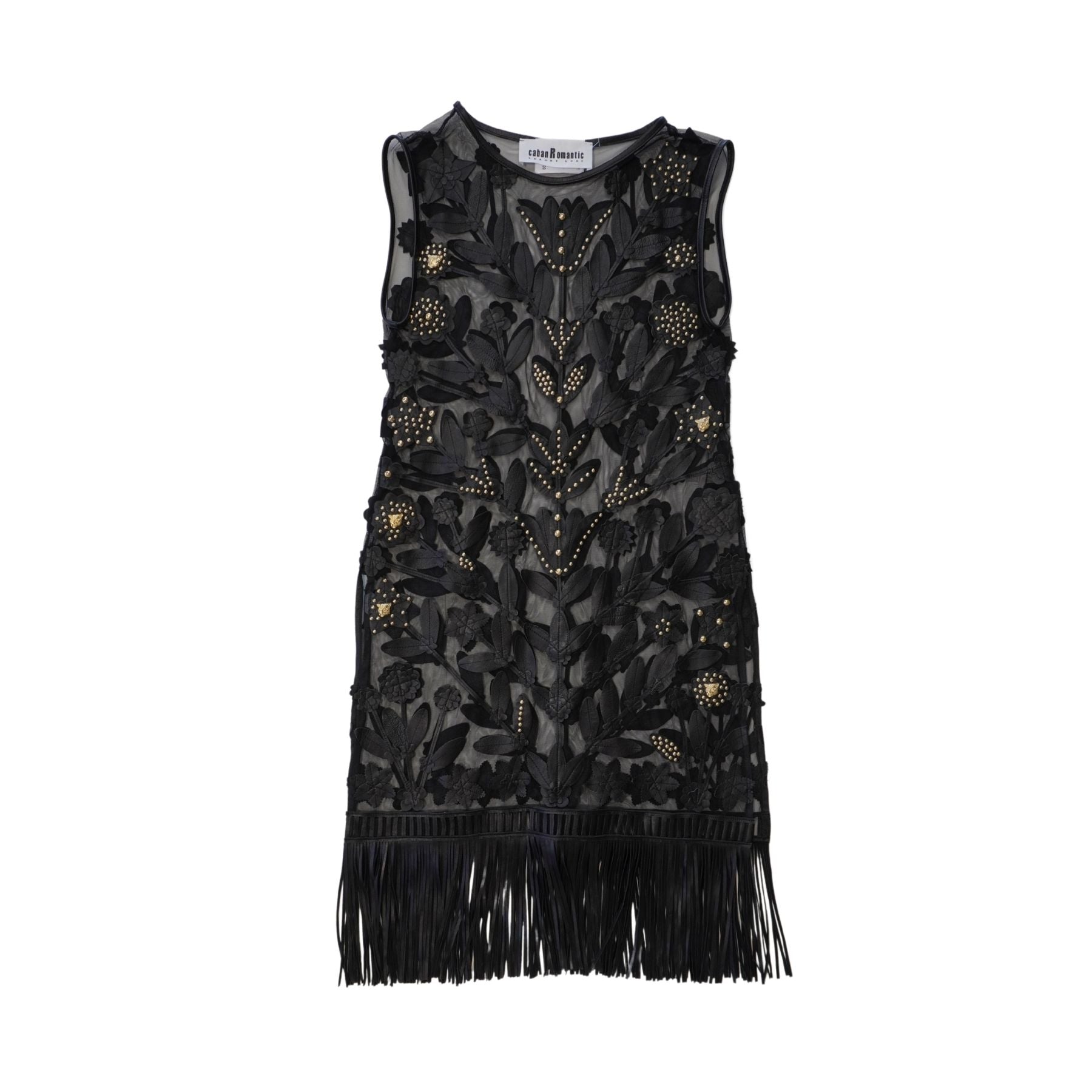 Caban Romantic shift dress in black mesh with an all-over leather floral design, gold studding throughout, gold jaguar head studs, and a fringe trim.