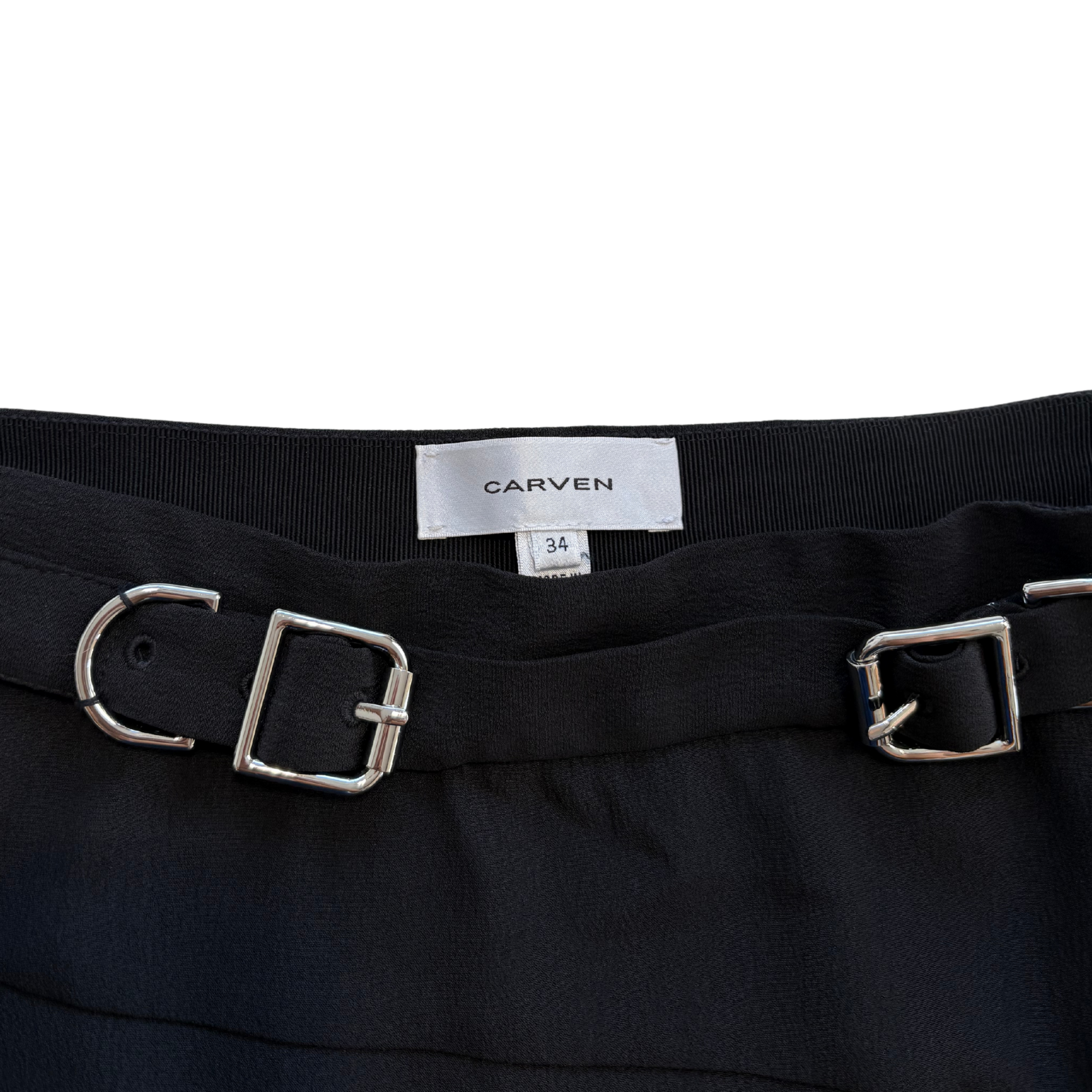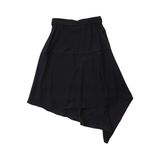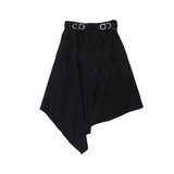 Carven high-waisted black crepe skirt with panel construction and an asymmetrical handkerchief hem. Features a built in belt with two silver buckles.